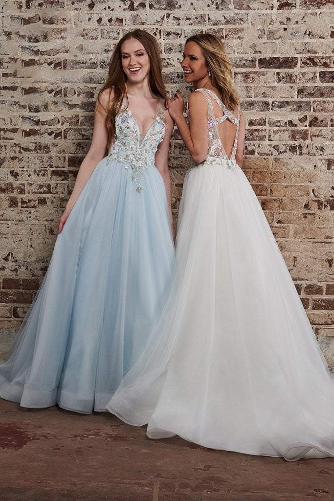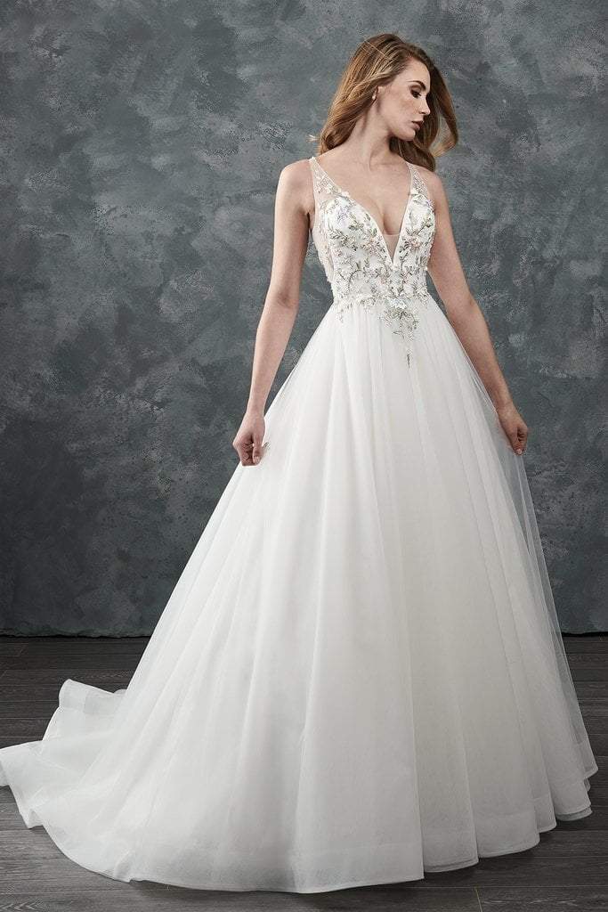 You're certain to capture the hearts and attention of everyone at your wedding when you walk down the aisle wearing this ultra-romantic Rachel Allan Bridal M645 wedding gown. This elegant Tulle and satin gown feature a sleeveless frame, deep cut V-neckline with modesty sheer inset at the center and a sheer V-shaped open back with crisscrossed straps. Dainty floral embroidery applique elegantly adorned the fitted bodice and the back of the dress. The waist is cinched as it reveals fine gathers of tulle that blooms into a majestic full A-line skirt. This beautiful ensemble finishes at floor length with horsehair hem and pulled back sweep train. Be dashing in this trendy gown from Rachel Allan, ideal for the bride who wants to exude classic sophistication while living out her modern-day fairytale.