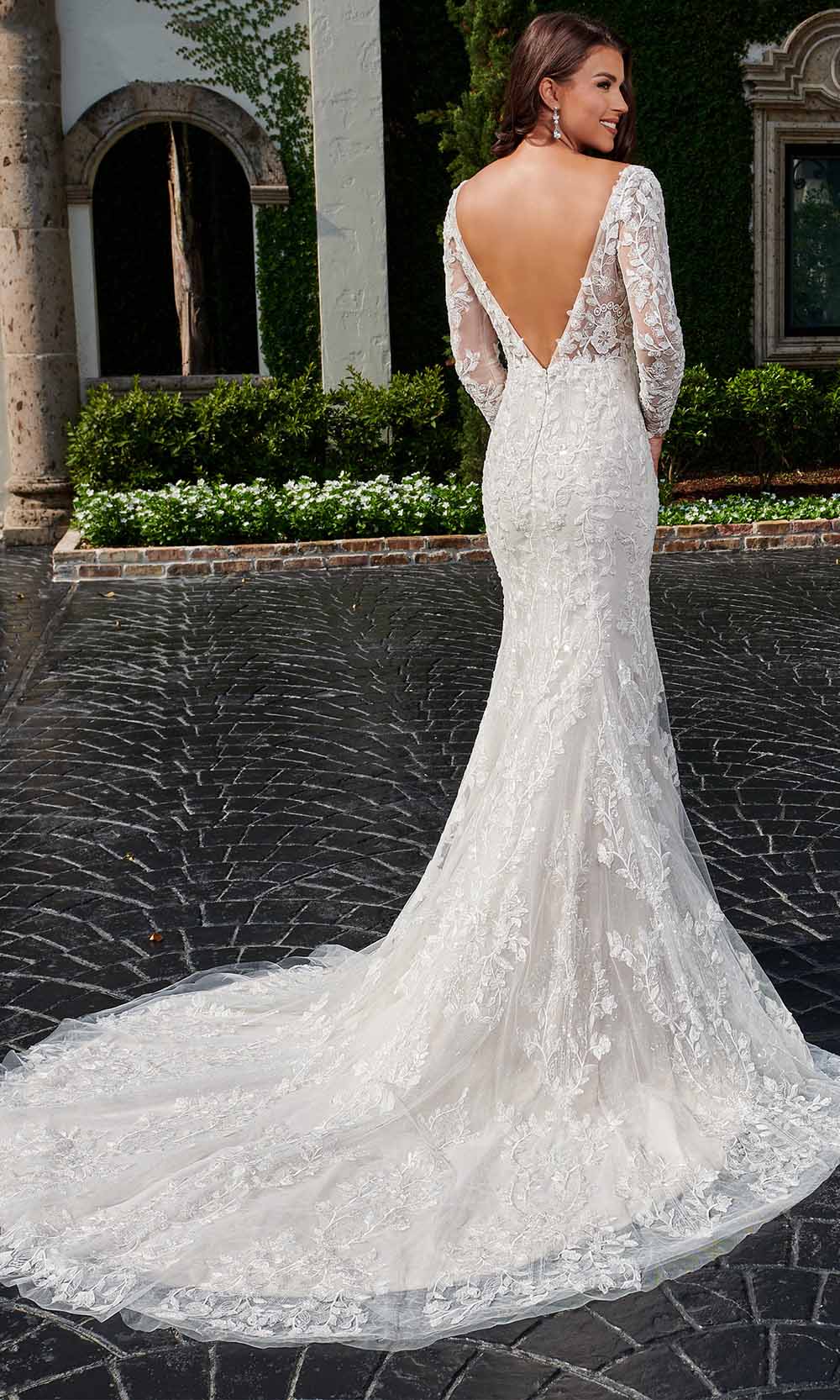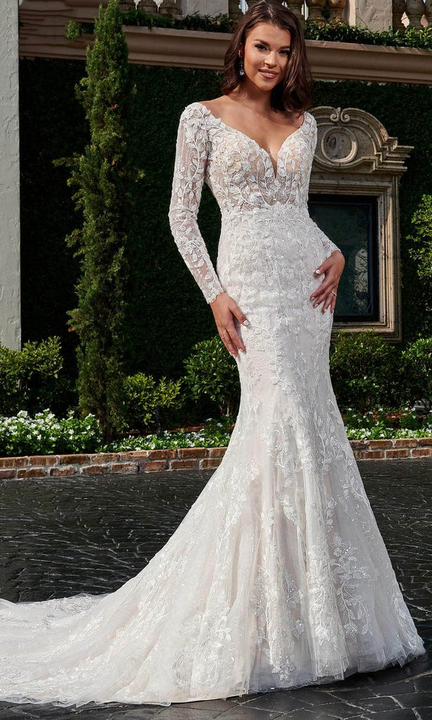 Combine allure, romance, and timeless beauty on your wedding day in this Rachel Allan Bridal RB3162 creation. Adorned with lace appliques and sequins in a breathtaking foliage motif, this exquisite bridal gown parade a plunging v-neckline and overlaid with an illusion inset. Crafted with embroidered details along the bodice and the semi-sheer v-open back with a zipper closure, this stunner comes with a detachable lining and long embellished sleeves. This gown features a stunning trumpet skirt that gracefully accentuates the curves, flowing into a regal chapel train. Every eye will be drawn to her radiant beauty and captivating presence in this Rachel Allan Bridal RB3162 masterpiece. Model is wearing the Ivory Champagne color.