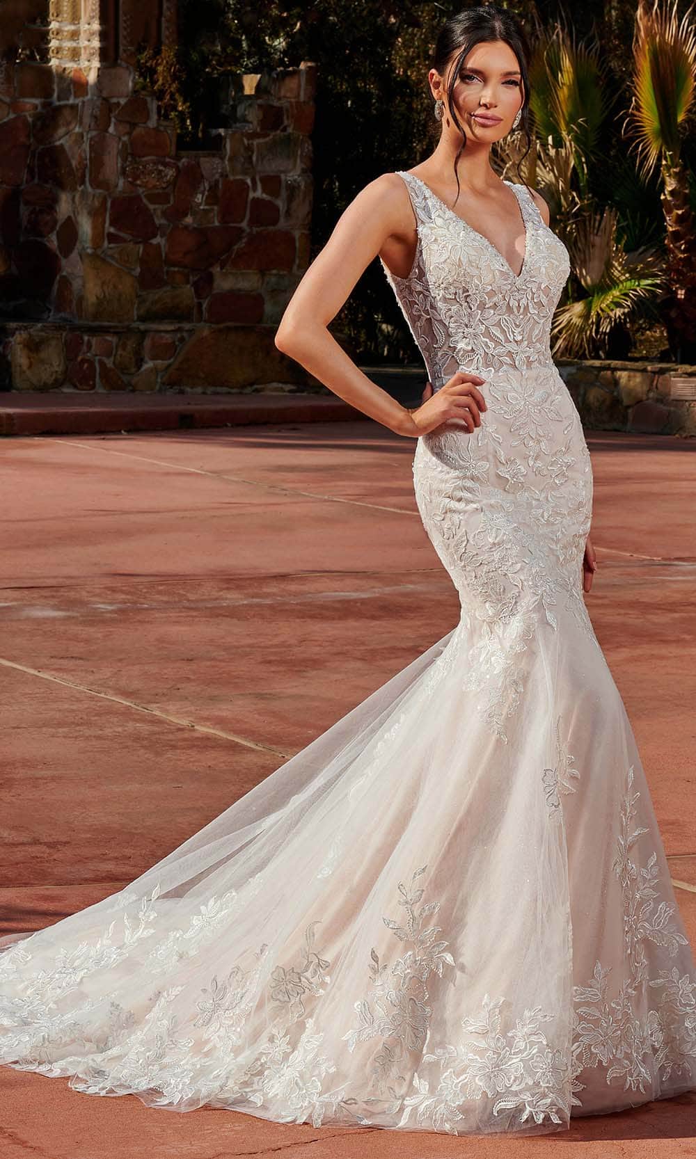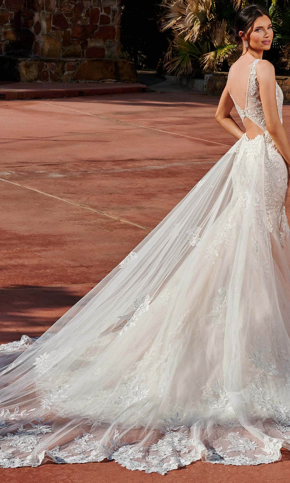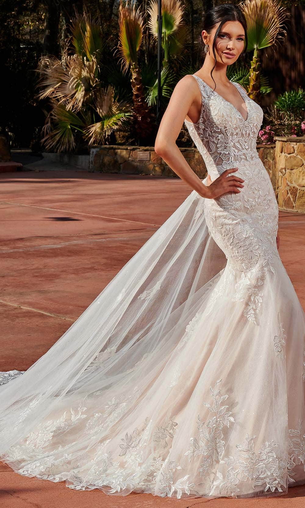 Resonate a sophisticated style on your wedding day when you don this spectacular Rachel Allan RB3168 bridal creation. Ornamented with delicate lace details rendered in lovely florals, this timeless beauty starts off with a sleeveless bodice and graced with a deep v-neckline. Sprinkled with beadwork, this alluring piece also parades a keyhole cutout v-open back. Flaunting the feminine form, the lavishly applique skirt sculpts and flares into a mermaid design with a sweeping train. A detachable train adds drama to the ensemble as it trails into a chapel form with a scalloped hem. Make a dazzling sight to behold when you walk down the aisle in this Rachel Allan RB3168 bridal masterpiece. Model is wearing the Ivory Champagne color.