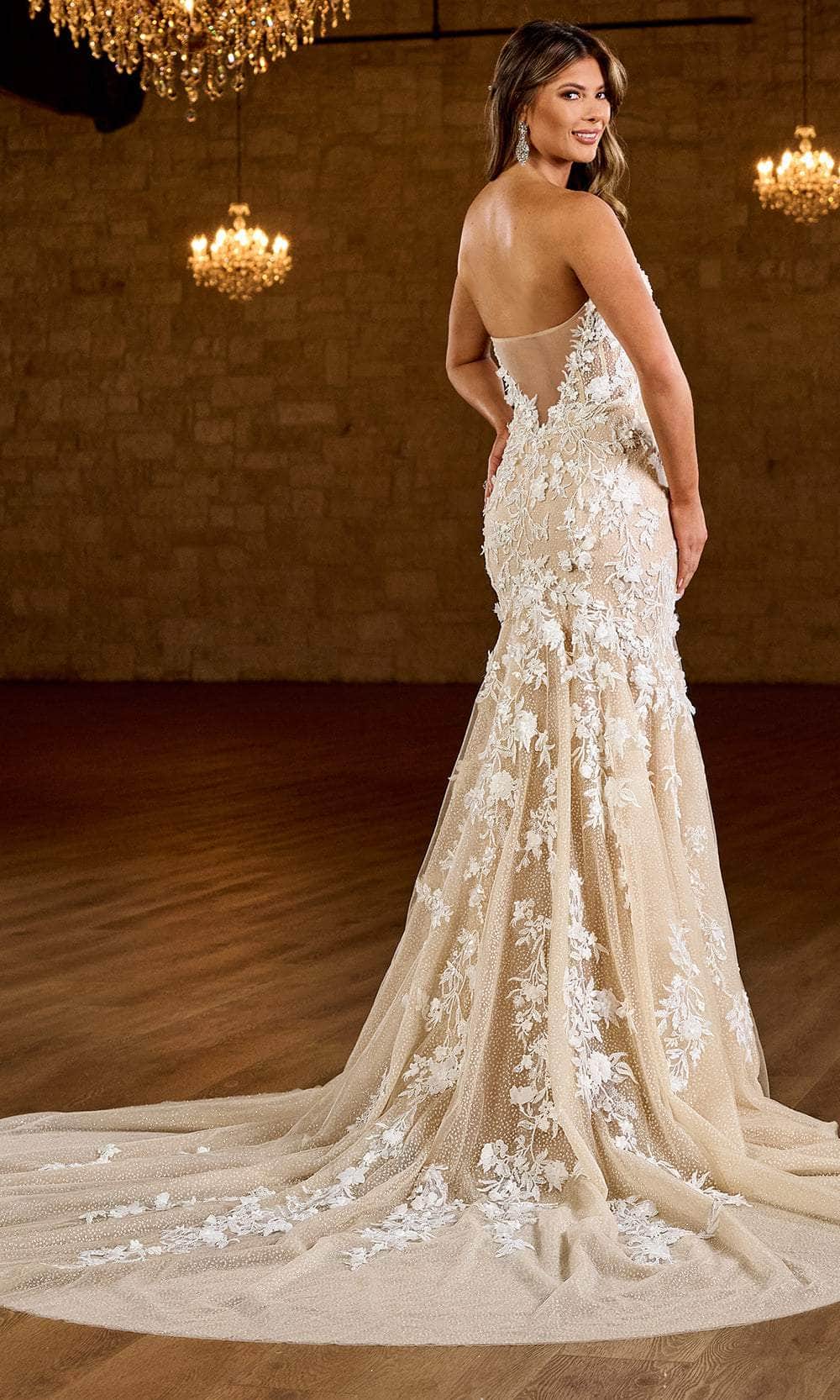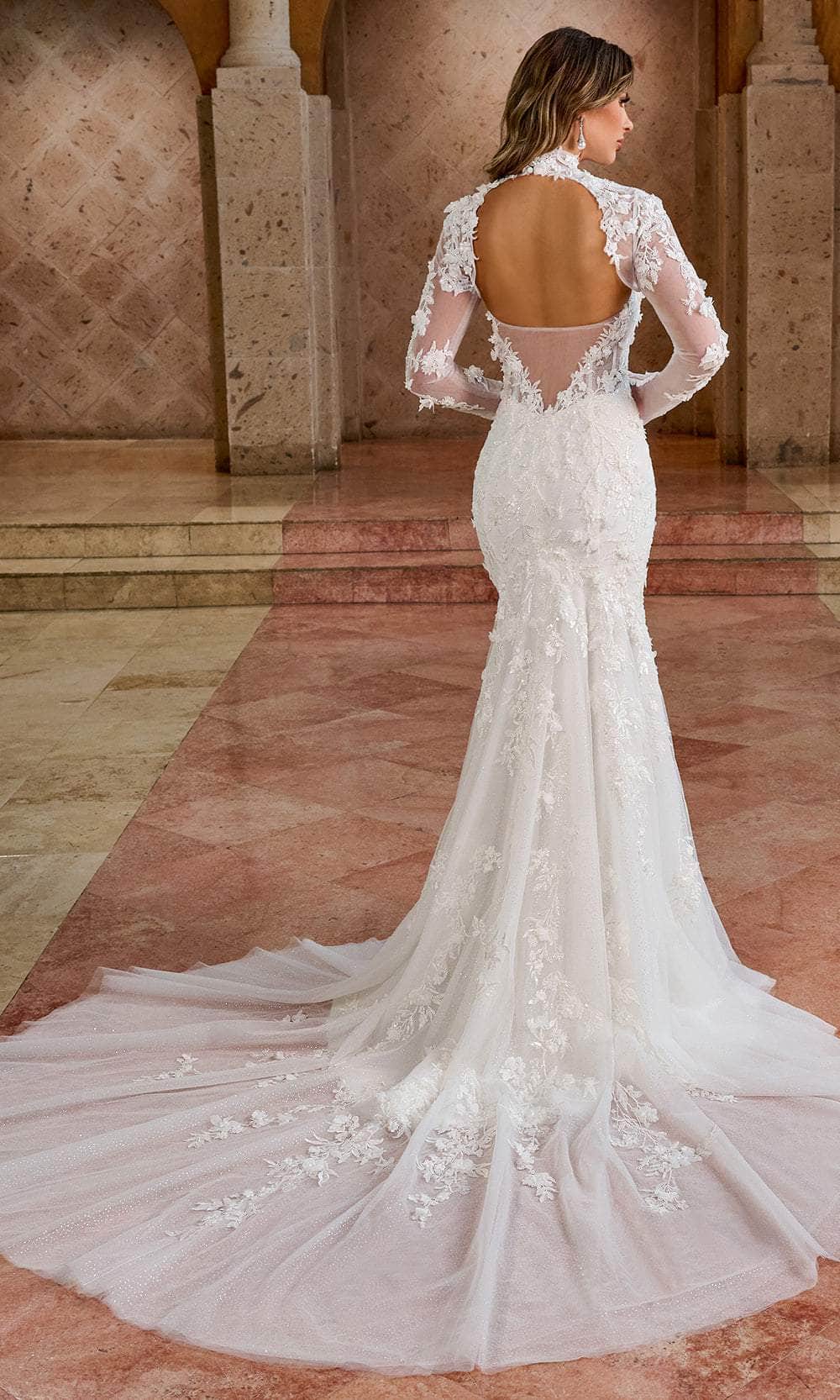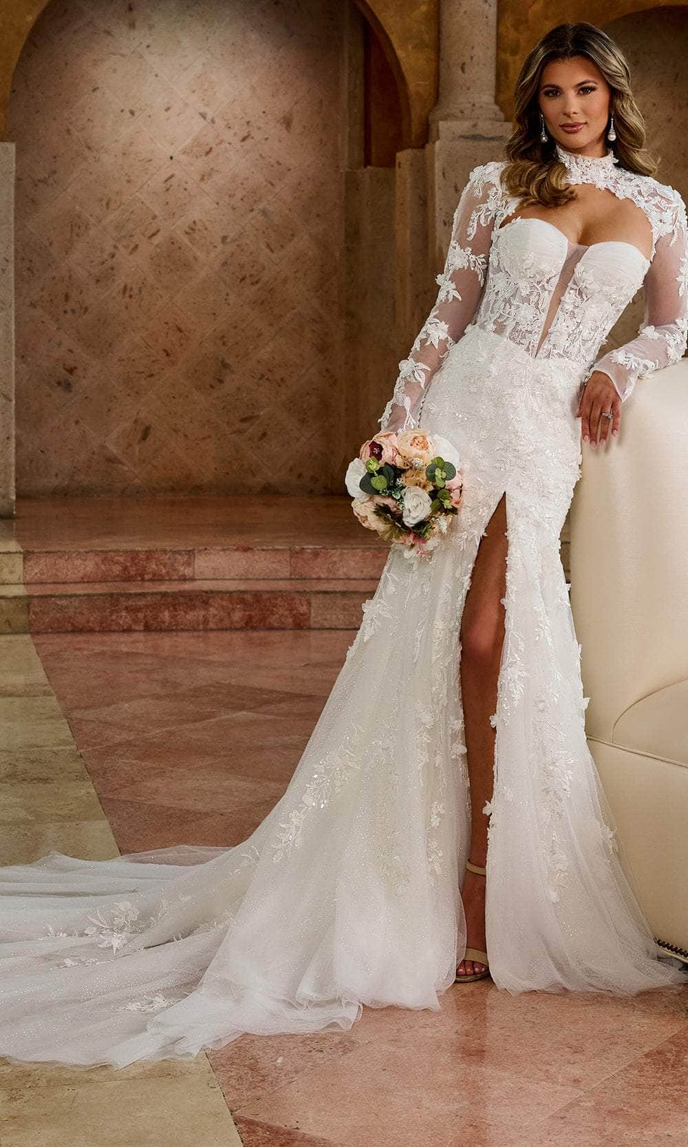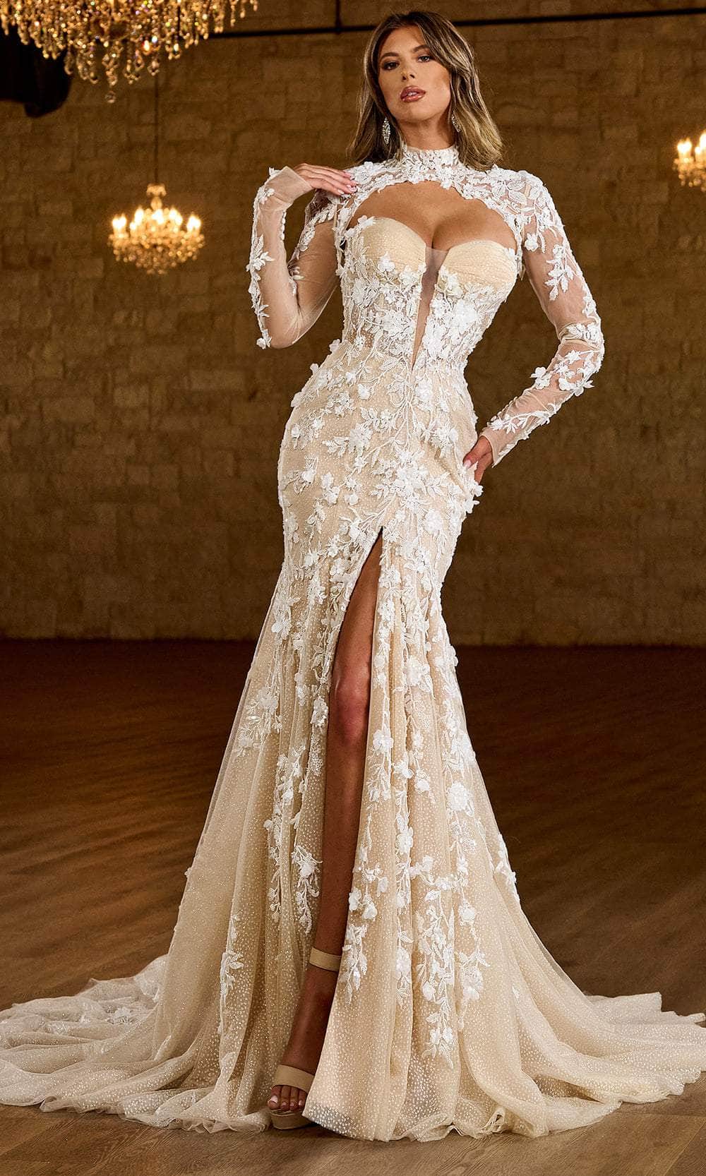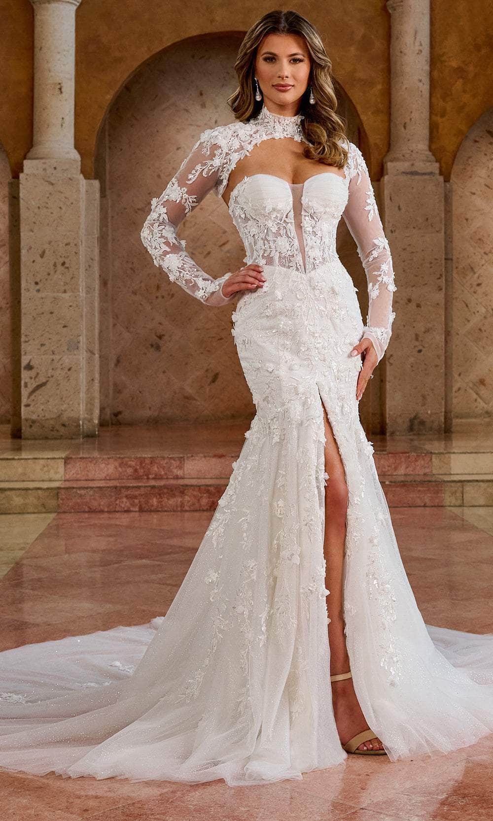 Embody bold elegance in this Rachel Allan RB5065, with its striking silhouette and detailed floral lace overlay. The gown features a daring high slit and a fitted bodice with a deep sweetheart neckline beneath sheer lace, creating a captivating illusion effect. Completing the look are long, sheer detachable sleeves and an expansive train, perfect for making a breathtaking entrance. This Rachel Allan RB5065 is an ideal choice for any bride seeking to make a bold statement on her special day. Models are wearing Ivory/Champagne/Nude and Ivory colors.