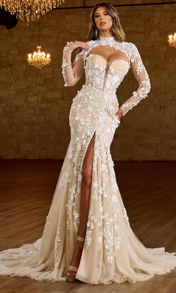 | Details: | Floral Lace Overlay, Long Sheer Detachable Sleeves, Sheer Insert, Mid-Open Back, Illusion, Silt, Train |