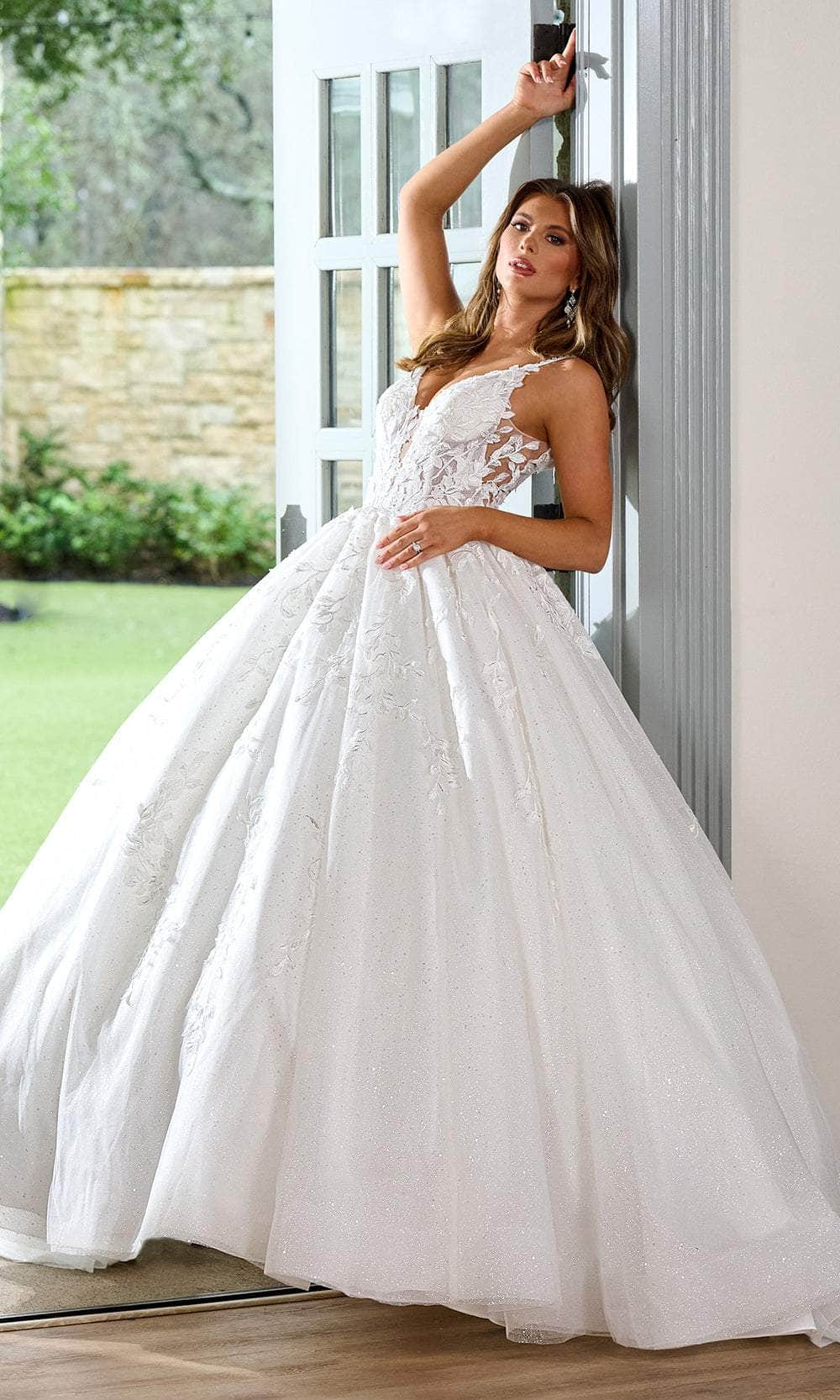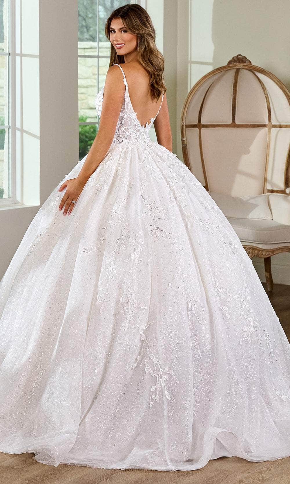 Prepare to make a grand entrance in this Rachel Allan RB6151 masterpiece. The 3D floral appliques, beadings, and embroidery add timeless charm to this dreamy glitter tulle gown. It exhibits a sleeveless design crowned by the plunging v-neckline, illusion side waist, and spaghetti straps. The low V-shaped cut in the back reveals a peek of your skin and closes by the zipper closure for easy wearing. Falling at a full-length hem and sweeping train, the skirt is detailed with pleats and forms a ballgown silhouette. On your wedding day, this Rachel Allan RB6151 gown will make you feel like truly a princess. Model is wearing Ivory Nude color.