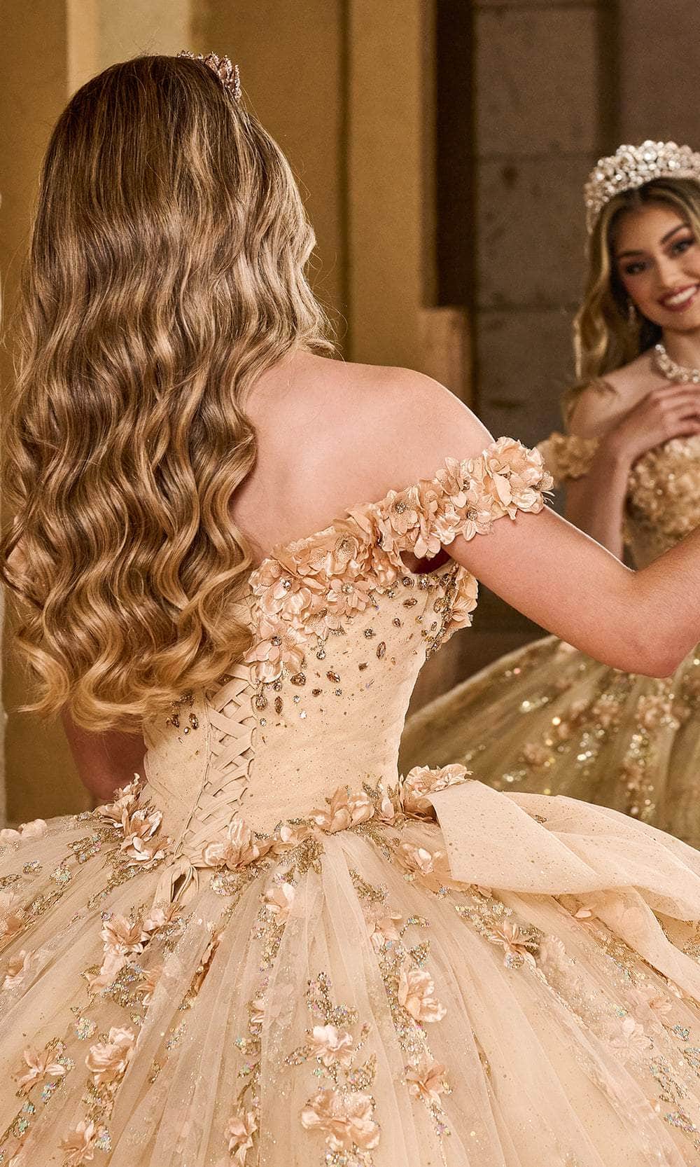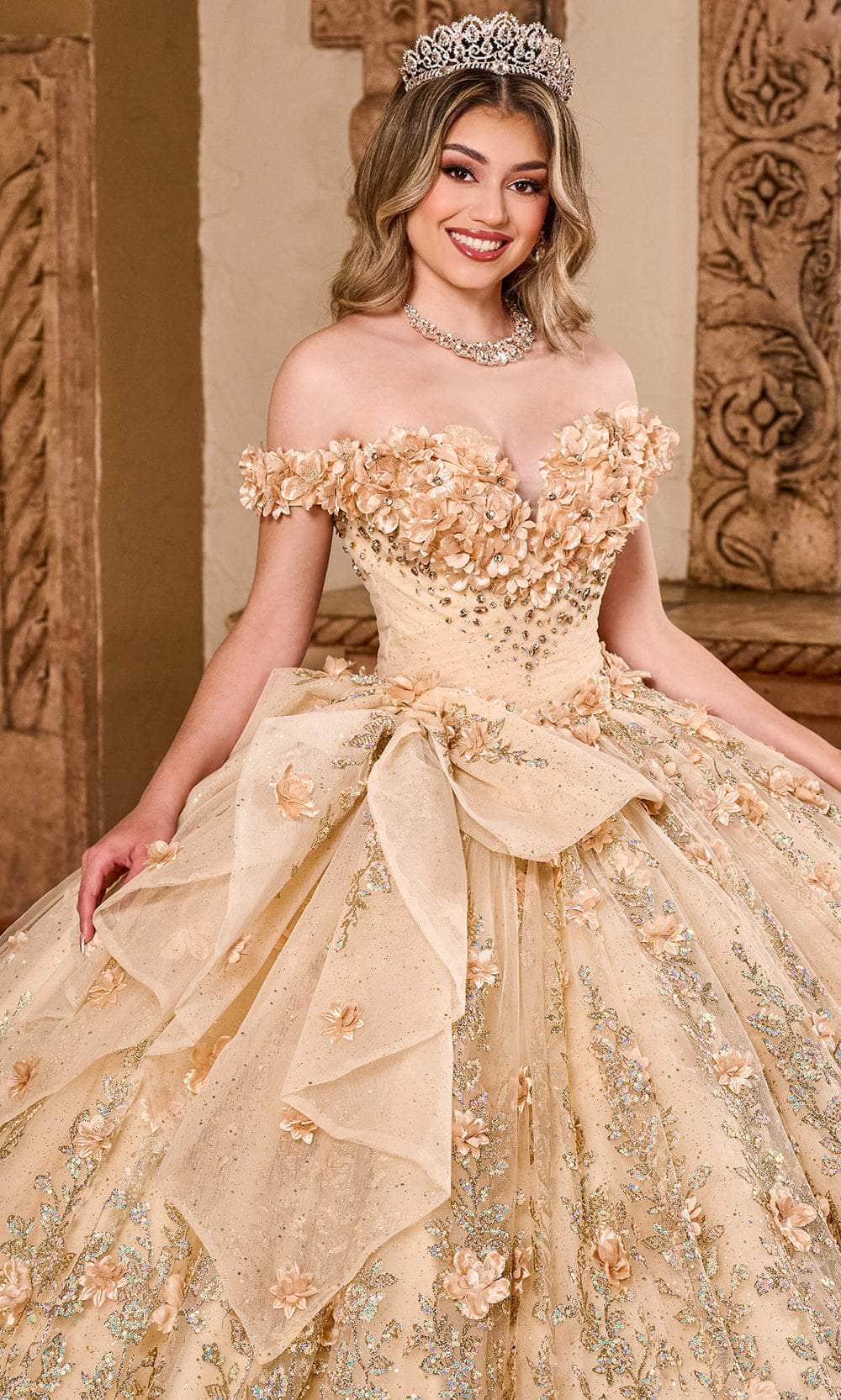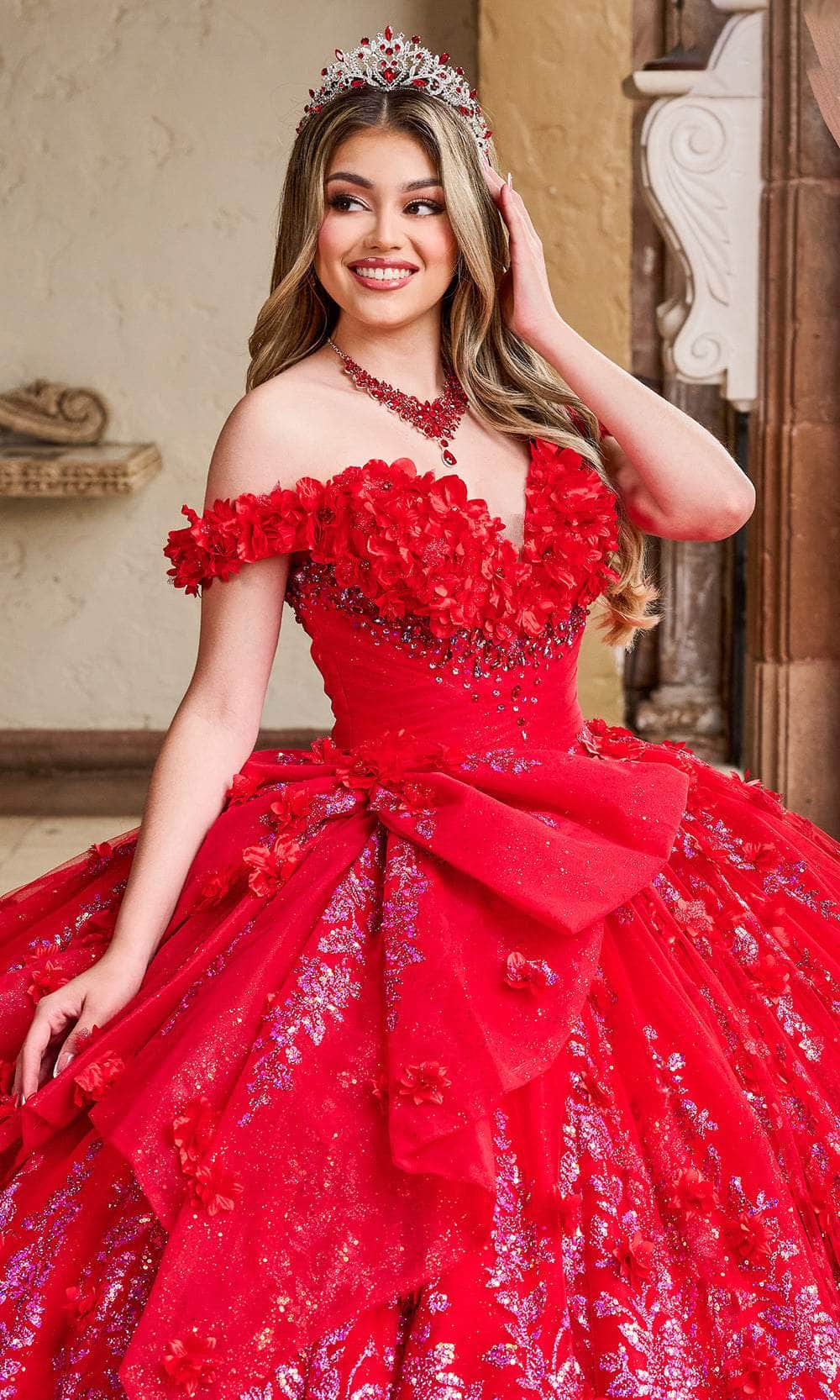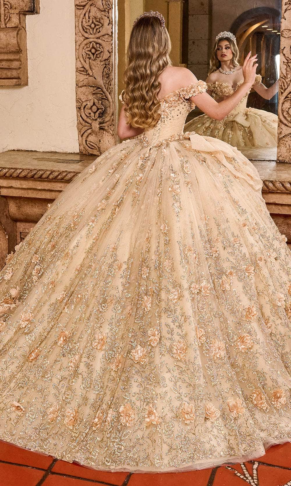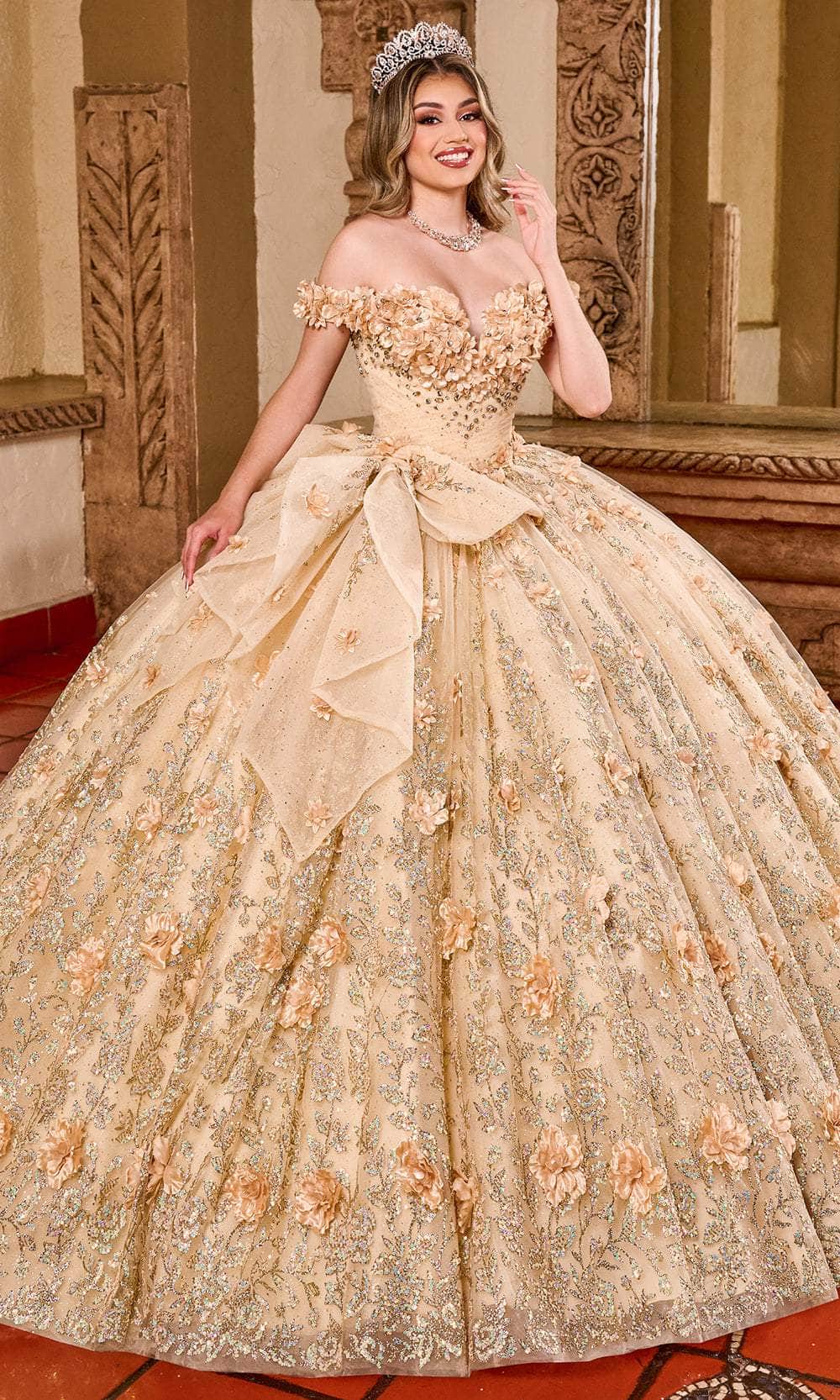 Embrace the princess within you in the Rachel Allan RQ1141 masterpiece. Sparkling beaded and sequin with 3D floral appliques enhance the gown feminine beauty. Shown are the captivating sweetheart off-shoulder neckline and cap sleeves. Flaunt your skin in the back with its daring mid-open design and it has an adjustable lace-up tie closure to guarantee a snug fit. The bow accent on the side waist adds a playful element. Completed in a voluminous ballgown skirt with gathered details and spills into a grandiose sweep train. This Rachel Allan RQ1141 long gown steals the spotlight for the evening. Models are wearing Champagne Gold, and Red Fuchsia colors.