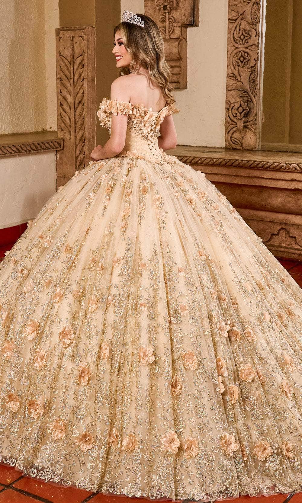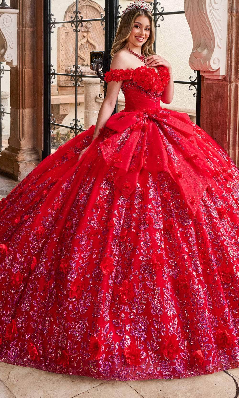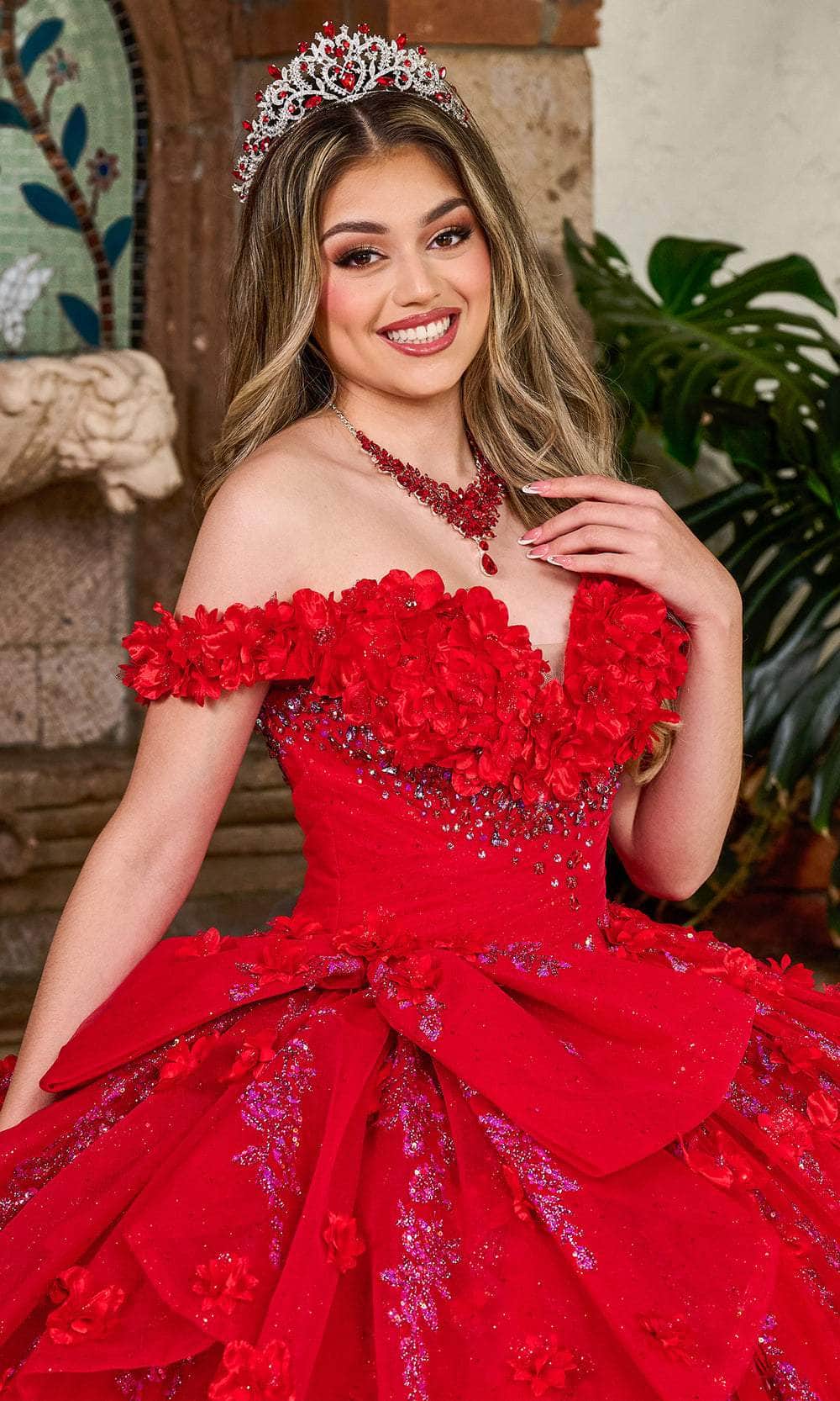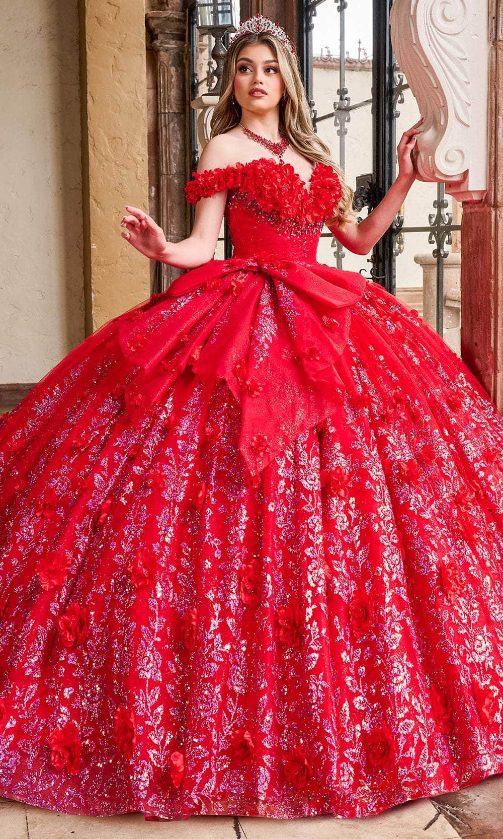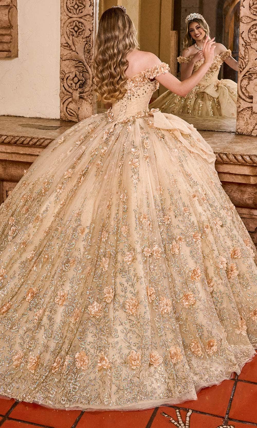 Embrace the princess within you in the Rachel Allan RQ1141 masterpiece. Sparkling beaded and sequin with 3D floral appliques enhance the gown feminine beauty. Shown are the captivating sweetheart off-shoulder neckline and cap sleeves. Flaunt your skin in the back with its daring mid-open design and it has an adjustable lace-up tie closure to guarantee a snug fit. The bow accent on the side waist adds a playful element. Completed in a voluminous ballgown skirt with gathered details and spills into a grandiose sweep train. This Rachel Allan RQ1141 long gown steals the spotlight for the evening. Models are wearing Champagne Gold, and Red Fuchsia colors.