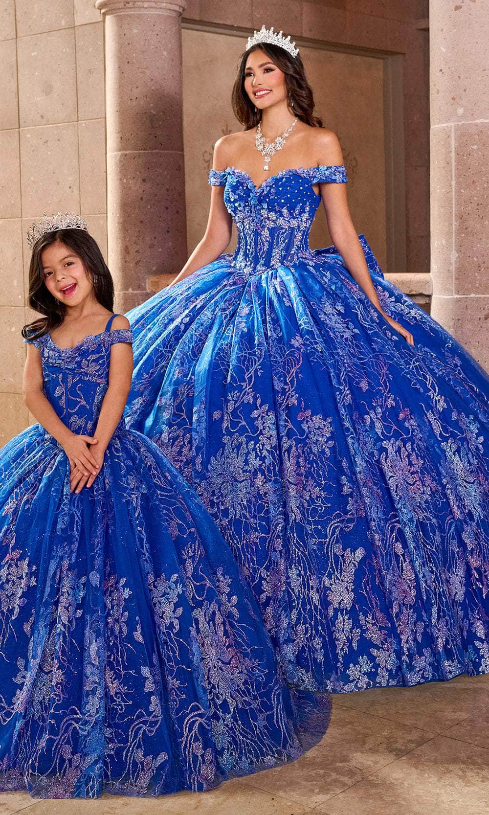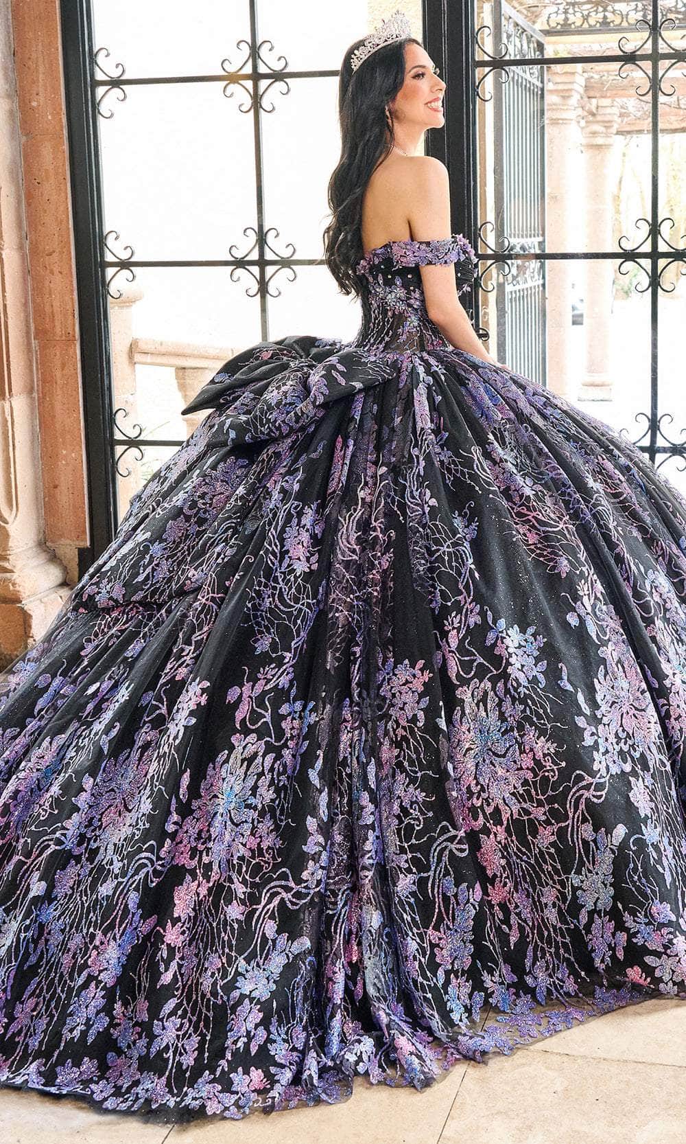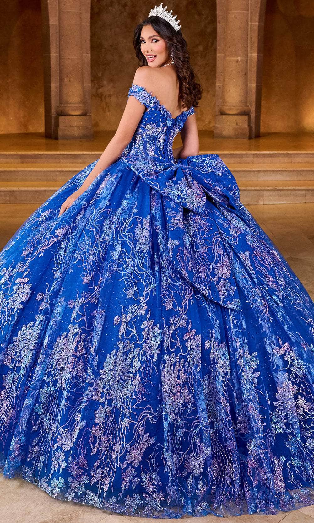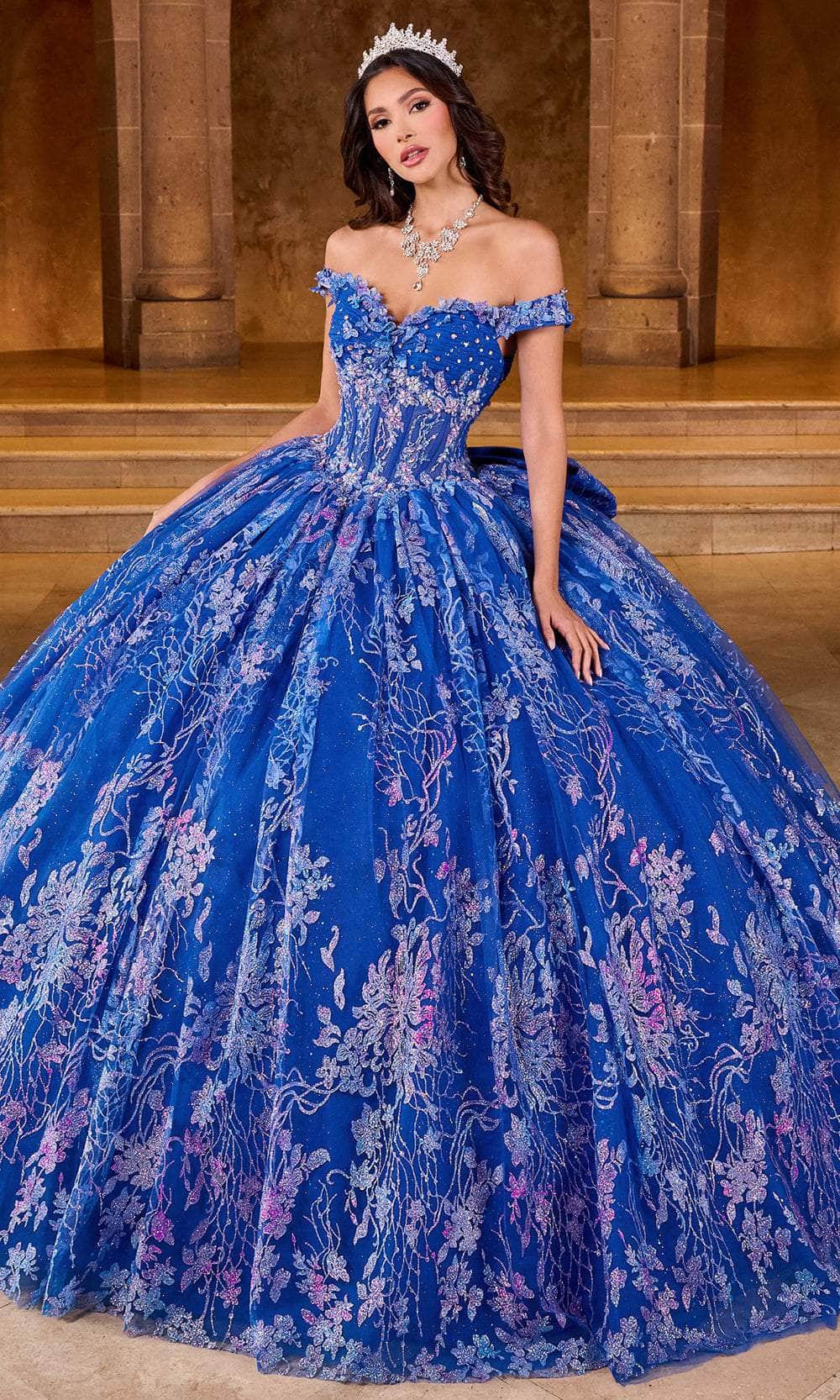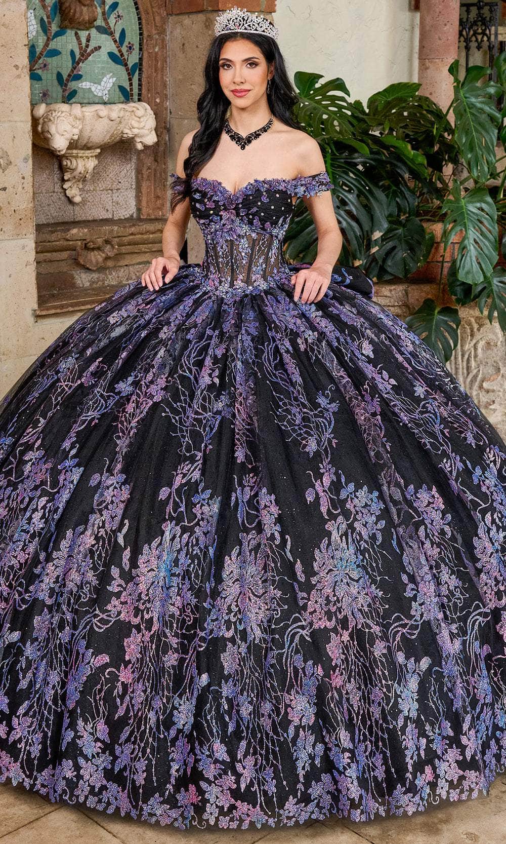 Have all eyes on you in this delightful creation from Rachel Allan RQ1146. This gown is designed for the modern princess, flaunting glamourous 3D floral appliques, glittering sequins, and beading adornment. The off-shoulder sweetheart neckline frames your face beautifully, with a stylish ruching on the bust and illusion corset bodice. Additional details include a midrise v-back with an adjustable lace-up design. The skirt voluminous ballgown silhouette creates a truly unforgettable impression and culminates in a dramatic sweep train. Radiate a timeless appeal in this Rachel Allan RQ1146 masterpiece. Models are wearing Black Multi, and Royal Multi colors.