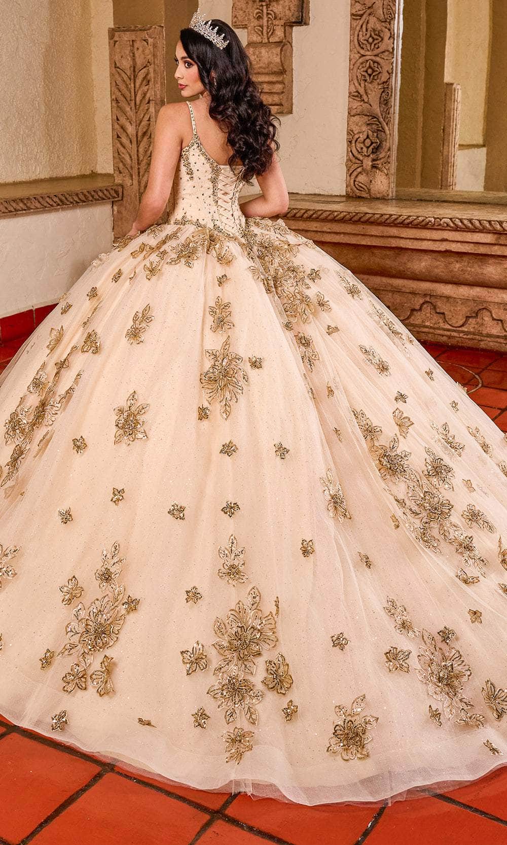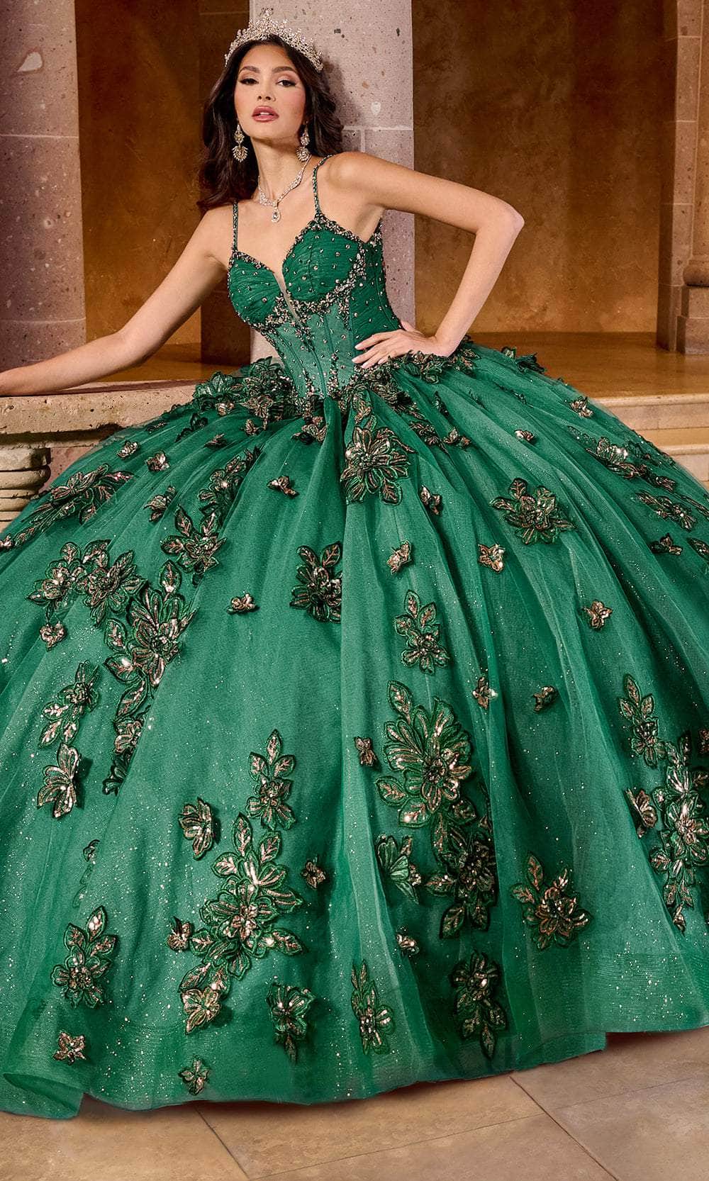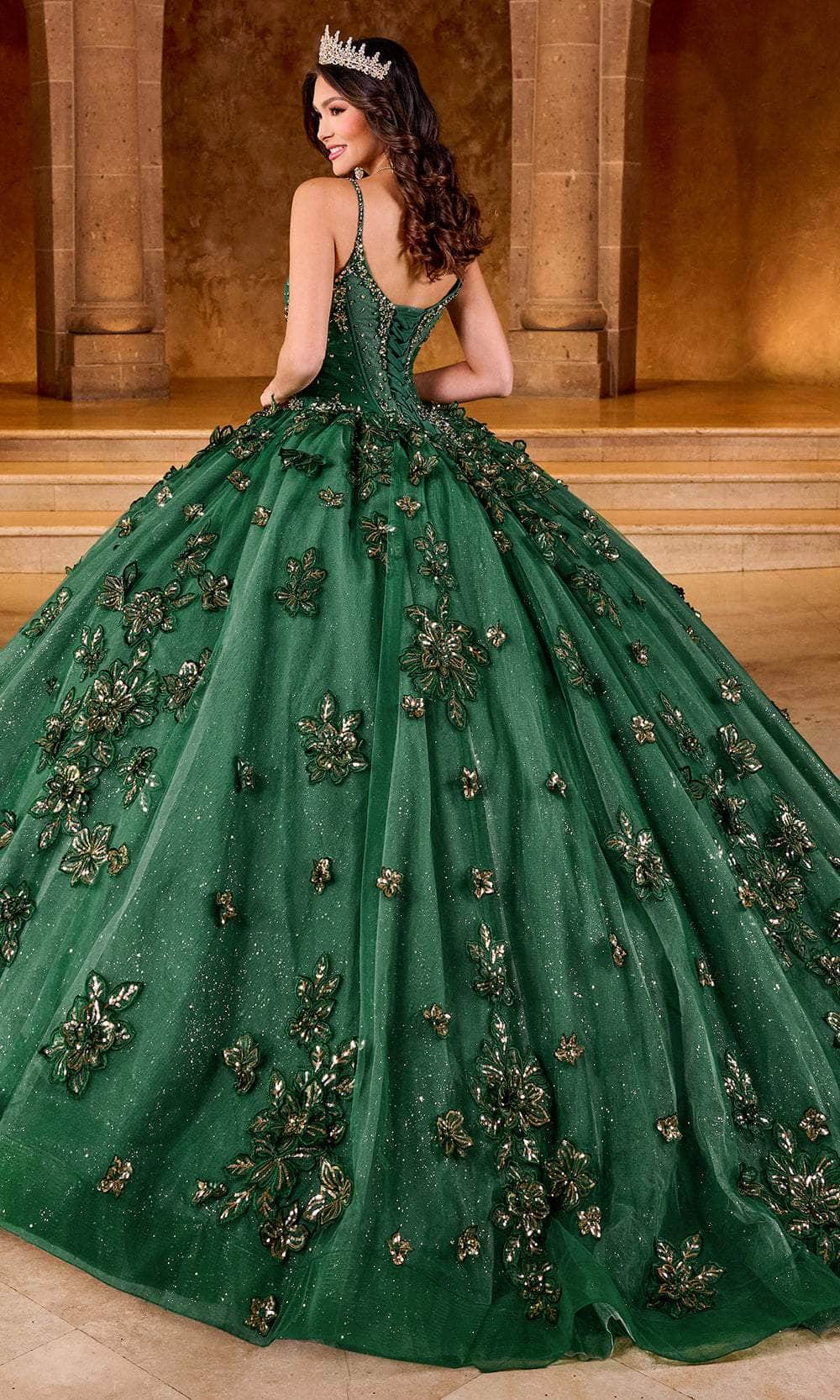 Make an impressive entrance in the Rachel Allan RQ1149 creations. Luxurious beading embellishment with embroidery and 3D floral applique, this gown will enthrall everyone who gazes upon it. The deep v-neckline and scoop back add a dash of allure, while the ruching and corset boning bodice guarantees a flattering fit. It also includes a lace-up closure for a custom fit. With a gathered Basque waist and horsehair hem, the skirt forms a ballgown silhouette flowing into the sweeping train for a regal yet ethereal presence. This Rachel Allan RQ1149 long gown is suitable for a modern-day princess. Models are wearing Champagne Rose Gold, and Emerald Gold colors.
