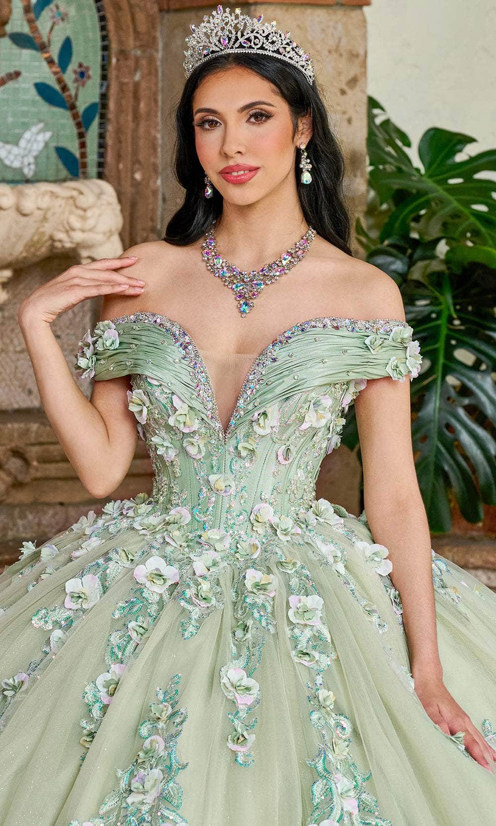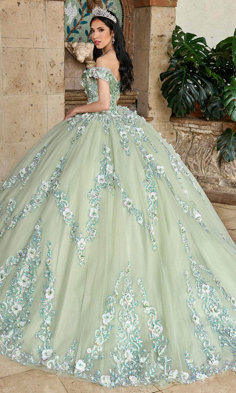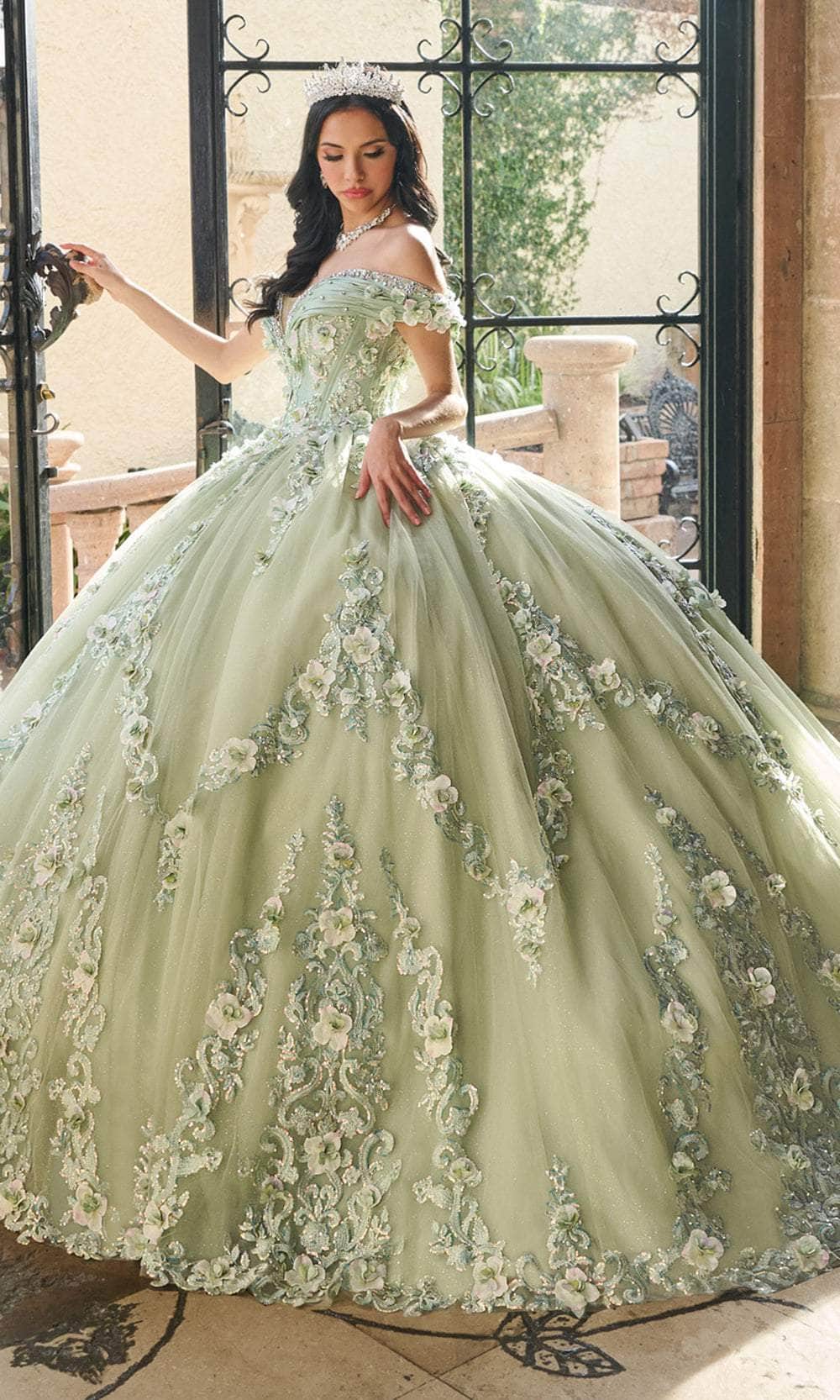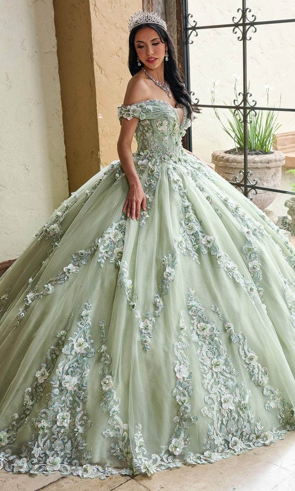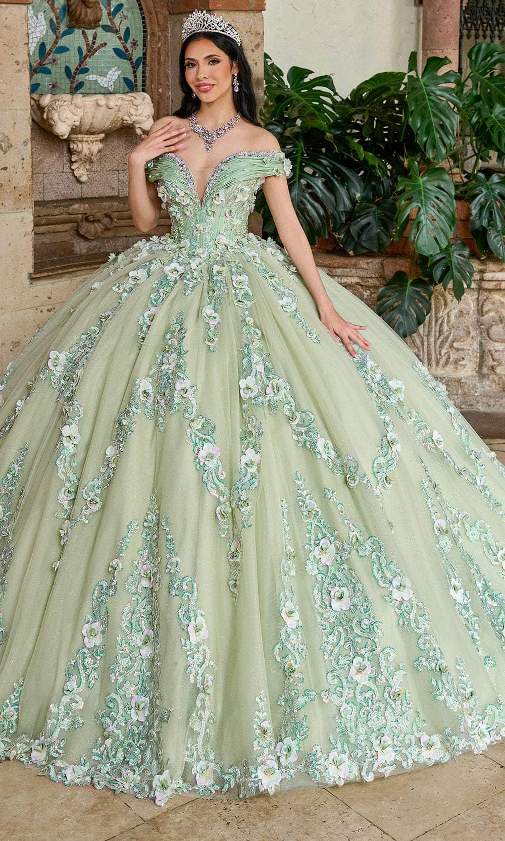 Make a grand entrance in a trendy Rachel Allan RQ2204 creation. Crafted to evoke the sensation of royalty, the gown is amazingly decorated with 3D floral appliques, glittering beads, and sequins. The fold-over ruched and beaded trim on the off-shoulder deep v-neckline is bound to turn heads. Additional highlights are the Basque waist, and mid-open lace-up back that adds a sultry touch. With a unique gathered on the Basque waist, the skirt flares out a voluminous ballgown silhouette that falls dramatically to the floor and sweeping denouement. This Rachel Allan RQ2204 masterpiece is a truly remarkable choice. Models are wearing Blush, and Sage colors.