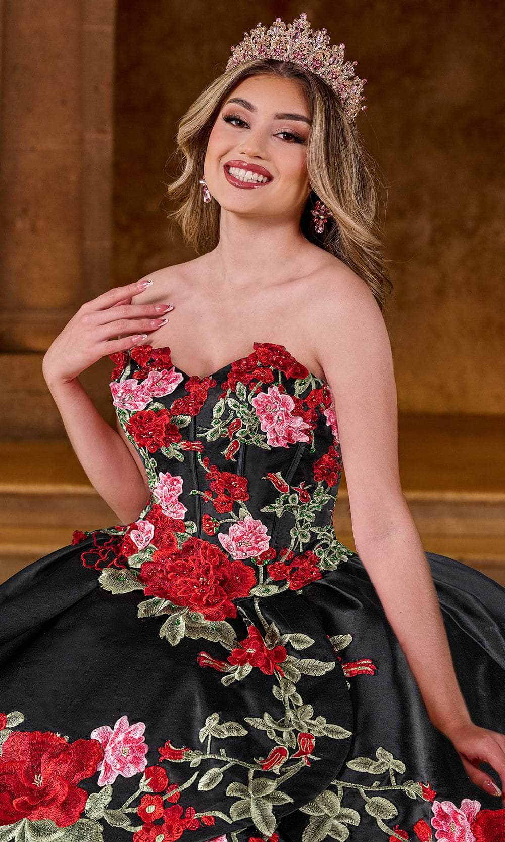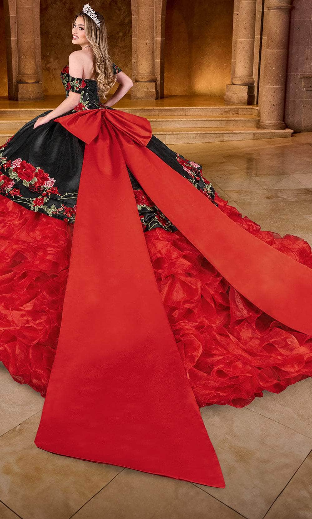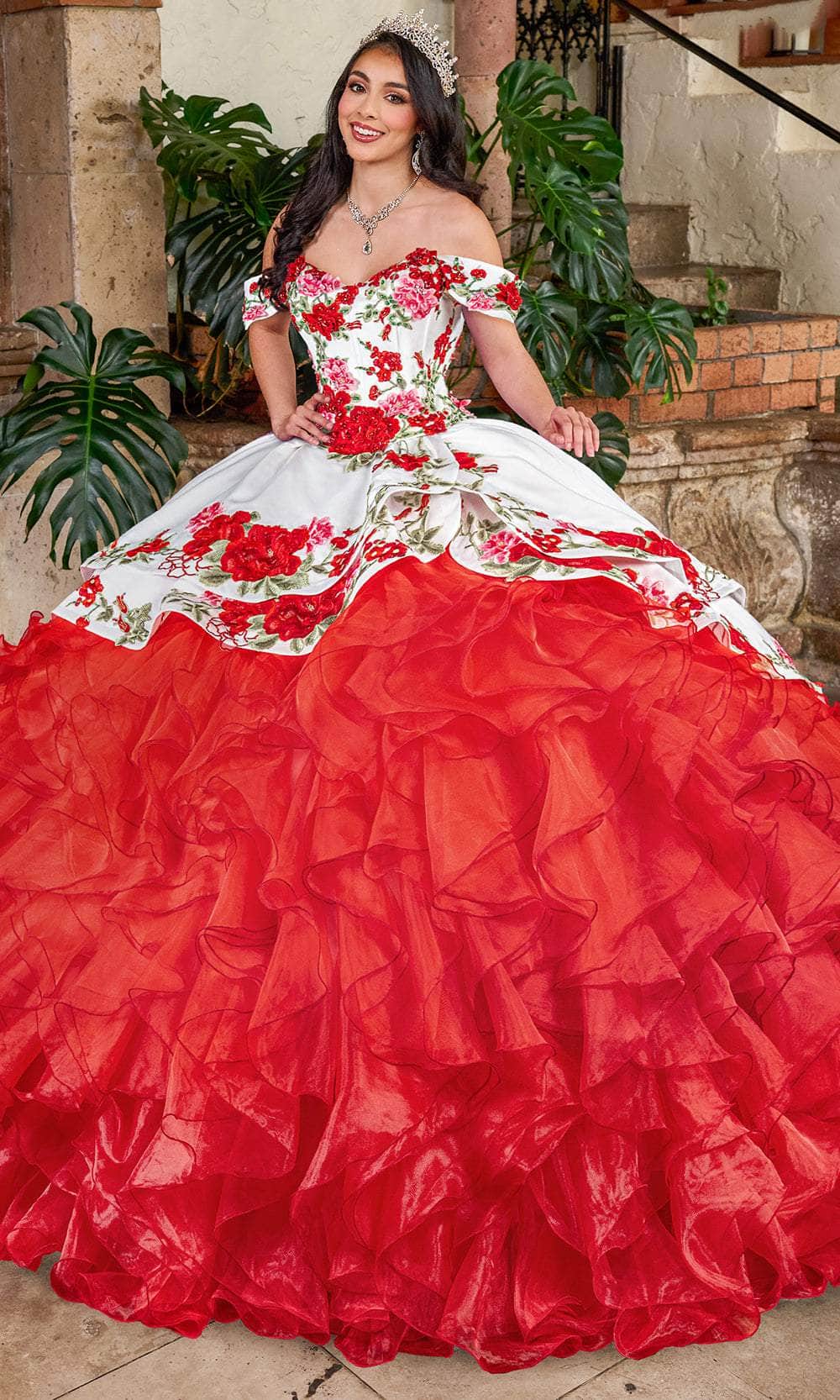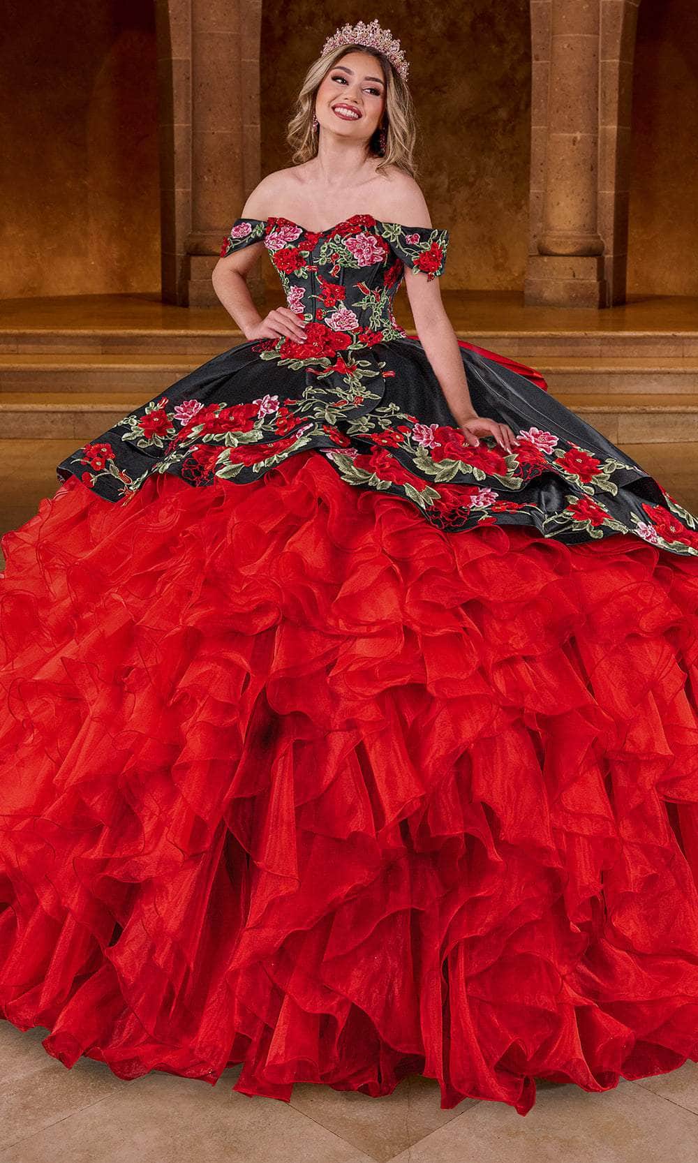 Step into the room and make everyones jaw drop with this creation from Rachel Allan RQ5007. This gown features a strapless design, a sweetheart neckline, and a corset boning bodice that highlights your curves. The vibrant multi-colored floral embroidery and beading decorate it, adding a pop of color and sparkle. In the alluring midrise back, it highlights the lace-up closure and an oversized bow with a tail. The skirt flourishes a voluminous ballgown silhouette detailed in draped layers of satin and organza ruffled tiers, giving it a perfect amount of dimension and drama. You are a princess for an evening in this beautiful Rachel Allan RQ5007 gown. Models are wearing Black Red, White Red, and White Pink colors.