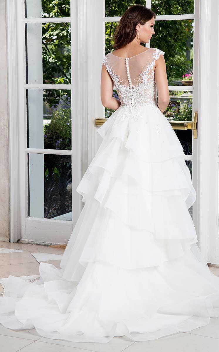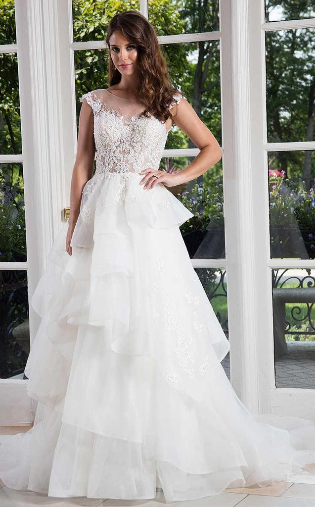 | Details: | Cap sleeves, Illusion neckline, Sheer yoke and back, Ruffles, Floral lace applique, Hidden zipper and exposed button closure |