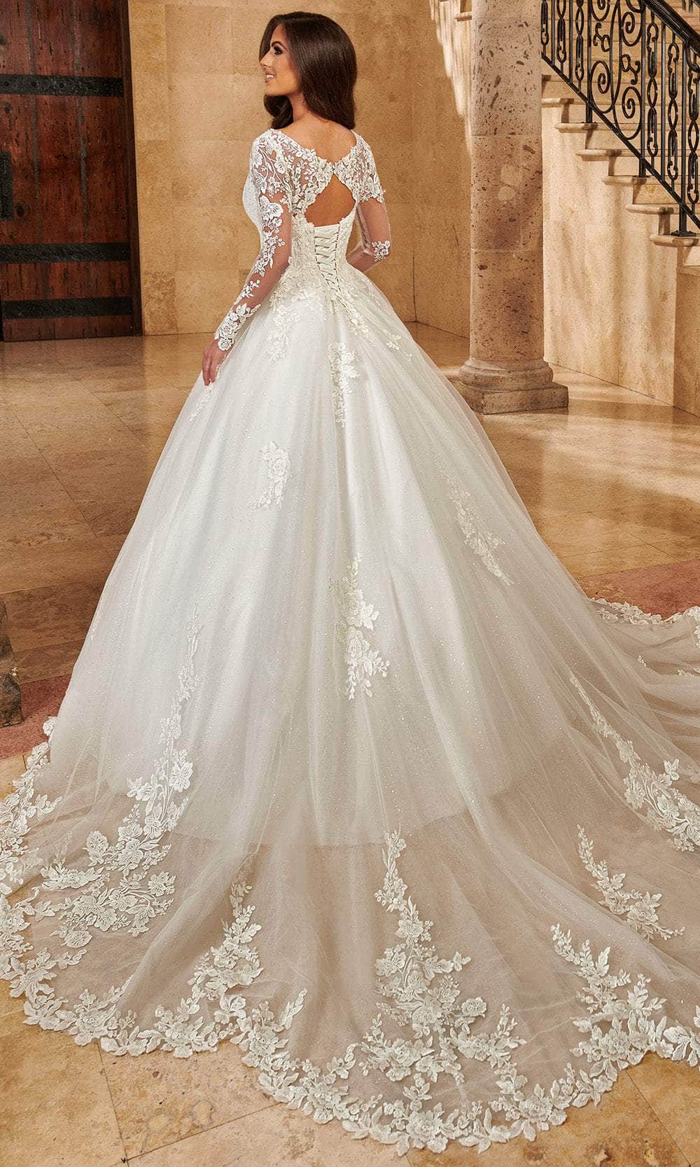 | Details: | Sheer Long Sleeves, Keyhole Back With Lace-Up Closure, Scallop Cathedral Train, Lace Appliqued, Beaded |
