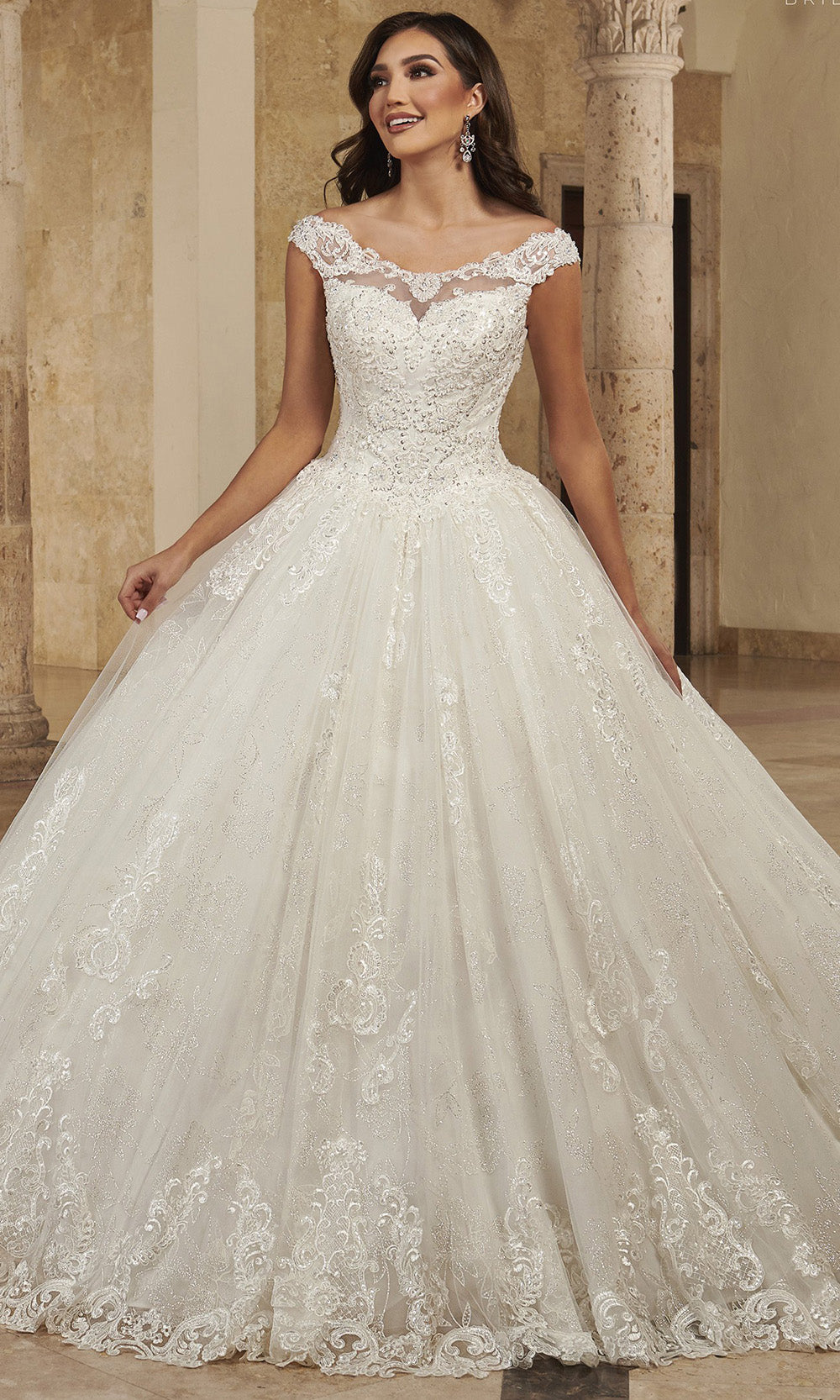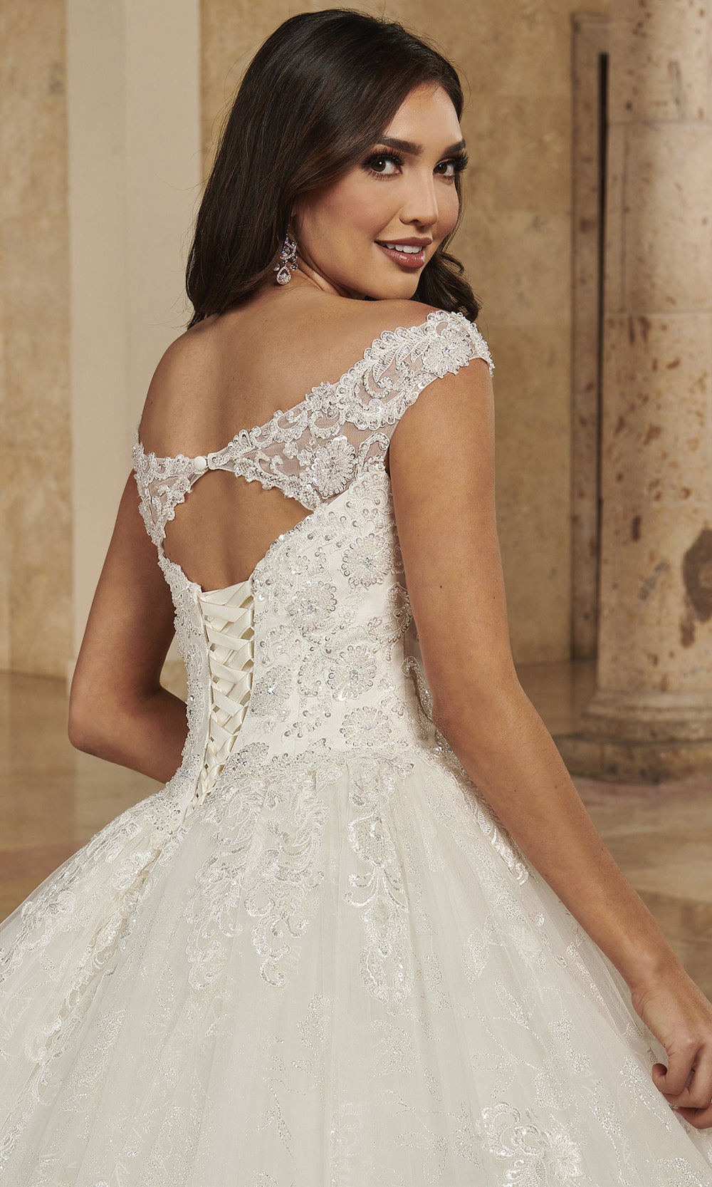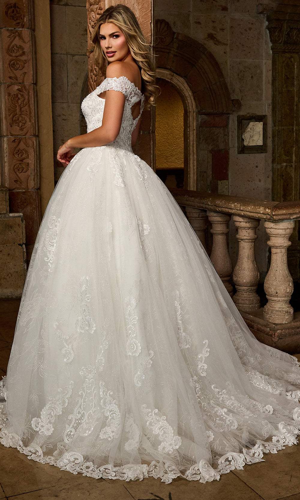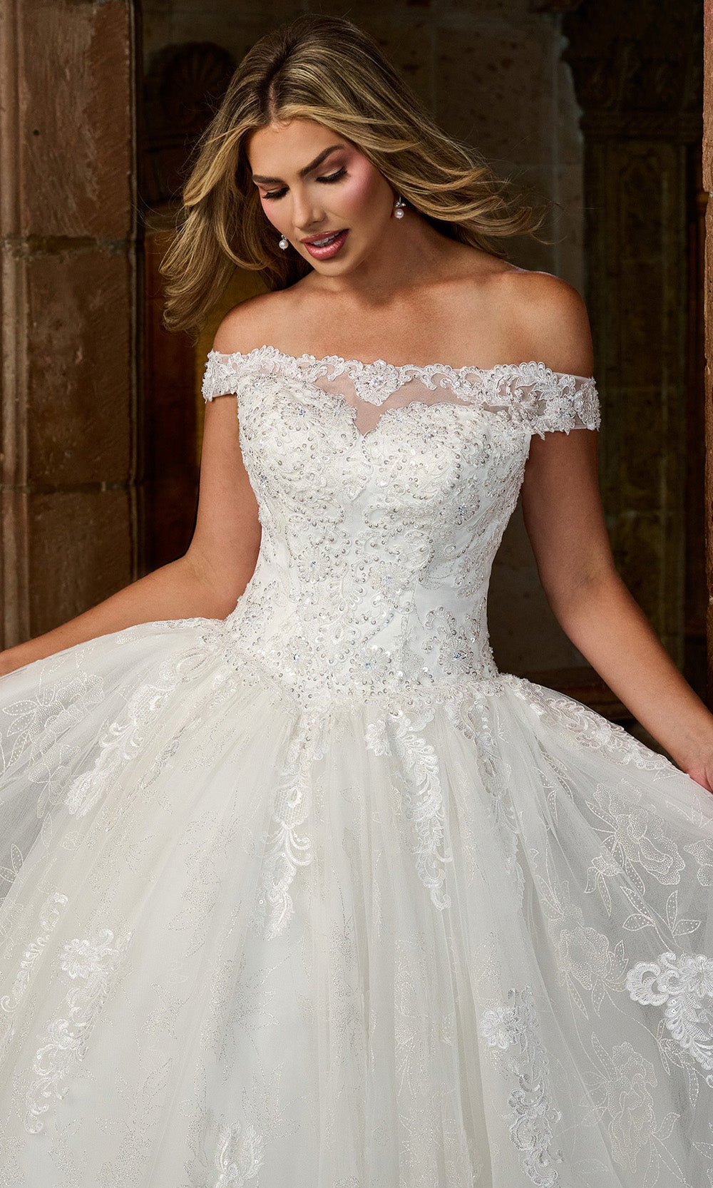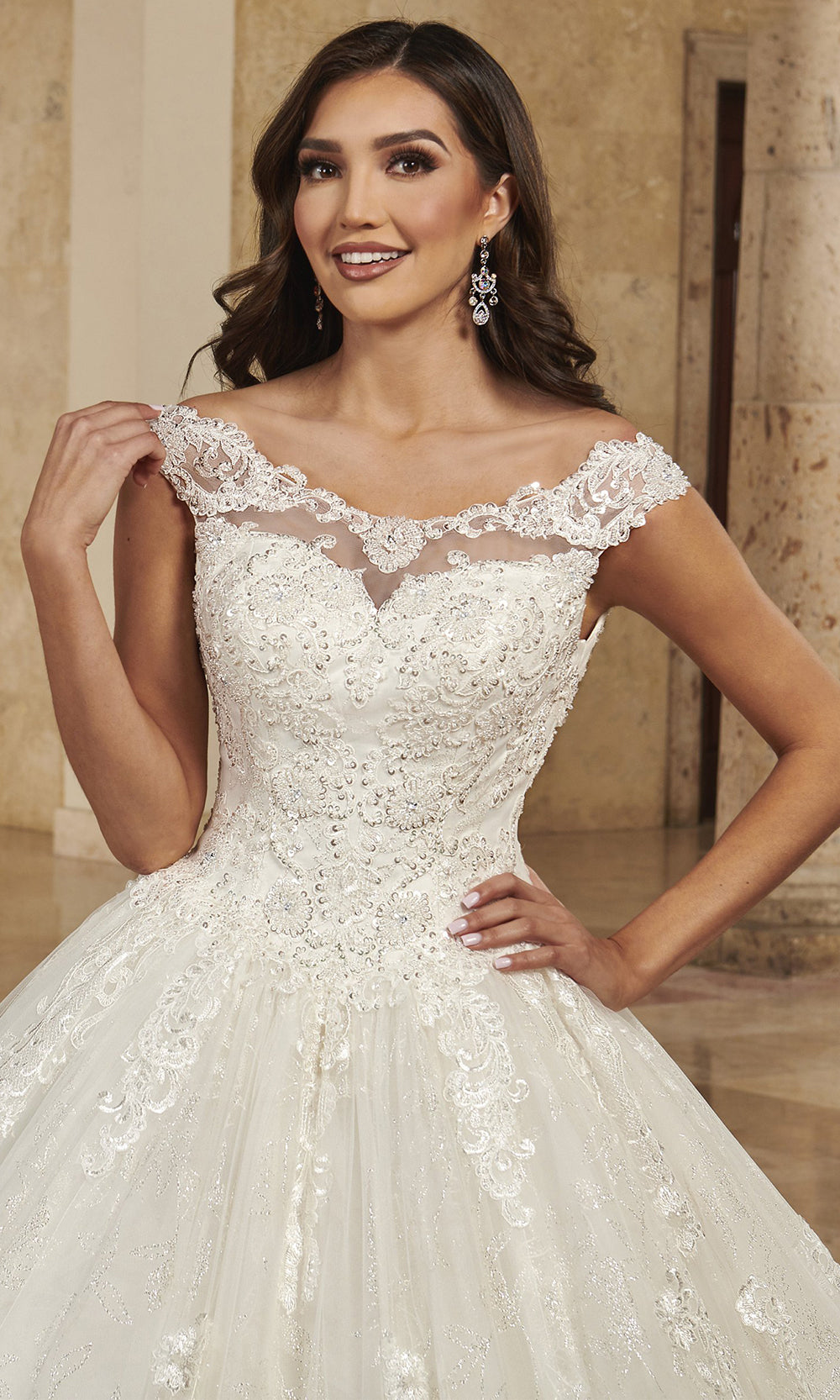 Romantic and regal, the Rachel Allan MB6083 bridal gown is a showpiece of timeless elegance. This design highlights a structured straight off-shoulder neckline paired with an illusion inset and cutout back for subtle allure. The bodice is adorned with intricately beaded lace appliques that flow into a full glitter tulle skirt. A sweeping train adds breathtaking drama, making this gown perfect for formal ceremonies. Rachel Allan MB6083 is a flawless option for brides who wish to express grace and refinement in every step. Model is wearing Ivory color.