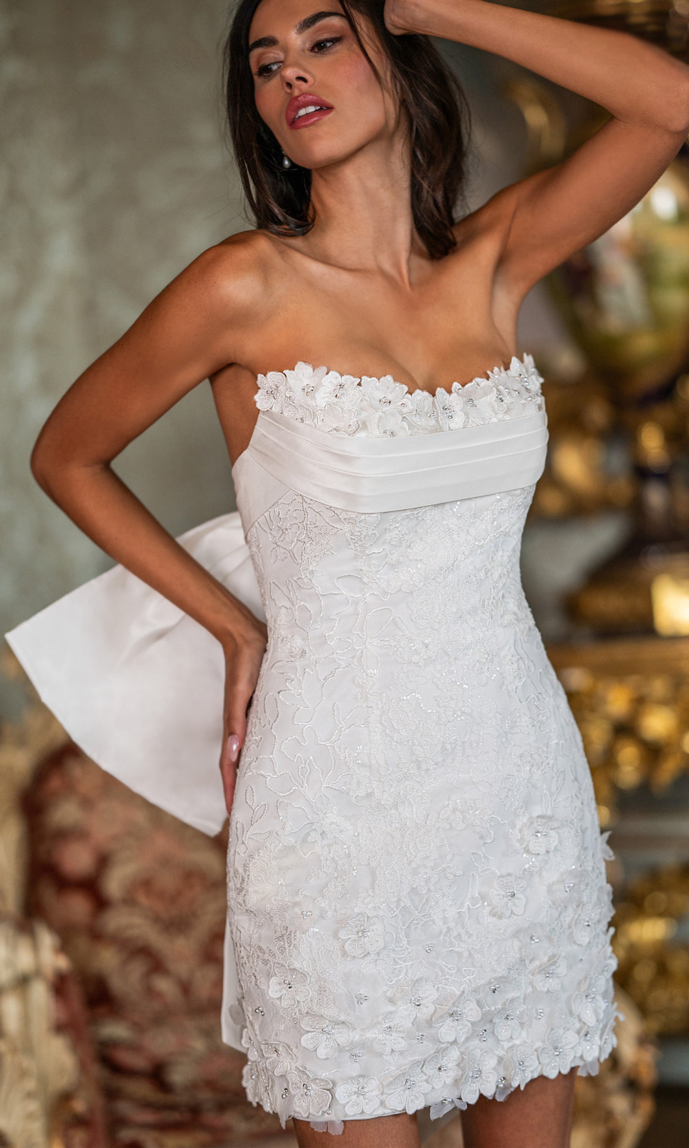 | Details: | Strapless neckline, fitted mini silhouette, floral lace applique, pleated bodice accent, oversized statement bow back |