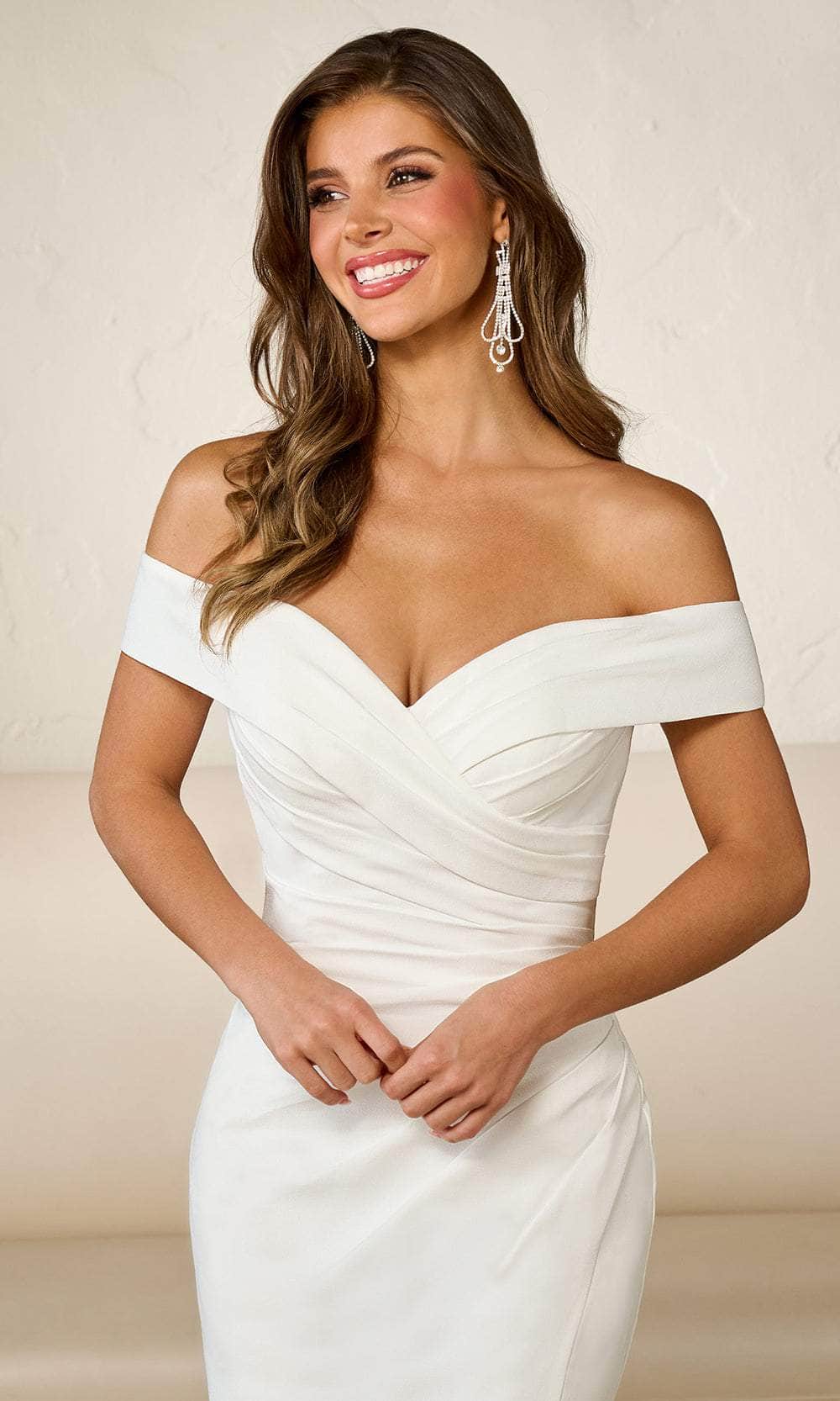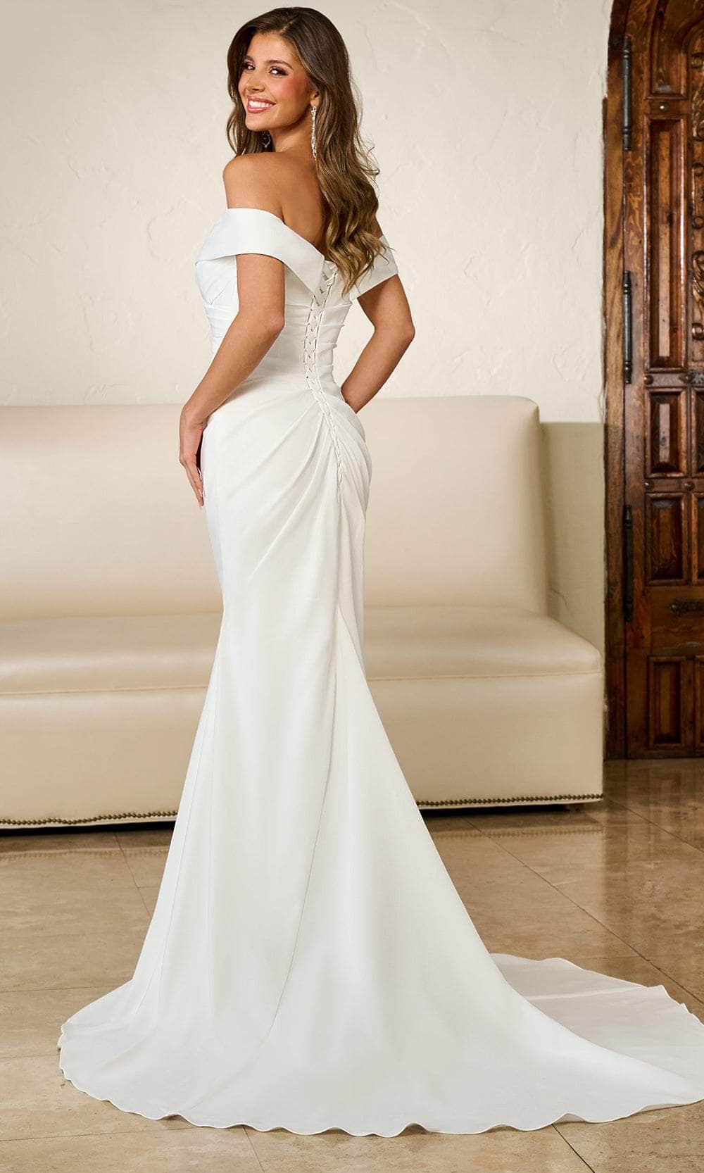 Experience the epitome of grandeur and romance with this Rachel Allan RB2171 creation. To highlight its inherent beauty, this gown showcases a pleated detail on the bodice. It also boasts an off-shoulder sweetheart neckline, cap sleeves, and a mid-open lace-up back that adds a touch of allure. The mermaid skirt opens up with a sexy front thigh-high slit before it traverses to the floor and sweeping train. Everyone will be in awe of this long Rachel Allan RB2171 gown. Model is wearing Ivory color.