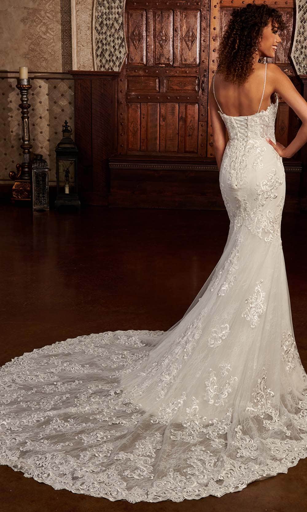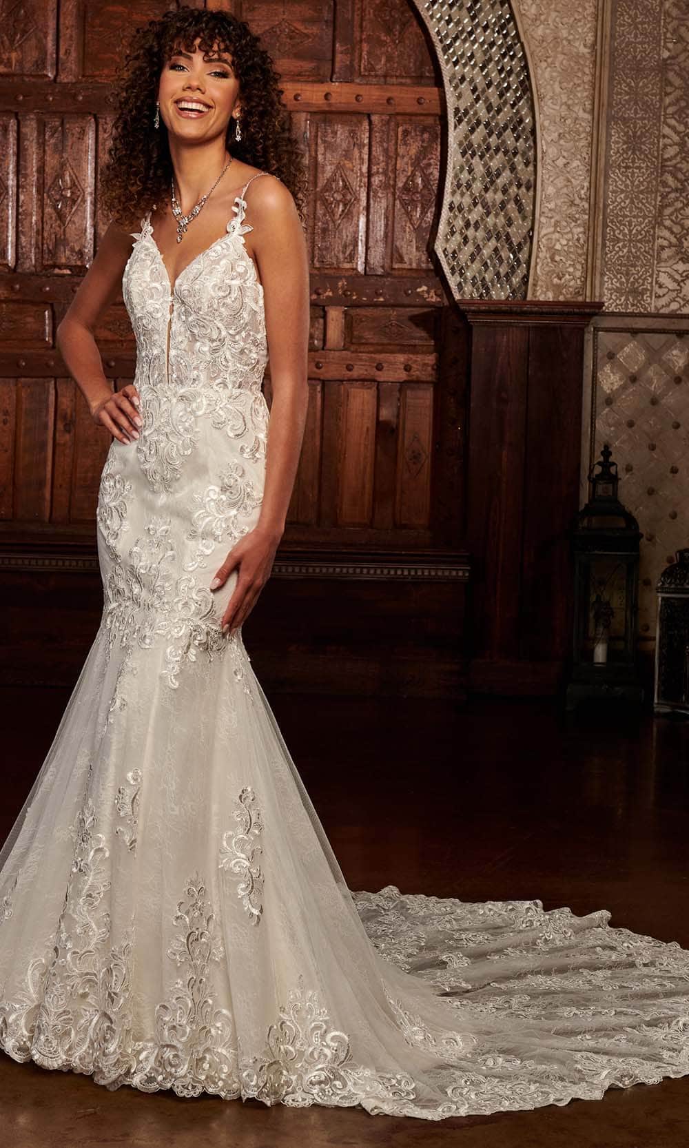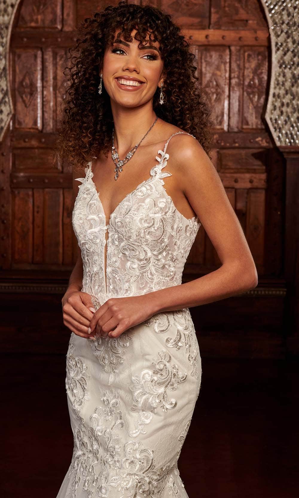 This enticing Rachel Allan RB3172 bridal gown exudes perfect elegance and romanticism. This lace fit and flare dress is a true work of art. The plunging sweetheart neckline, adorned with a sheer insert, adds a touch of allure and elegance. Beaded straps add a hint of sparkle and definition. The tulle overlay with delicate appliques creates a whimsical and ethereal look. With a detachable liner, you can customize your style effortlessly. Completing the ensemble is a chapel train and lace-up back closure, ensuring a perfect fit and a breathtaking entrance. Get ready to create cherished memories in this enchanting Rachel Allan RB3172. Model is wearing Ivory color.