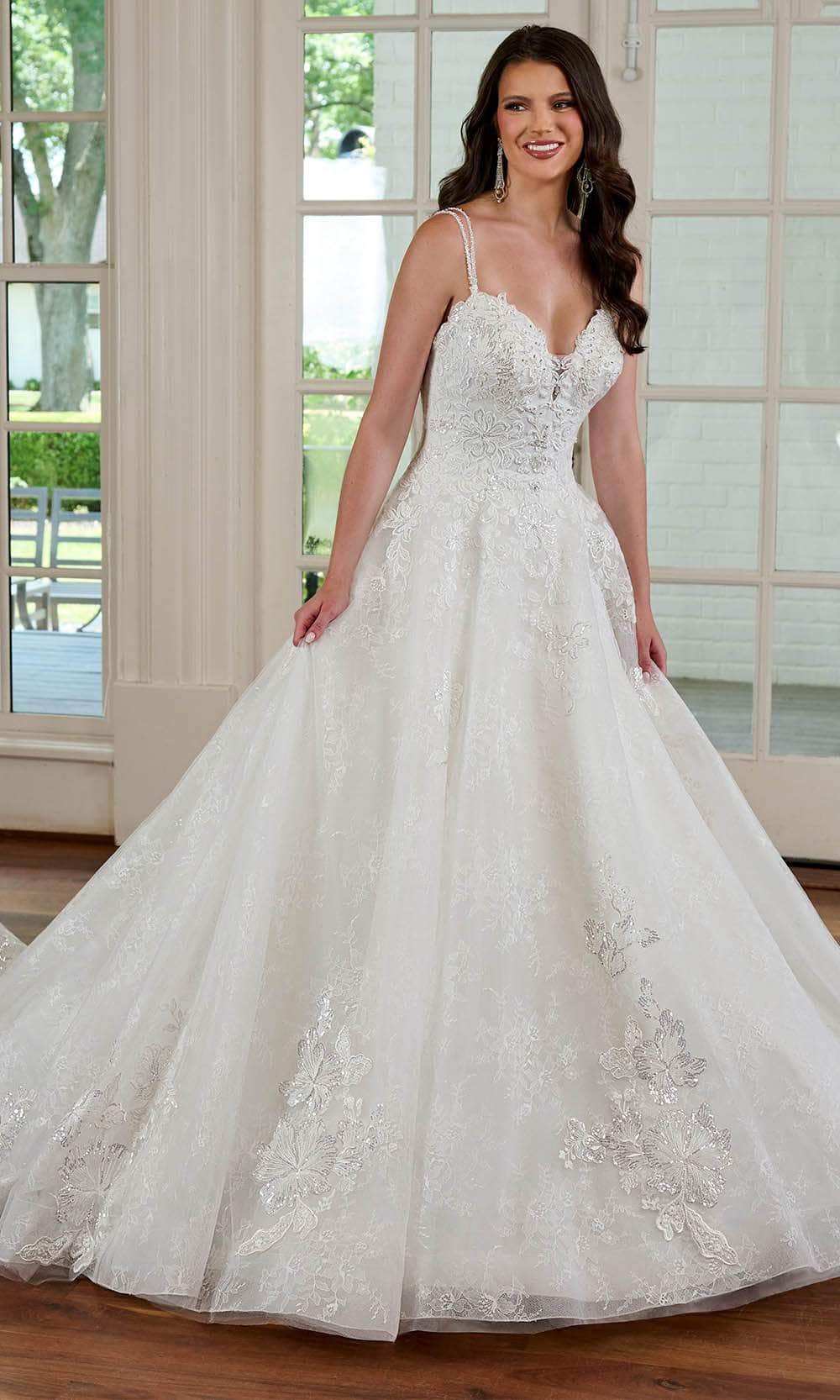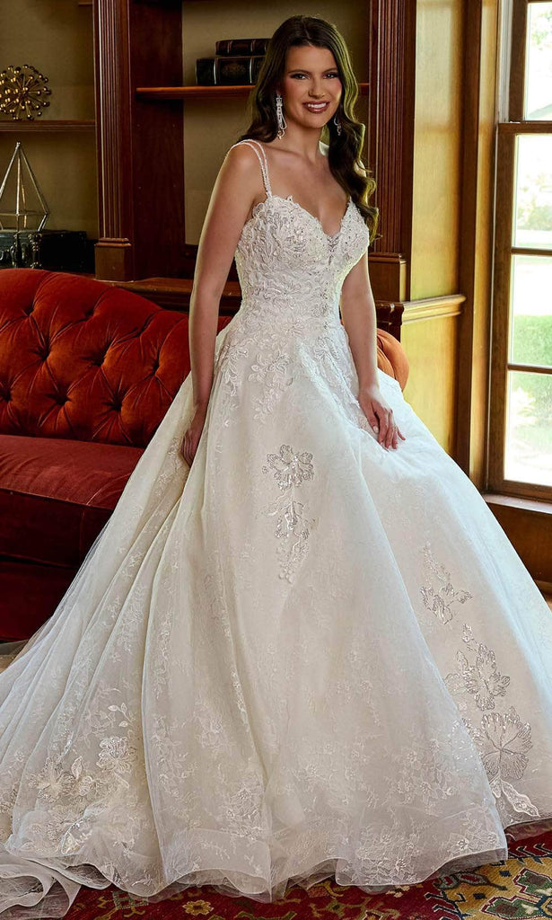 Walk down the aisle with poise and grace in this Rachel Allan RB3180 creation. This sleeveless stunner displays a lace embroidery and sequin embellishments all over the bodice. The dual spaghetti straps beautifully frame the shoulders, complemented by a plunging sweetheart neckline. A corset lace-up design at the midrise back ensures a perfect fit. To finish it off, the A-line skirt drapes to the floor and finishes with the chapel train that adds a regal touch. Bloom with beauty and love as you saunter towards forever in this Rachel Allan RB3180 masterpiece. Model is wearing Ivory color.