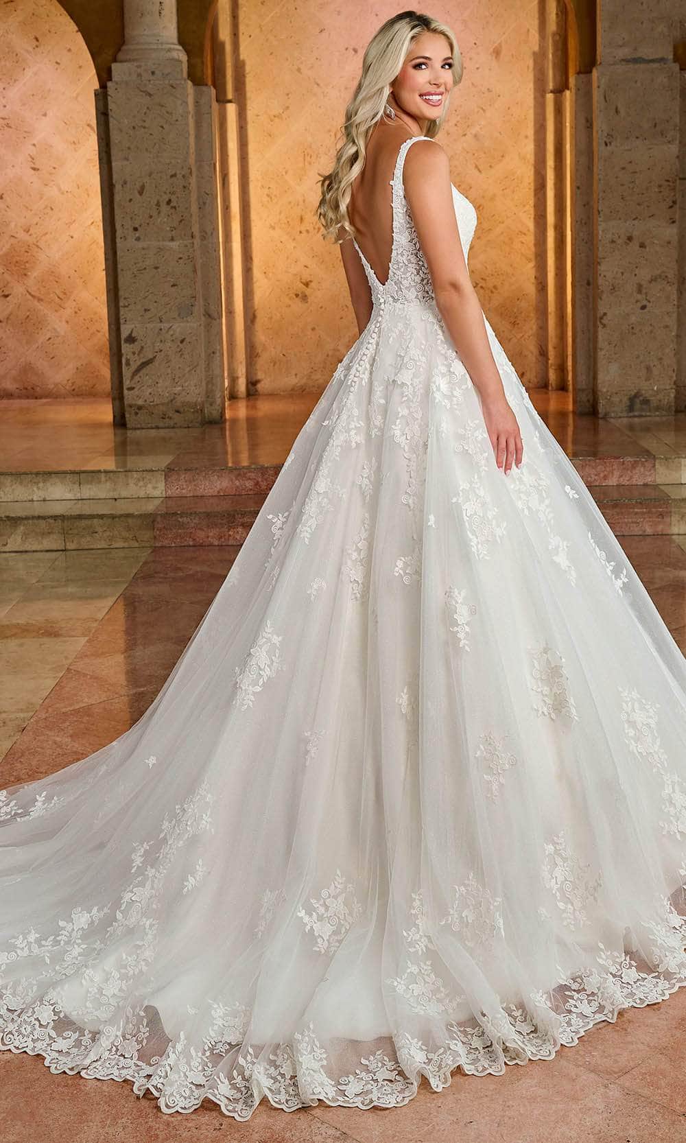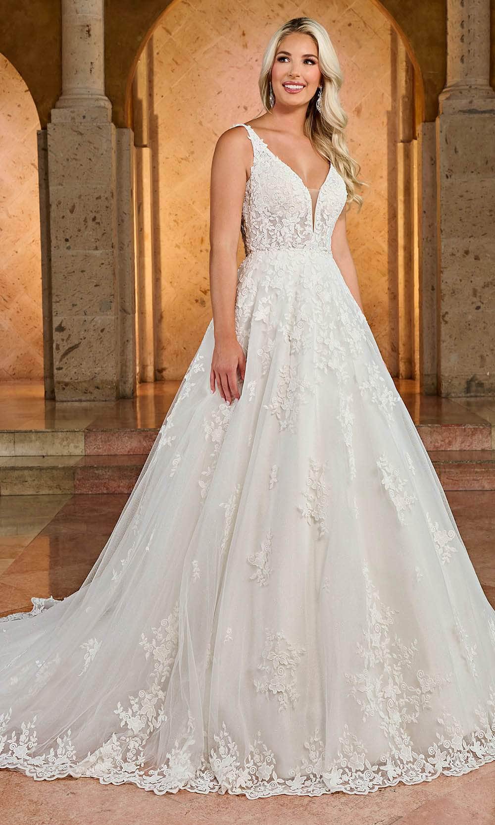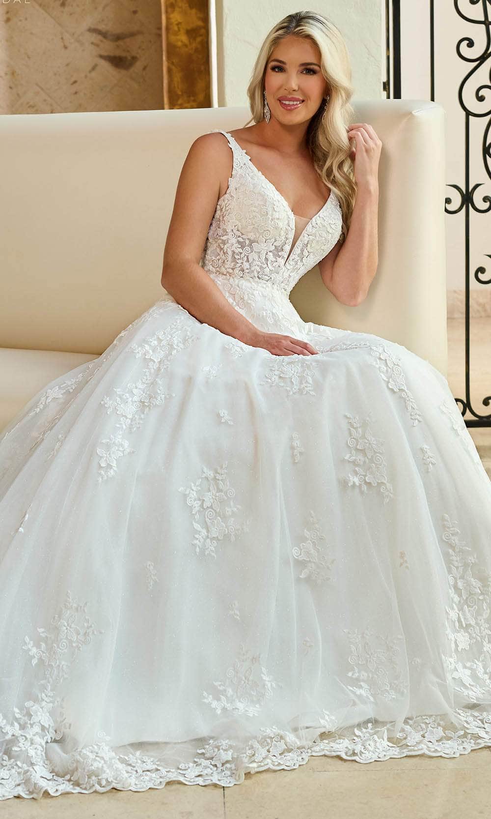 Step into the spotlight on your wedding day in this Rachel Allan RB3190 masterpiece. This sleeveless gown is fully decorated with floral embroidery and sparkly beads. The plunging v-neckline is alluring, with a sheer inset at the center and thin shoulder straps for support. Revealing a peek of skin, the back has a low v-shaped cut secure by the stylish button closure. The skirt is tailored in an A-line silhouette that cascades to the sweeping train and ends in a scalloped hemline for a magnificent effect. Fall in love with the beauty in Rachel Allan RB3190 gown. Model is wearing Ivory color.