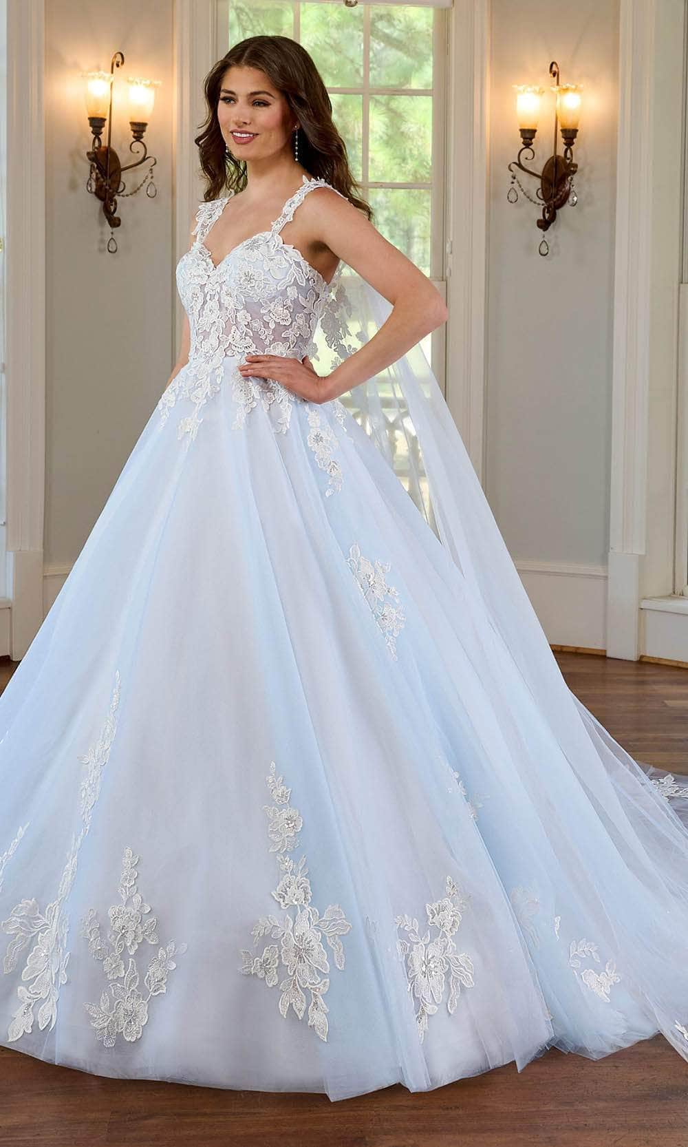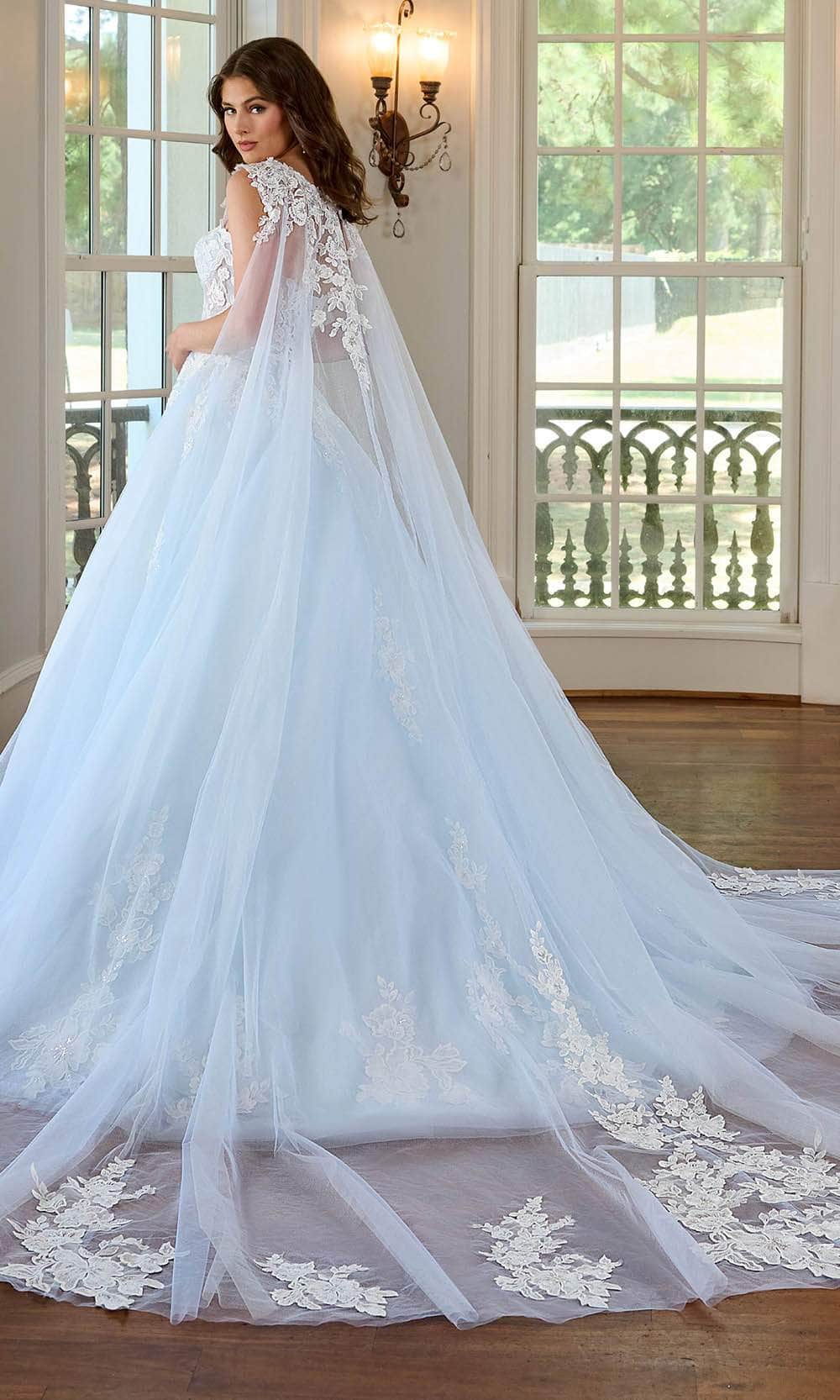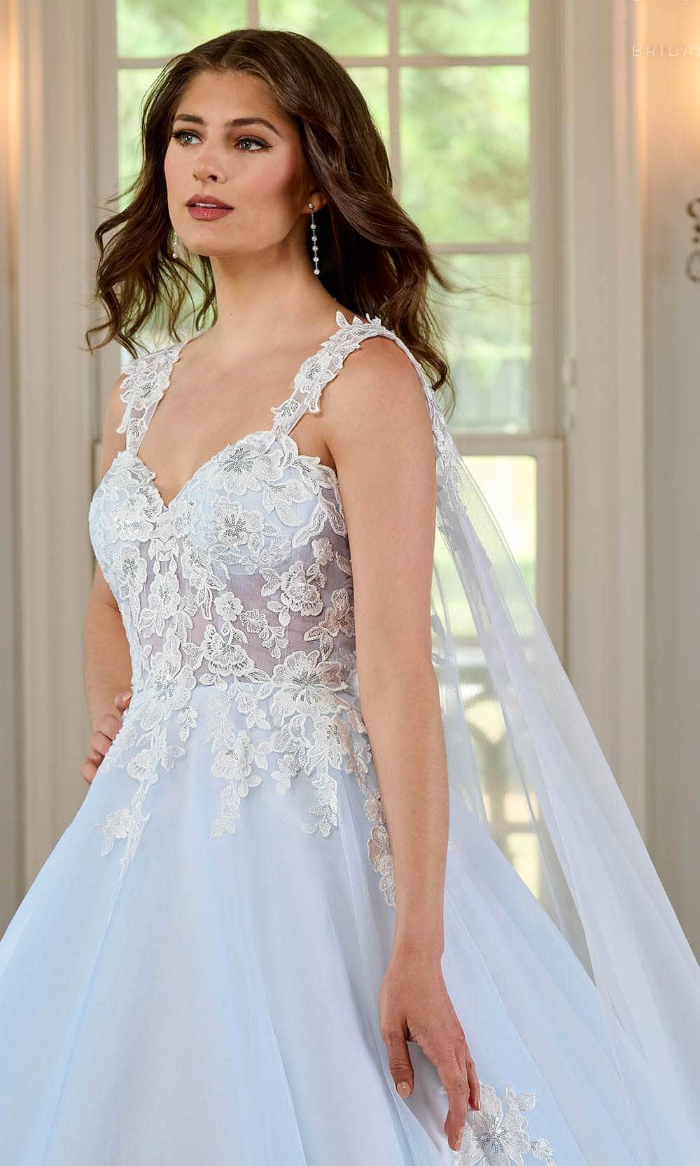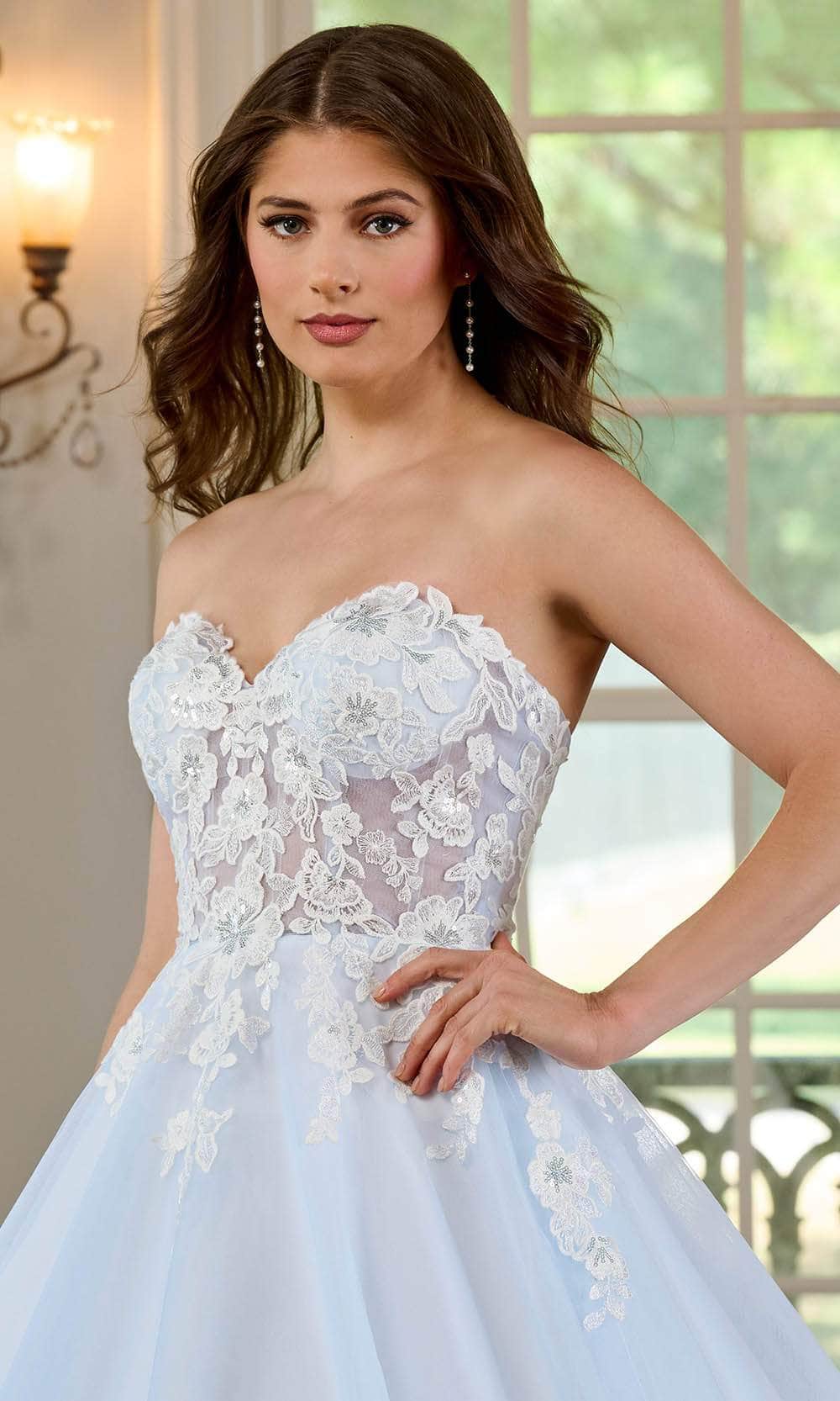 Turn yourself into a head-turning beauty by slipping into this Rachel Allan RB4182 masterpiece. This strapless gown is adorned with floral embroidery and shimmering sequins, giving it an exquisite touch of femininity and allure. The top bodice has an illusion detail, a sweetheart neckline, and a lace-up closure at the midrise back. To add an extra layer of enchantment, the illusion detachable long cape drapes over your shoulders down to the chapel train. It is completed in a voluminous ballgown skirt that spills to the full length hemline. Fall in love when you slip on this Rachel Allan RB4182 creation. Model is wearing Ivory Light Blue color.