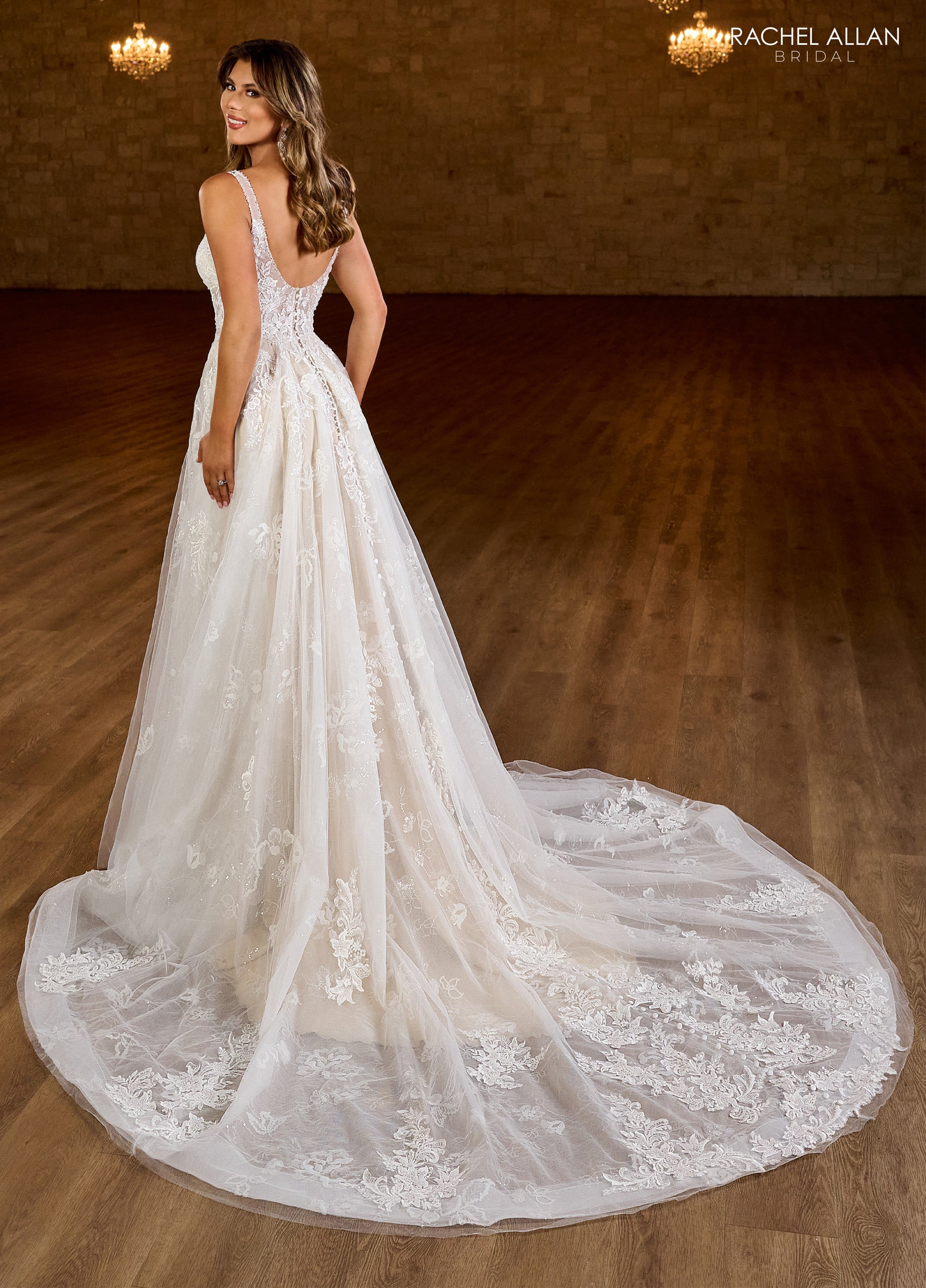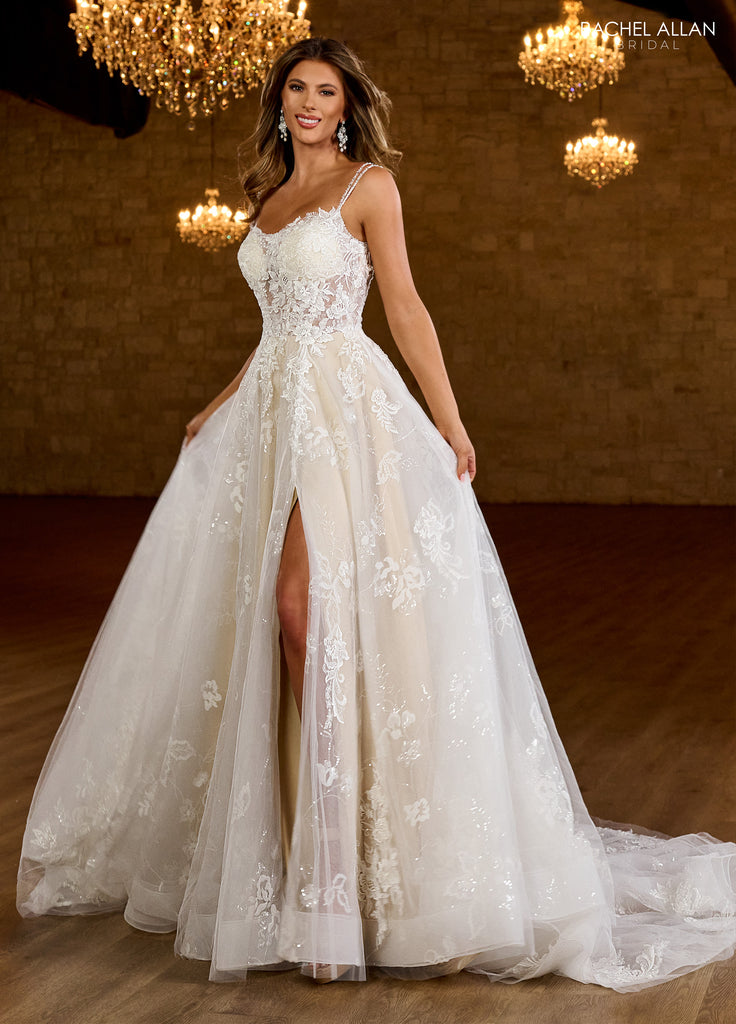 Unveil your bridal vision with Rachel Allan RB4186, an A-line sleeveless gown that blends timeless softness with daring flair. The scoop neckline and illusion bodice highlight exquisite floral appliques and beading that shimmer from top to hem. A sensual high slit offers modern charm, while the chapel train flows with effortless beauty. Choose Rachel Allan RB4186 bridal gown to embody a look of graceful femininity and confident sophistication on your special day. Model is wearing Ivory Nude color.