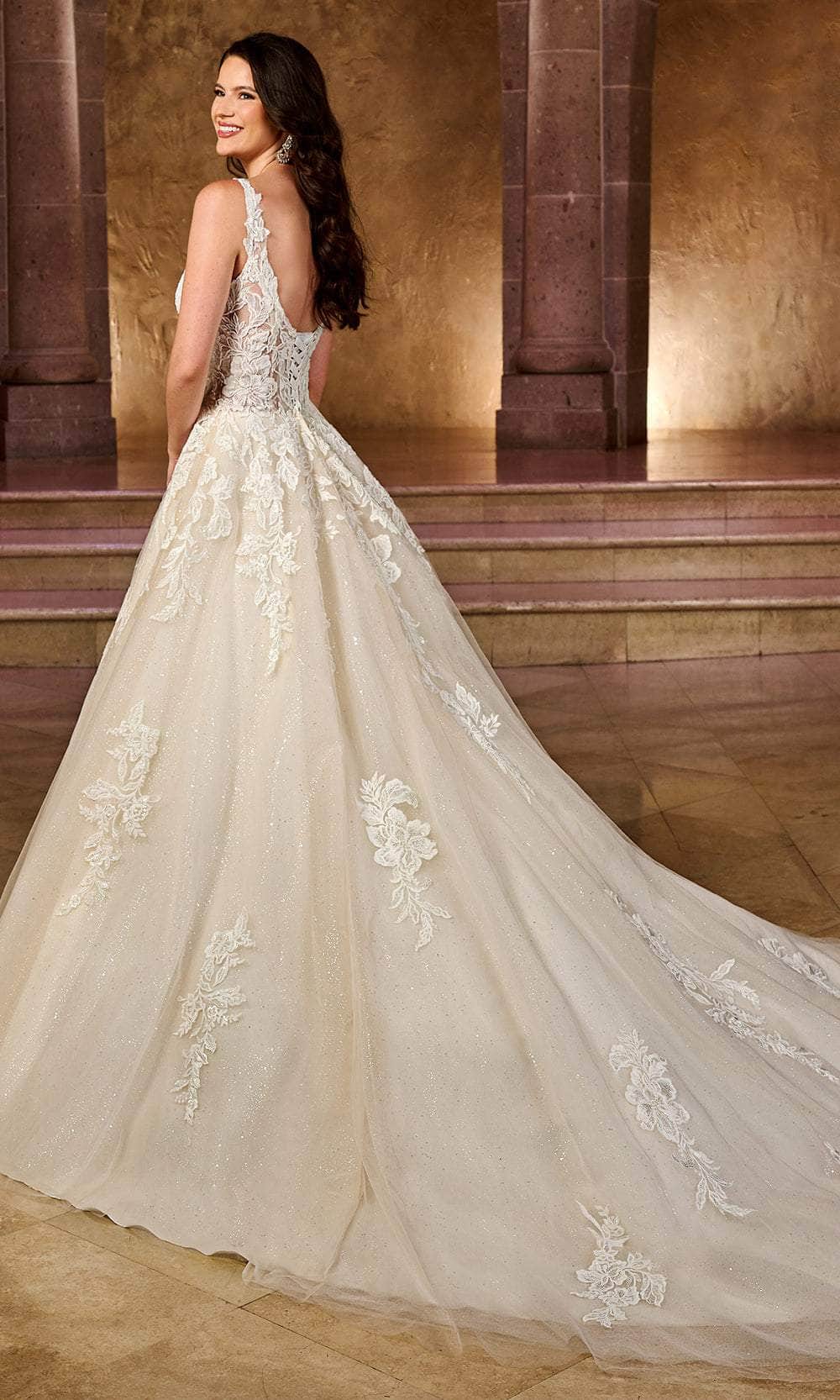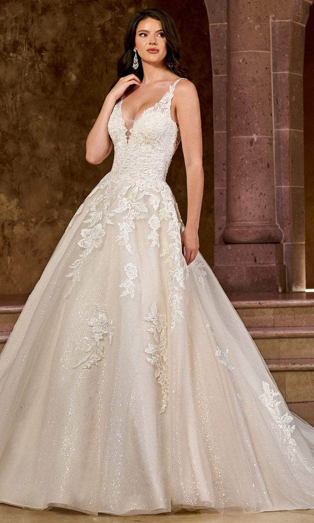 Make your wedding day dream come true with this Rachel Allan RB5037 masterpiece. The beautiful sleeveless gown is made from glitter tulle, heightened with lace appliques and beading embellishment. It is held in place by thin shoulder straps, providing support to the plunging v-neckline and scoop lace-up back. With its chapel train trailing behind you, the skirt produces an enchanting A-line silhouette that suits all figures. Bloom with loveliness in this creation from Rachel Allan RB5037 Model is wearing Ivory Champagne color.