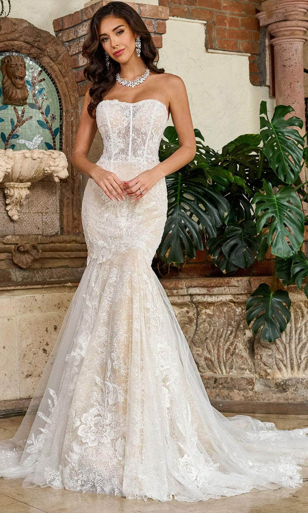 Turn your wedding day into a fairytale moment in the Rachel Allan RB5066 masterpiece. This gown radiates romance with its exquisite floral embroidery and sequin details. The semi-sweetheart neckline, mid-open zippered back and sheer corset boning bodice are captivating features. The trumpet skirt is beautifully complemented by a semi-chapel train, creating a dramatic effect with each step. A dream for any bride, the Rachel Allan RB5066 long gown ensures a striking look and lasting impression. Model is wearing Ivory color.