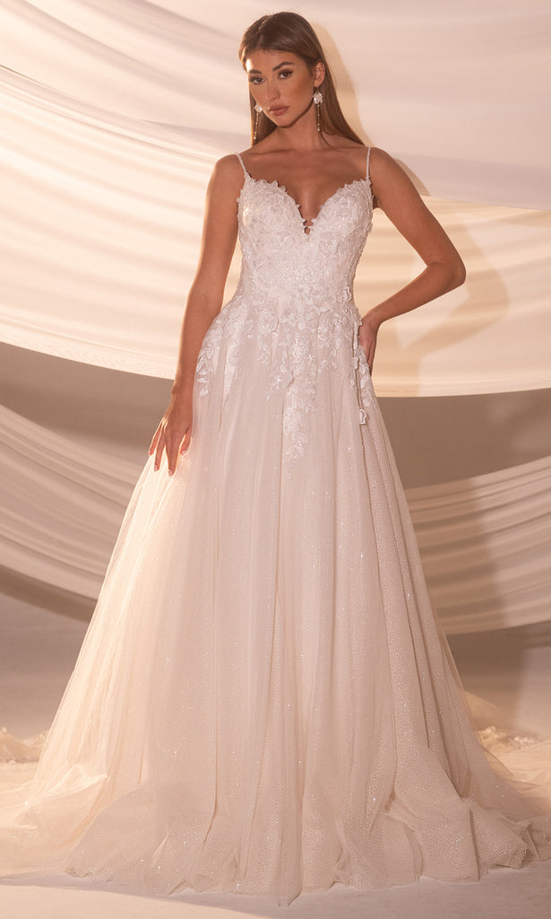 Rachel Allan RB5107 invites you into a world where sparkle meets softness in perfect balance. This A-line gown features a deep v-neckline supported by spaghetti straps, flowing into a glitter tulle A-line skirt embellished with floral lace and tonal beading. Its movement is ethereal, with layers that create volume without weight. Designed to shimmer subtly under light, Rachel Allan RB5107 gown offers a magical yet sophisticated look for brides who value charm, fluidity, and an air of fairytale finesse. Model is wearing Ivory color.