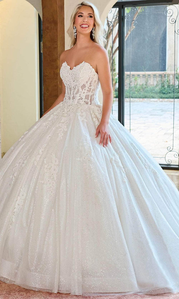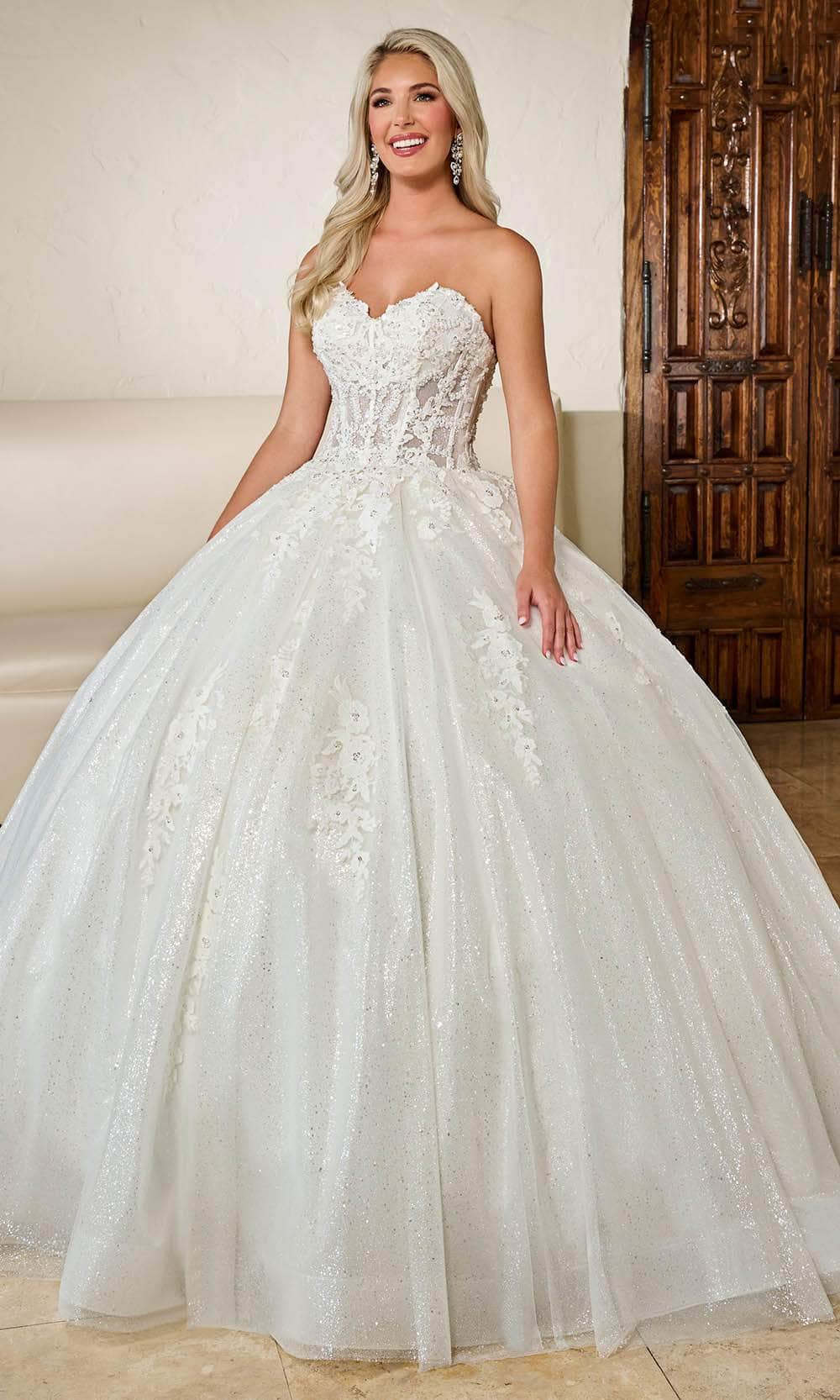 As you wear this Rachel Allan RB6136 everyone in the crowd will adore you. A flawlessly designed dress that embodies pure elegance. Crafted from the most exquisite fabrics, it showcases a sweetheart-cut neckline and an elegant corset bodice, imparting a flattering touch to the overall look. Adorned with sumptuous applique, ethereal tulle, and a timeless lace-up back, it ensures a secure and comfortable fit. The addition of a beautiful sweep train completes your feminine silhouette, adding the perfect finishing touch to this classic and timeless ensemble. Simplicity and elegance as defined by Rachel Allan RB6136. Models are wearing White and Ivory colors.