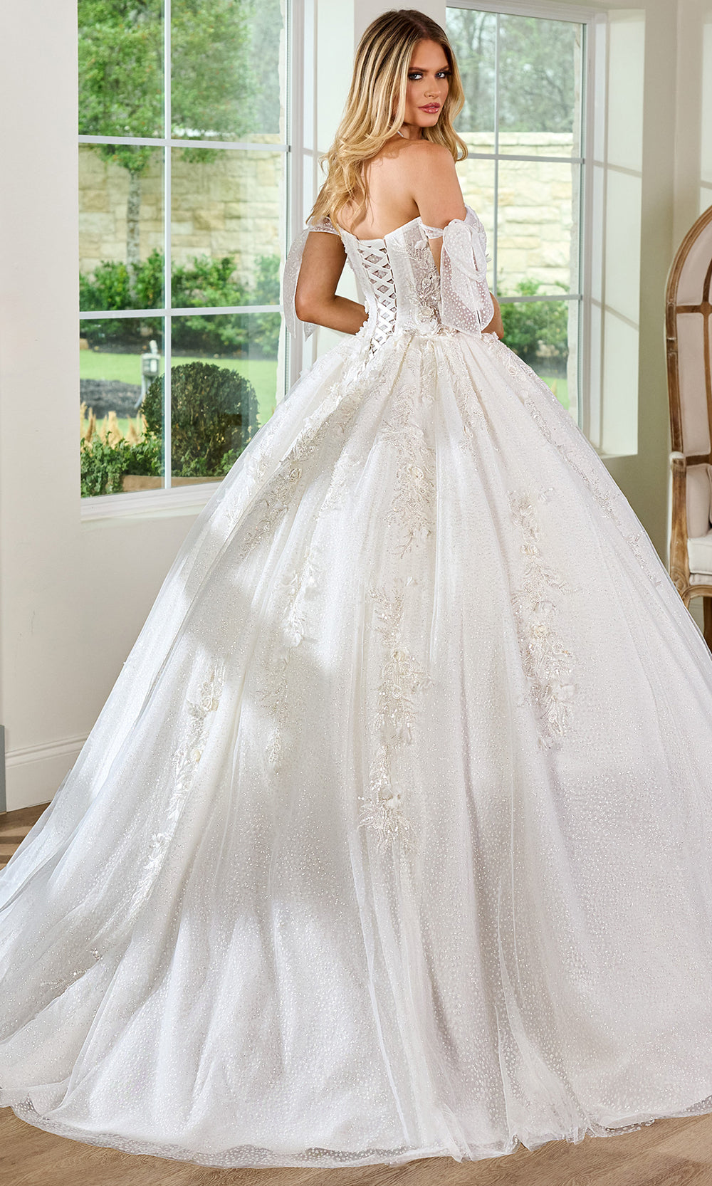 Romantic details and delicate structure come together in this fairytale-inspired gown from Rachel Allan RB6155. The off shoulder tie sleeves frame a softly scoop neckline, paired with a corset boning bodice covered in beaded, lace embroidery and 3D flower accent. From the natural waist, layers of shimmering tulle fall into a voluminous ballgown silhouette and ends with dramatic train. Rachel Allan RB6155 is designed for brides who want a dress that feels both enchanting and secure, with soft feminine styling that makes every moment feel cinematic. Model is wearing Ivory color.