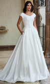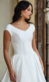 For the bride seeking a gown that balances tradition and modernity, Rachel Allan RB7000 delivers in every aspect. The clean lines of the Mikado A-line silhouette are complemented by a structured bodice that accentuates the waist beautifully. Cap sleeves and v-neckline provide a classic touch, making this gown ideal for a sophisticated and graceful bridal look. Rachel Allan RB7000 is designed for effortless beauty, ensuring that every step down the aisle is filled with confidence and elegance. Model is wearing Ivory color.