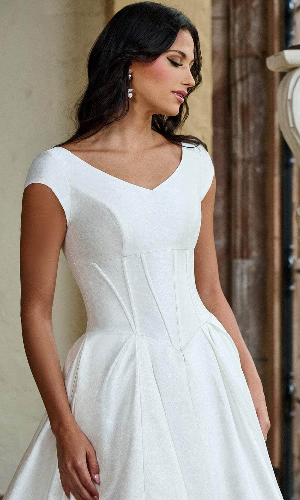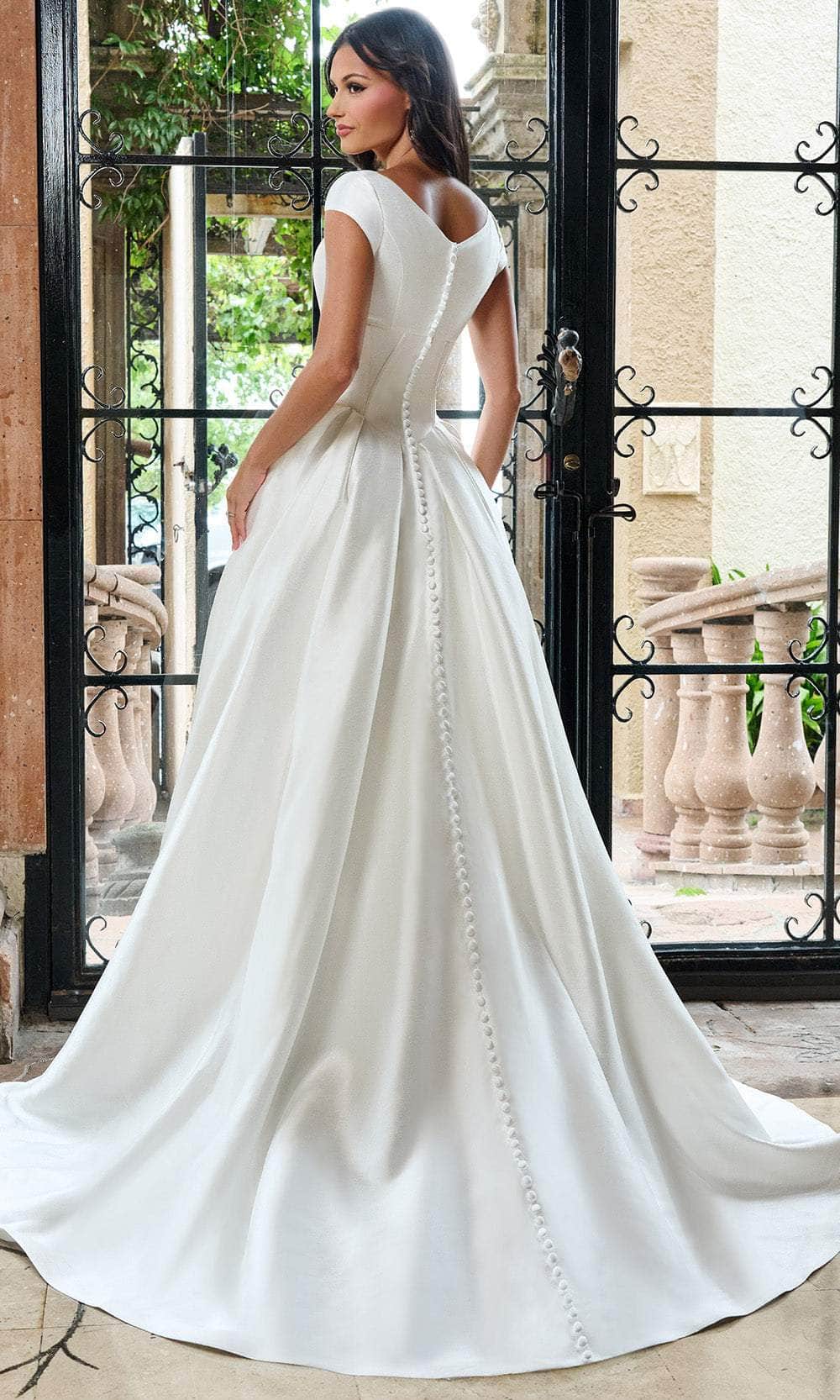 | Details: | Cap Sleeves, Structured Bodice, Clean Mikado Finish, Buttoned Back |