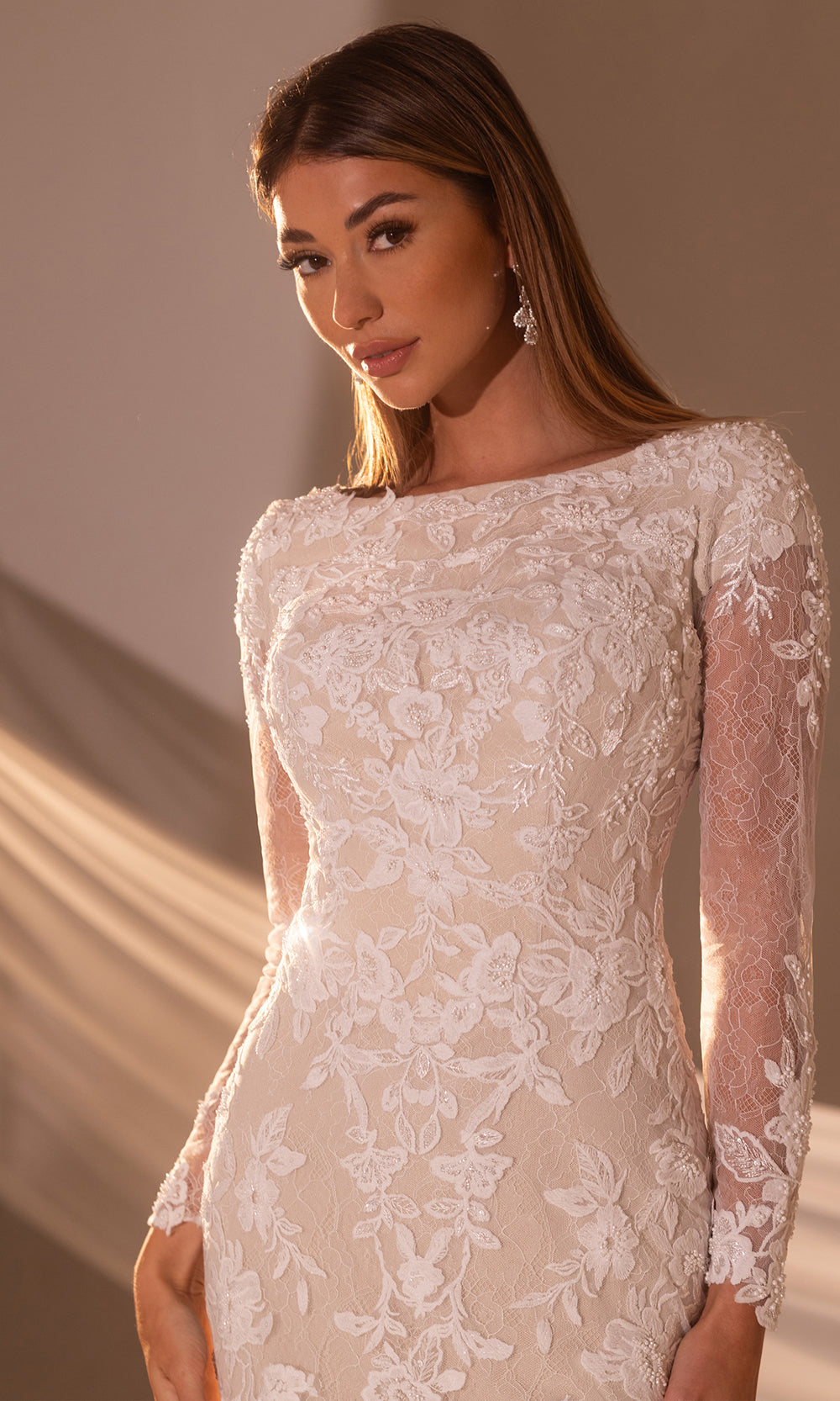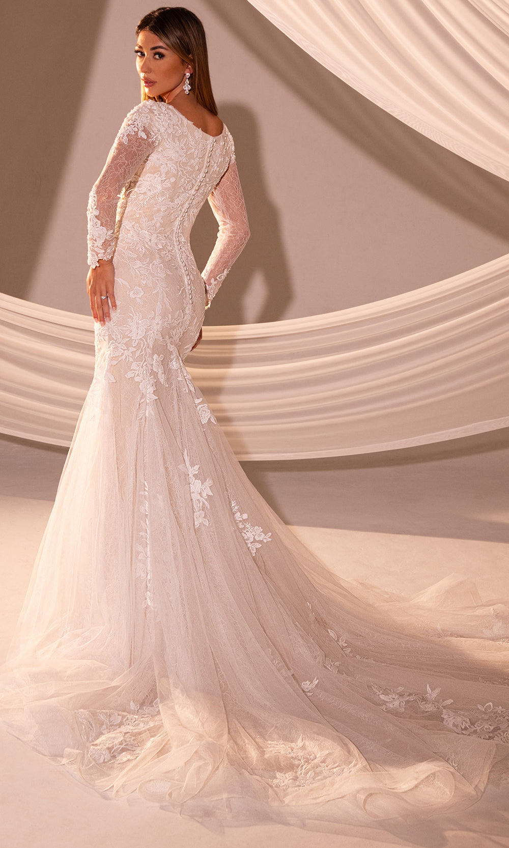| Details: | Illusion Long Sleeves, Floral Lace Appliques, Beaded, Buttons Back Detail, Chapel-Length Train |