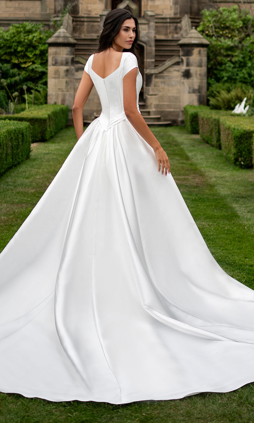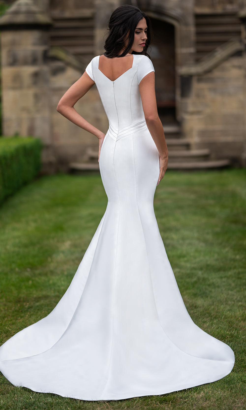| Details: | Structured crepe bodice, cap sleeves, sweetheart neckline, fitted mermaid silhouette, dramatic chapel train, clean seam detailing, low back zipper closure |