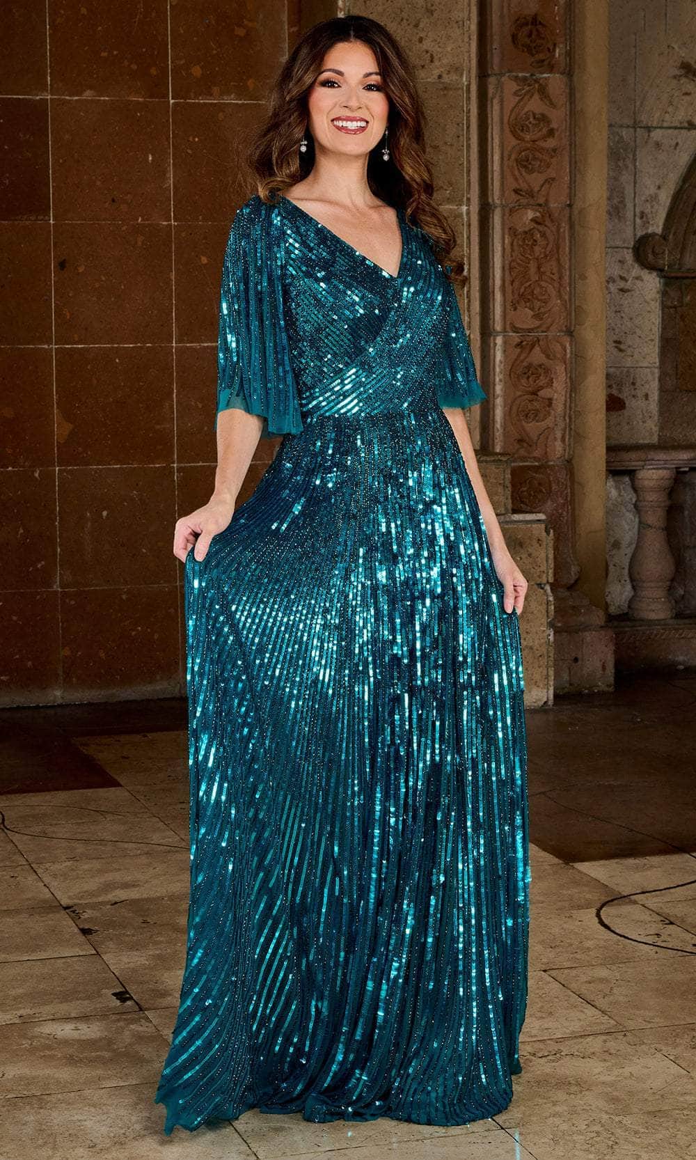Surround yourself with decadence in a dazzling Rachel Allan RB8127, a flawless stretch tulle sheath gown designed for timeless elegance. Luxuriously crafted, this gown delicately embraces your curves while gracefully flowing around your body. Fine sequins impart a subtle touch of bling, ensuring you radiate brilliance from every angle in the room. The flowing elbow-length sleeves add an extra layer of sophistication and class, enhancing your overall look and making this Rachel Allan RB8127 the perfect choice for a refined and stylish appearance. Model is wearing Peacock color.