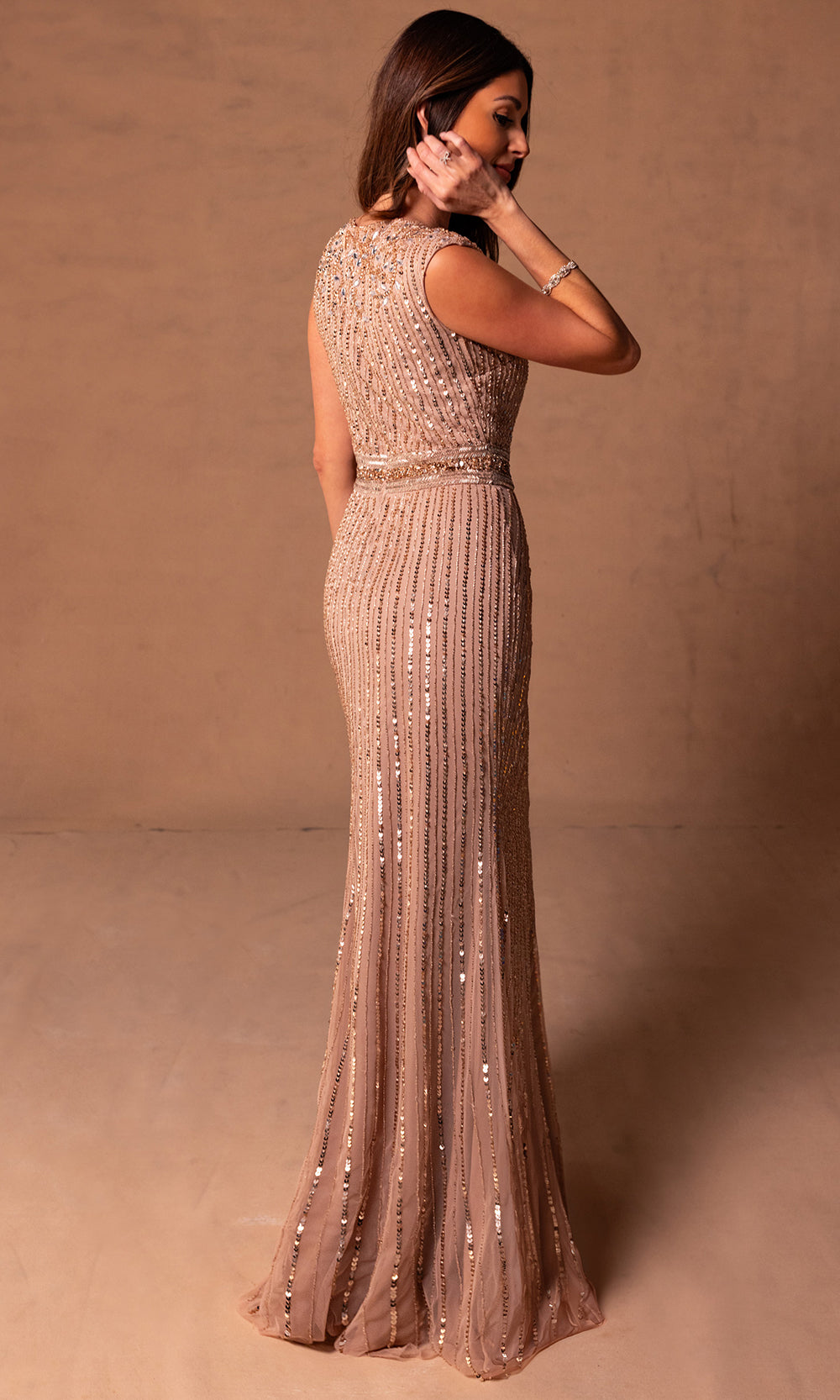Crafted for evenings that call for refined shine and structured appeal, this Rachel Allan RB8185 gown highlights the figure through vertical embellishments. It captivates with a jewel neckline, cap sleeves and fitted silhouette, while the defined beaded waistband create visual shape. The blend of beading and sequins creates a radiant shimmer that perfectly balances femininity and elegance. Rachel Allan RB8185 is a versatile option for galas or formal weddings, delivering polished beauty without overpowering detail. Model is wearing Blush Rose Gold color.