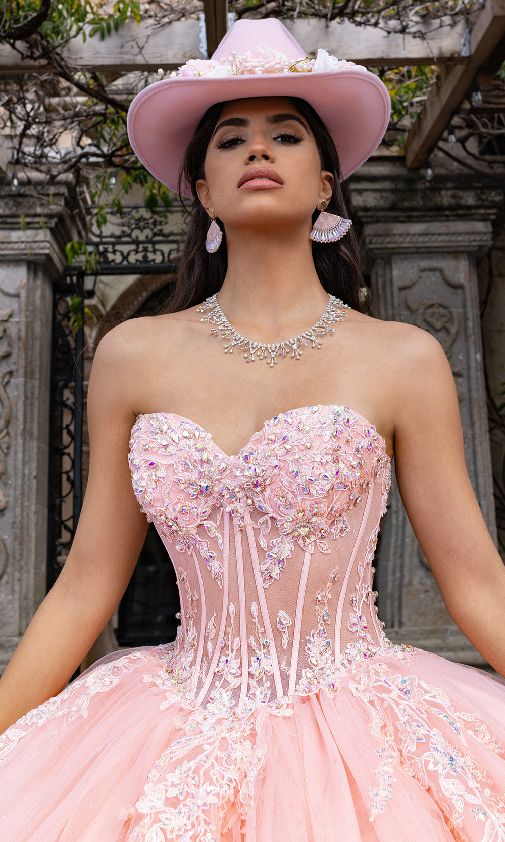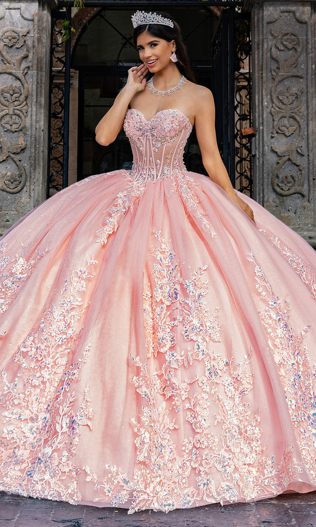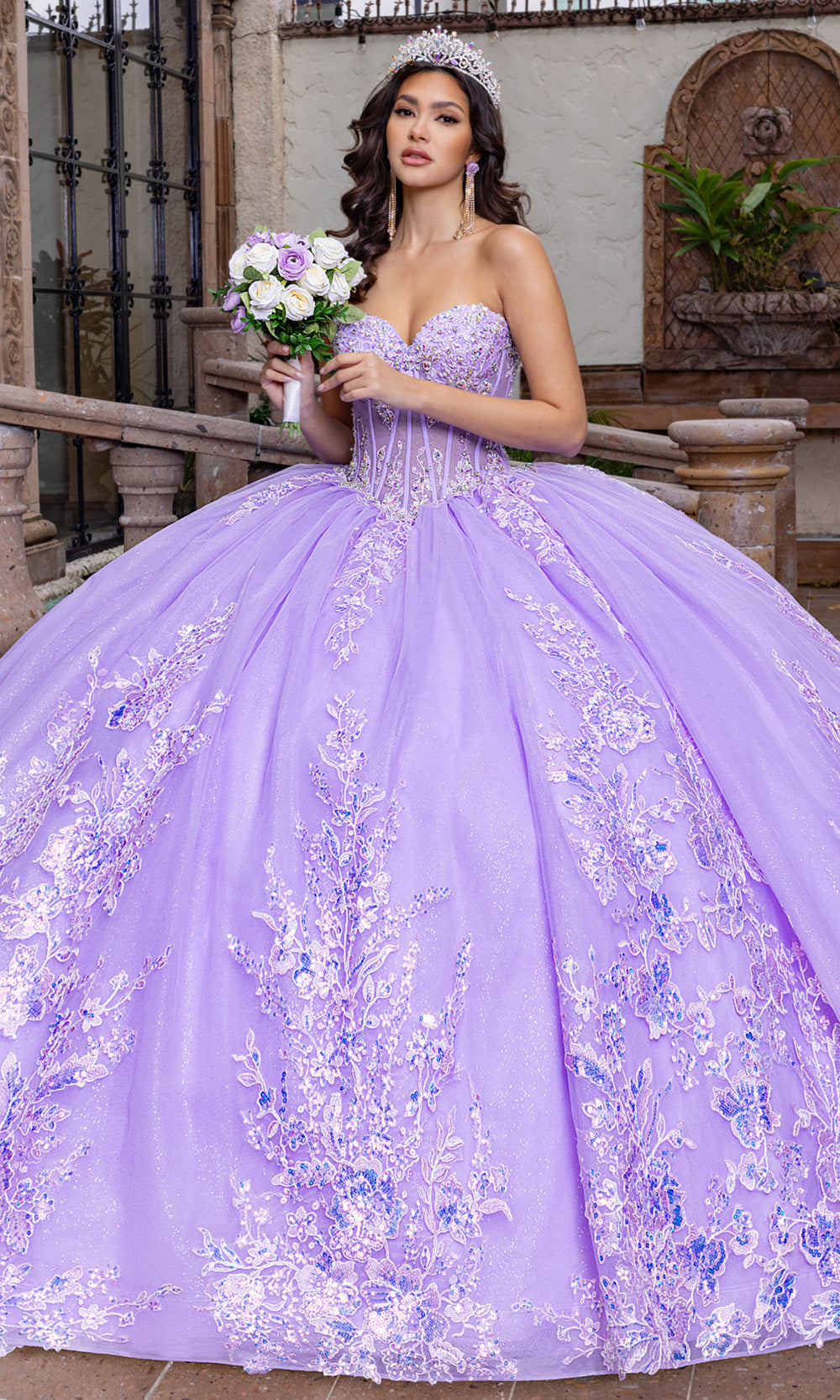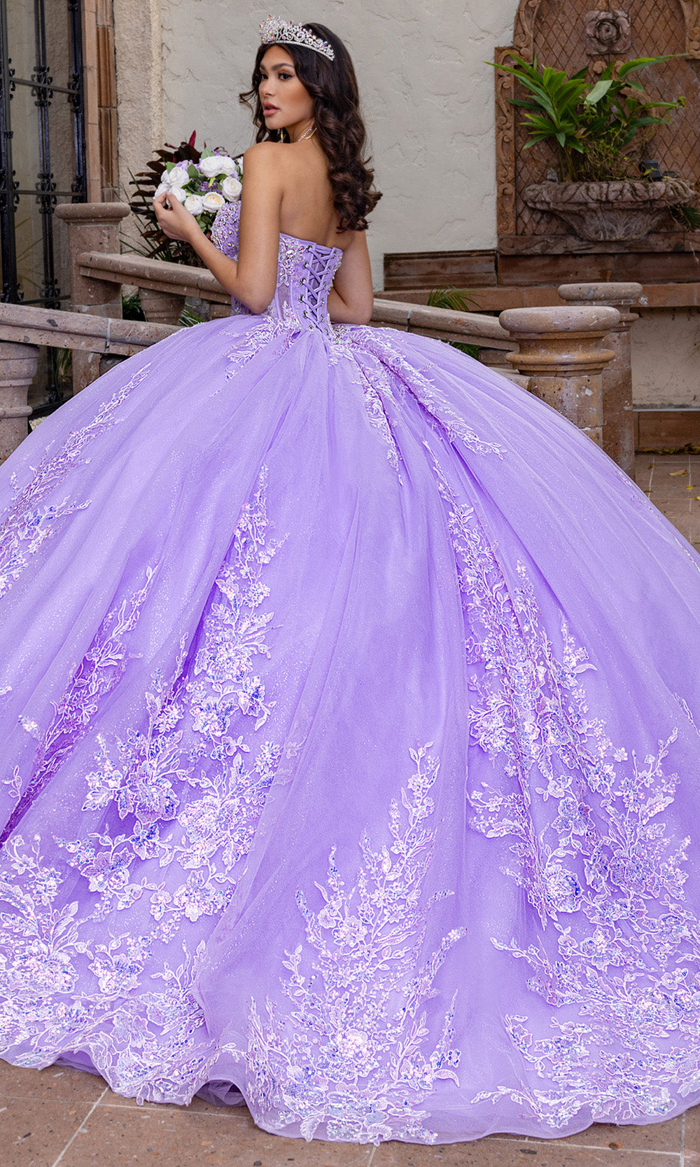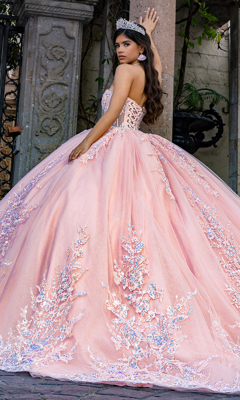 This strapless ballgown from Rachel Allan, RQ1169, showcases dreamy flair and romantic detailing in every aspect. The illusion corset bodice with visible boning offers structured support while displaying floral embroidery, beading and sequins that injects texture and whimsy. The glitter tulle ballgown skirt flows outward in voluminous layers, sparkling as light catches each movement, making it ideal for grand entrances or photo moments. Designed with a Basque waistline to emphasize elegance, this gown radiates youthful charm and grand romance. Crafted for quinceaneras, debutantes, or milestone celebrations, Rachel Allan RQ1169 brings magical presence and unforgettable style. Models are wearing Blush, and Lilac colors.