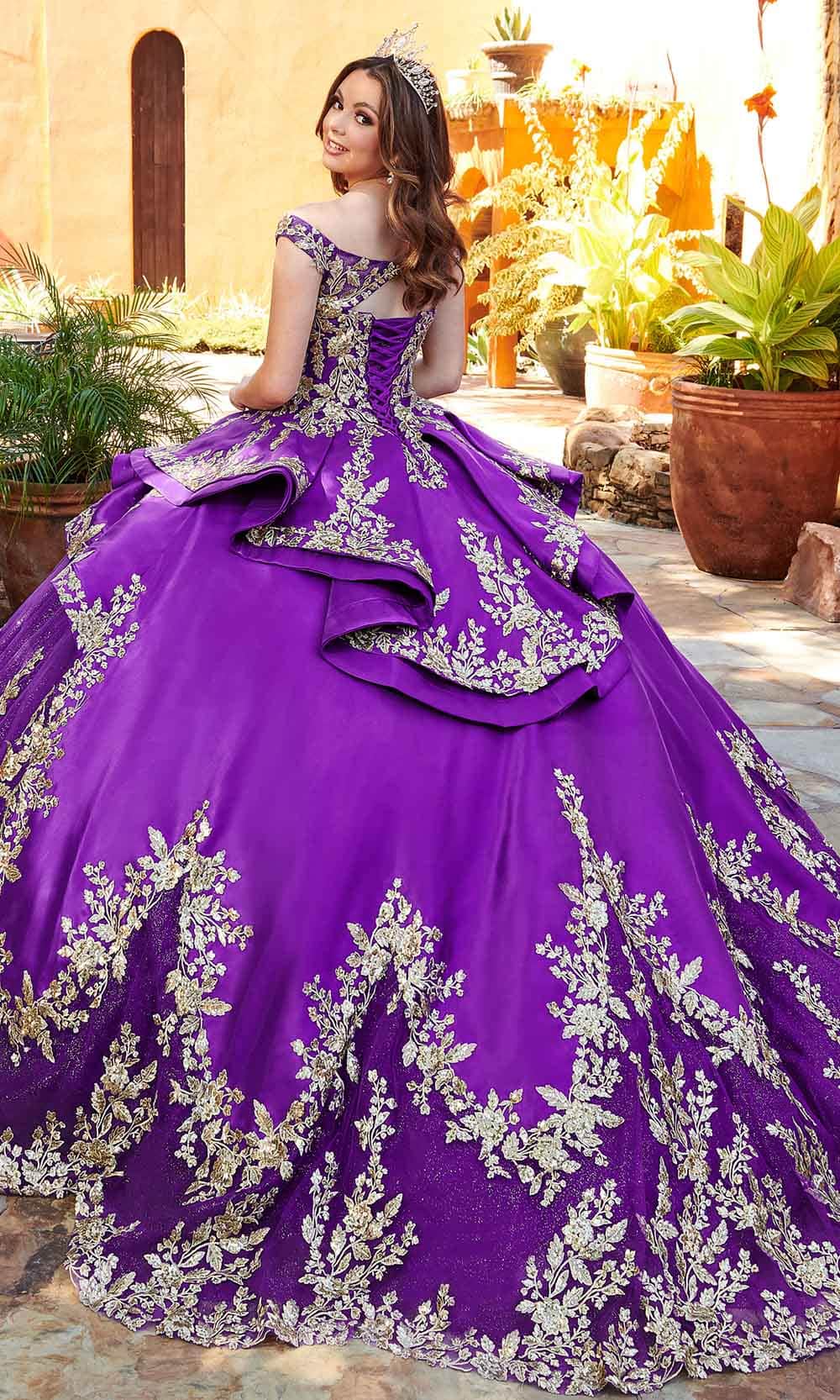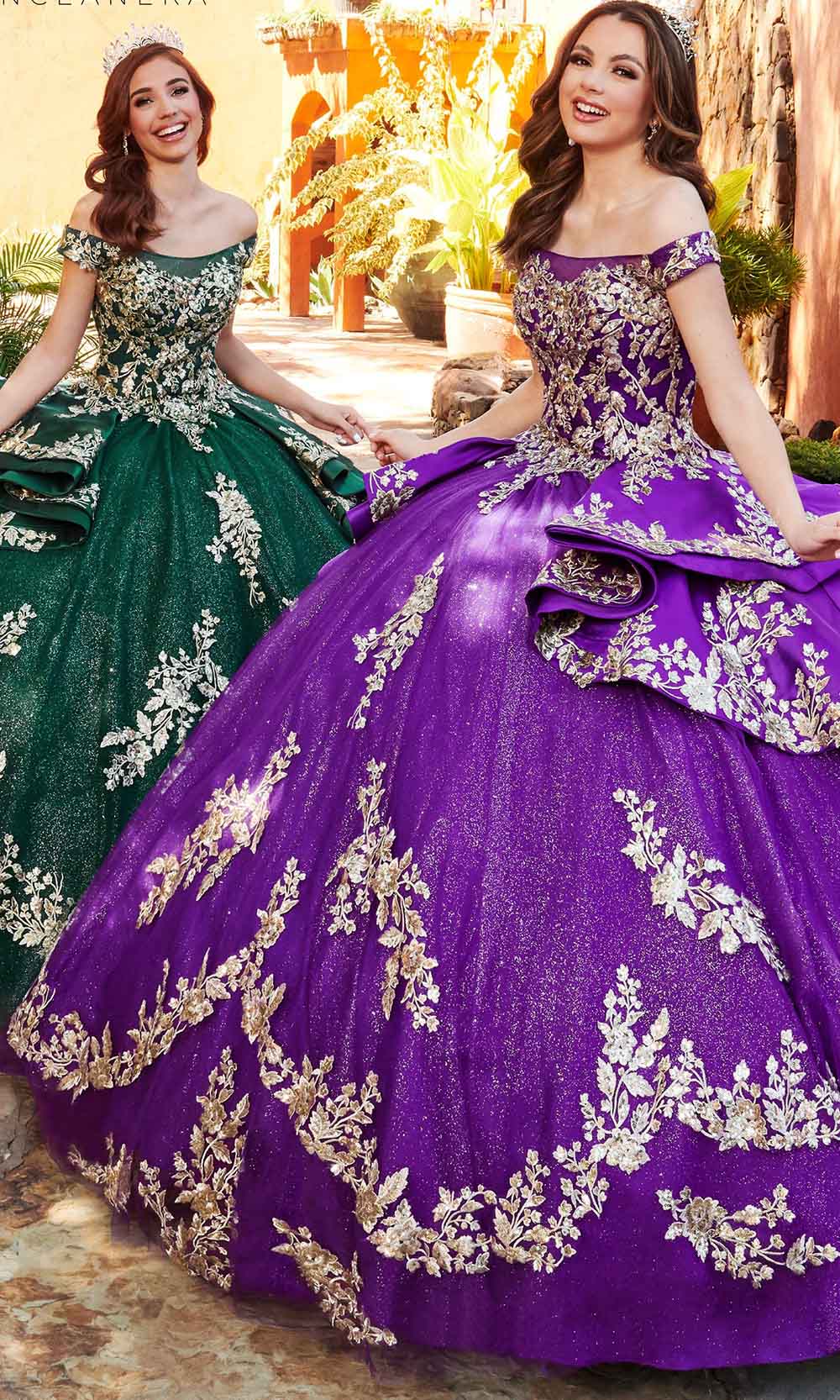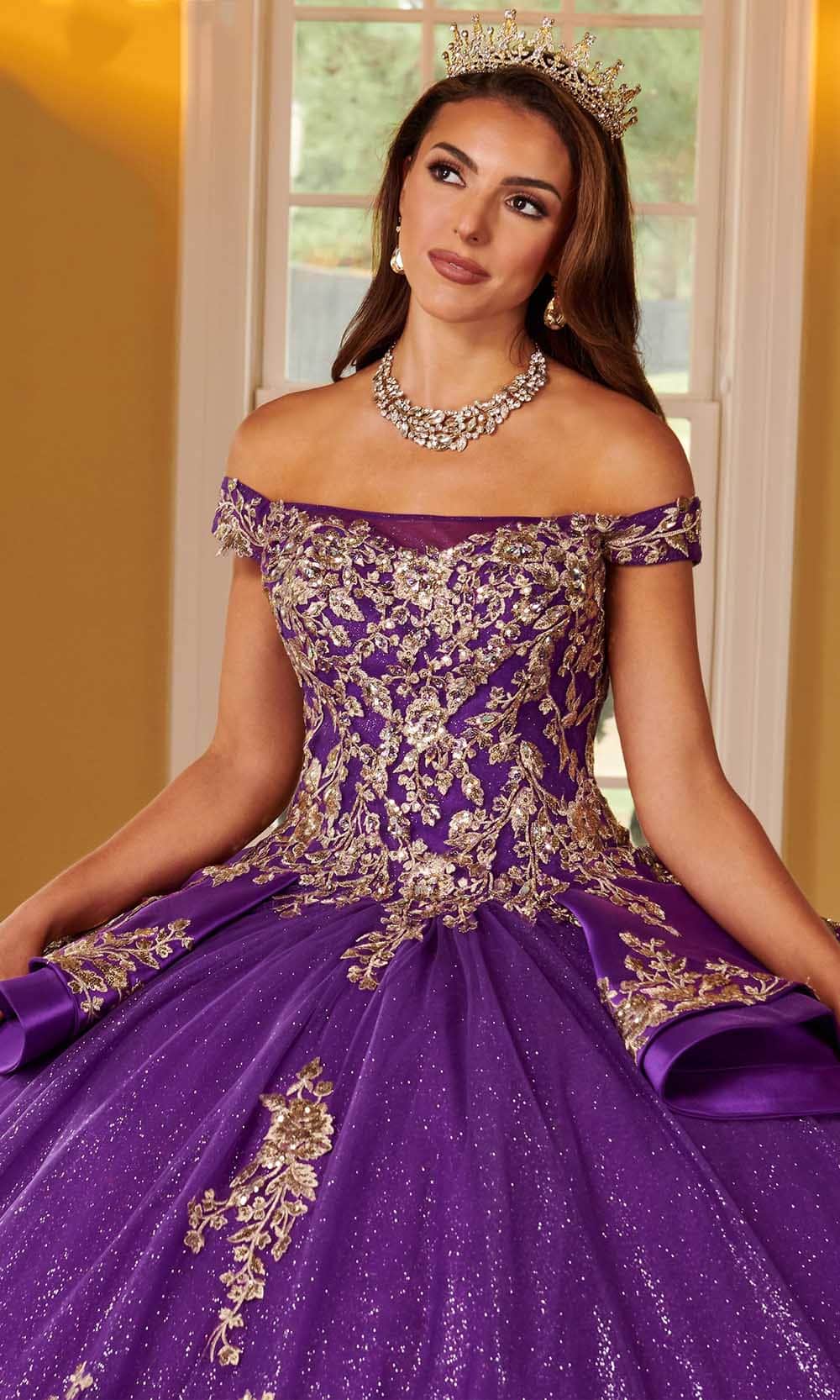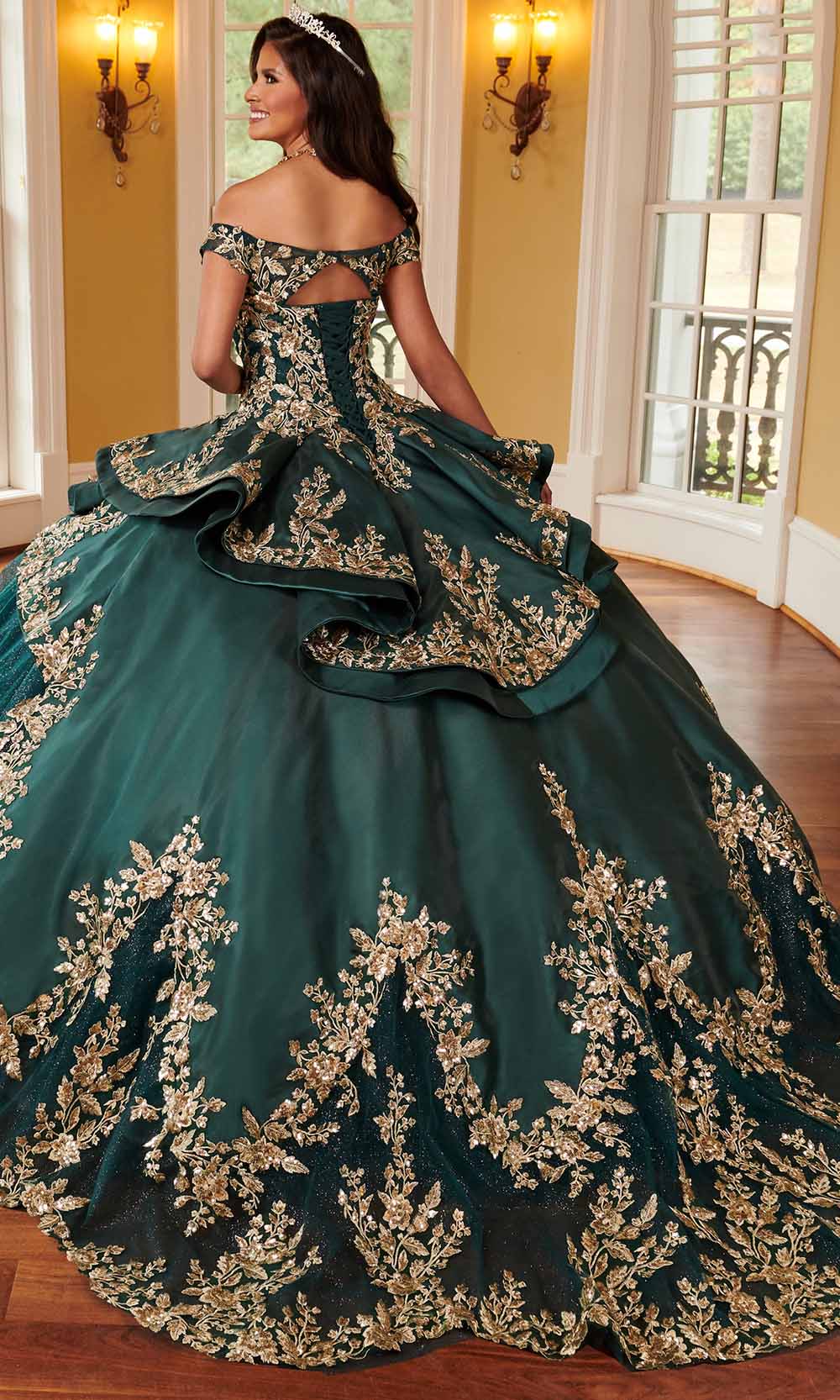 Capture the attention of all with the graceful femininity and refined charm of the Rachel Allan RQ2162 Quinceanera creation. This captivating stunner showcases a meticulously tailored bodice embellished with exquisite gilded lace appliques, enhanced by glimmering rhinestones. The off-shoulder neckline is perfectly paired with a corset design back accented with a triangular cutout. The opulent ballgown skirt is adorned with ornate appliques while featuring a peplum like overlay as it traverse into a voluminous design and a sweeping train. Radiate beauty and grace at your special event in this intricately adorned Rachel Allan RQ2162 Quinceanera masterpiece. Models are wearing the Emerald Gold, Fuchsia Gold, and Purple Gold colors.