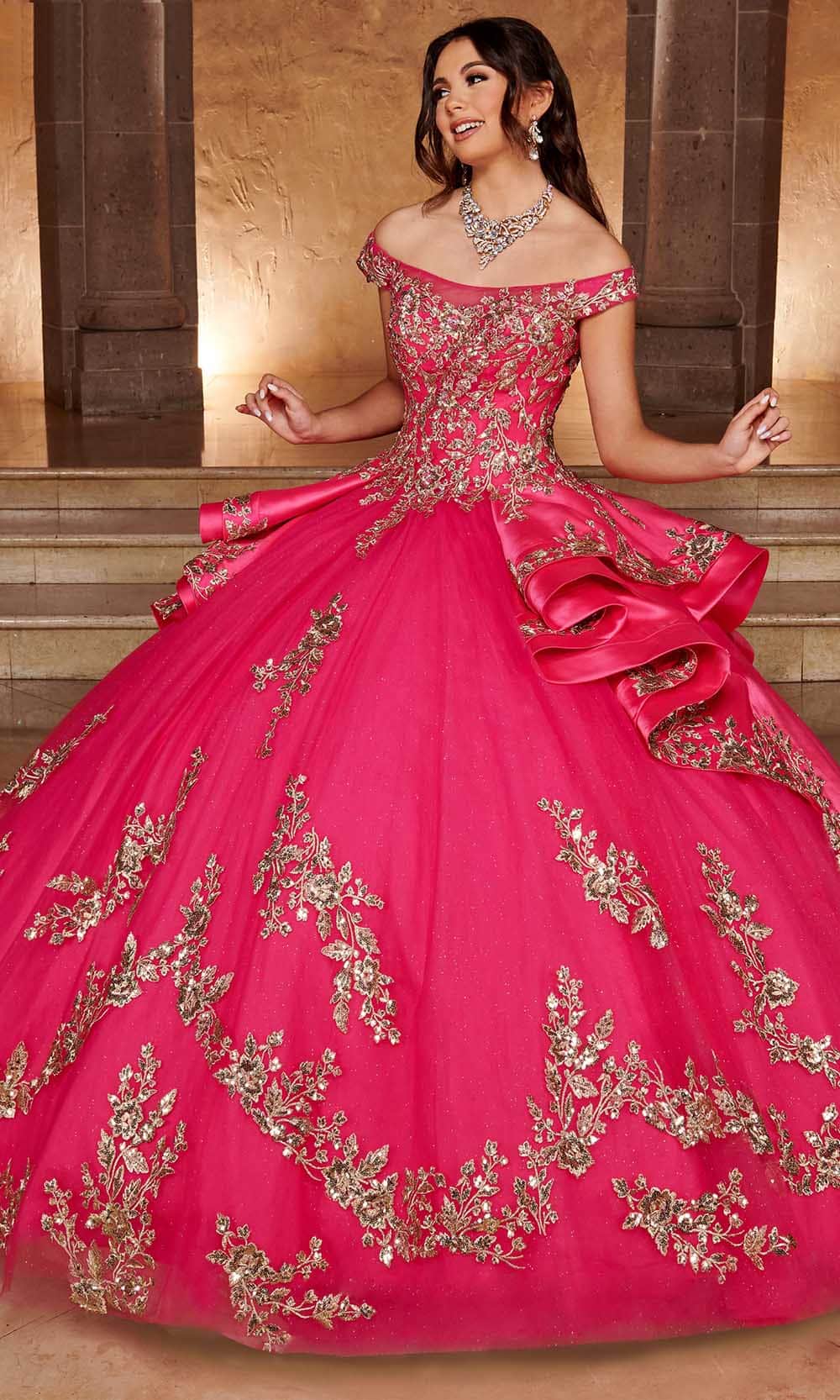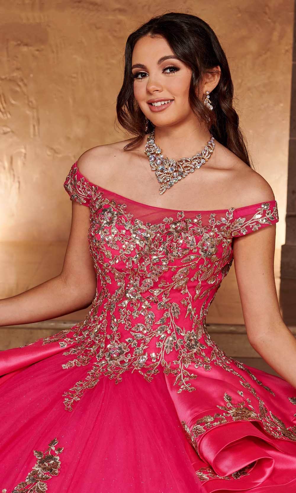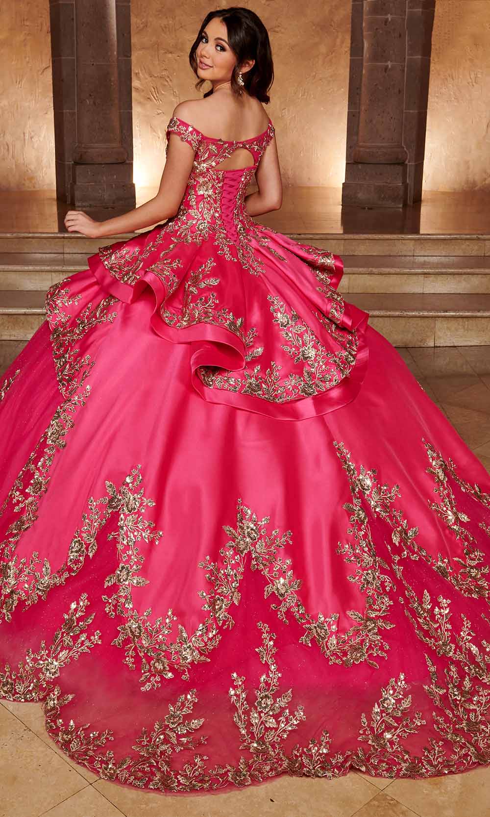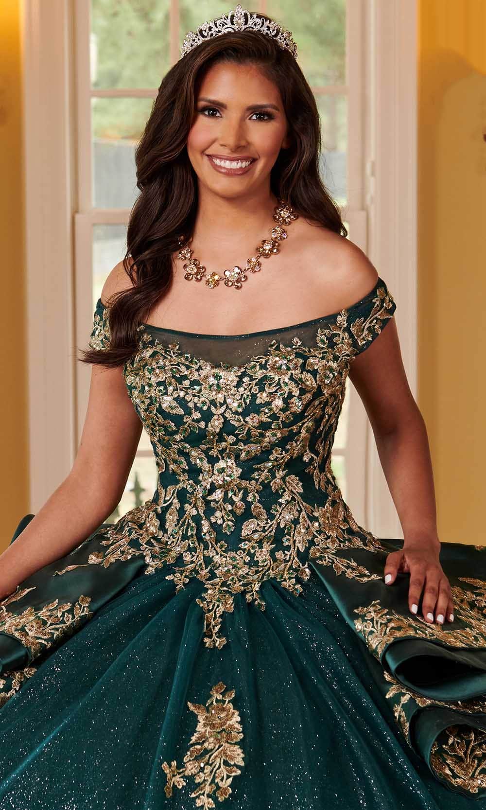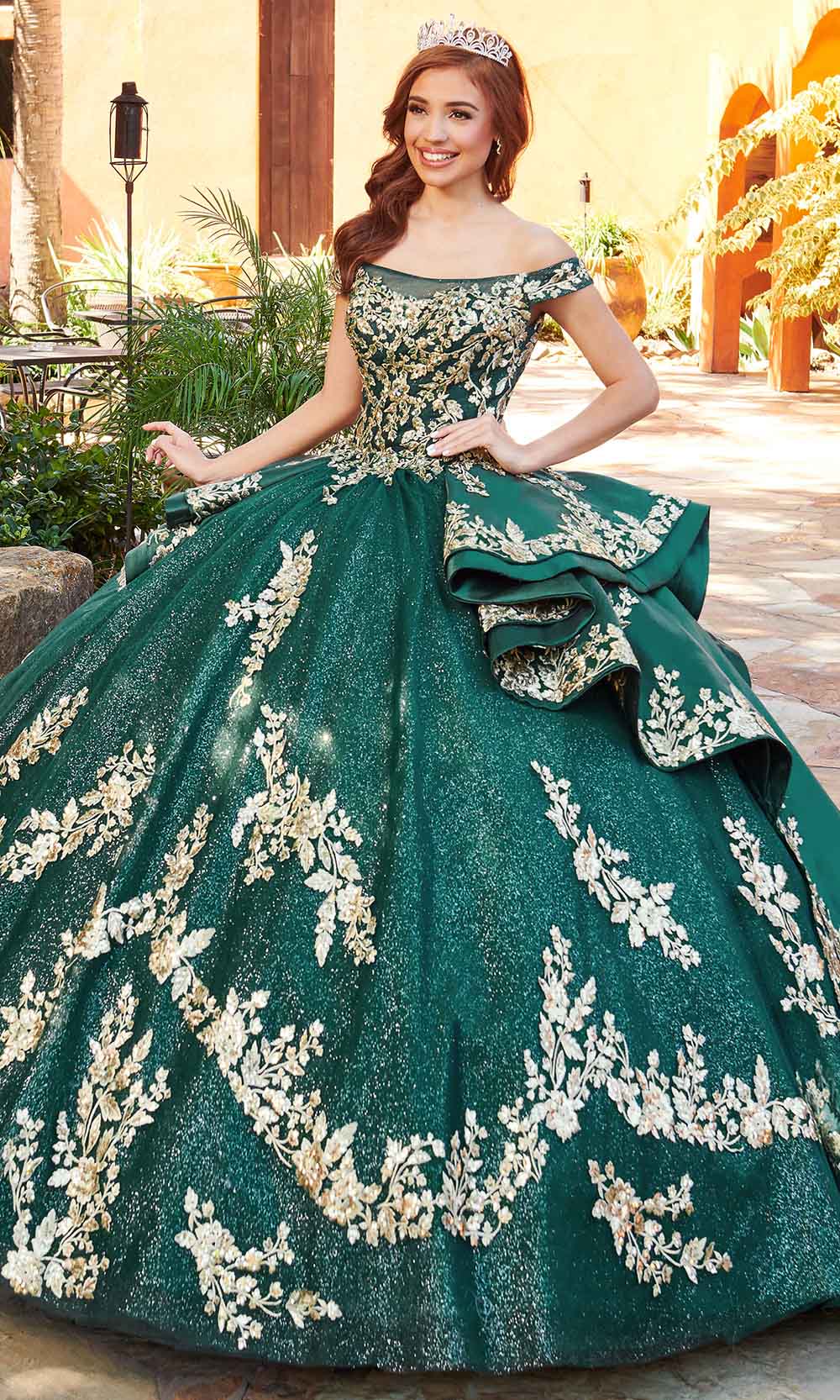 Capture the attention of all with the graceful femininity and refined charm of the Rachel Allan RQ2162 Quinceanera creation. This captivating stunner showcases a meticulously tailored bodice embellished with exquisite gilded lace appliques, enhanced by glimmering rhinestones. The off-shoulder neckline is perfectly paired with a corset design back accented with a triangular cutout. The opulent ballgown skirt is adorned with ornate appliques while featuring a peplum like overlay as it traverse into a voluminous design and a sweeping train. Radiate beauty and grace at your special event in this intricately adorned Rachel Allan RQ2162 Quinceanera masterpiece. Models are wearing the Emerald Gold, Fuchsia Gold, and Purple Gold colors.