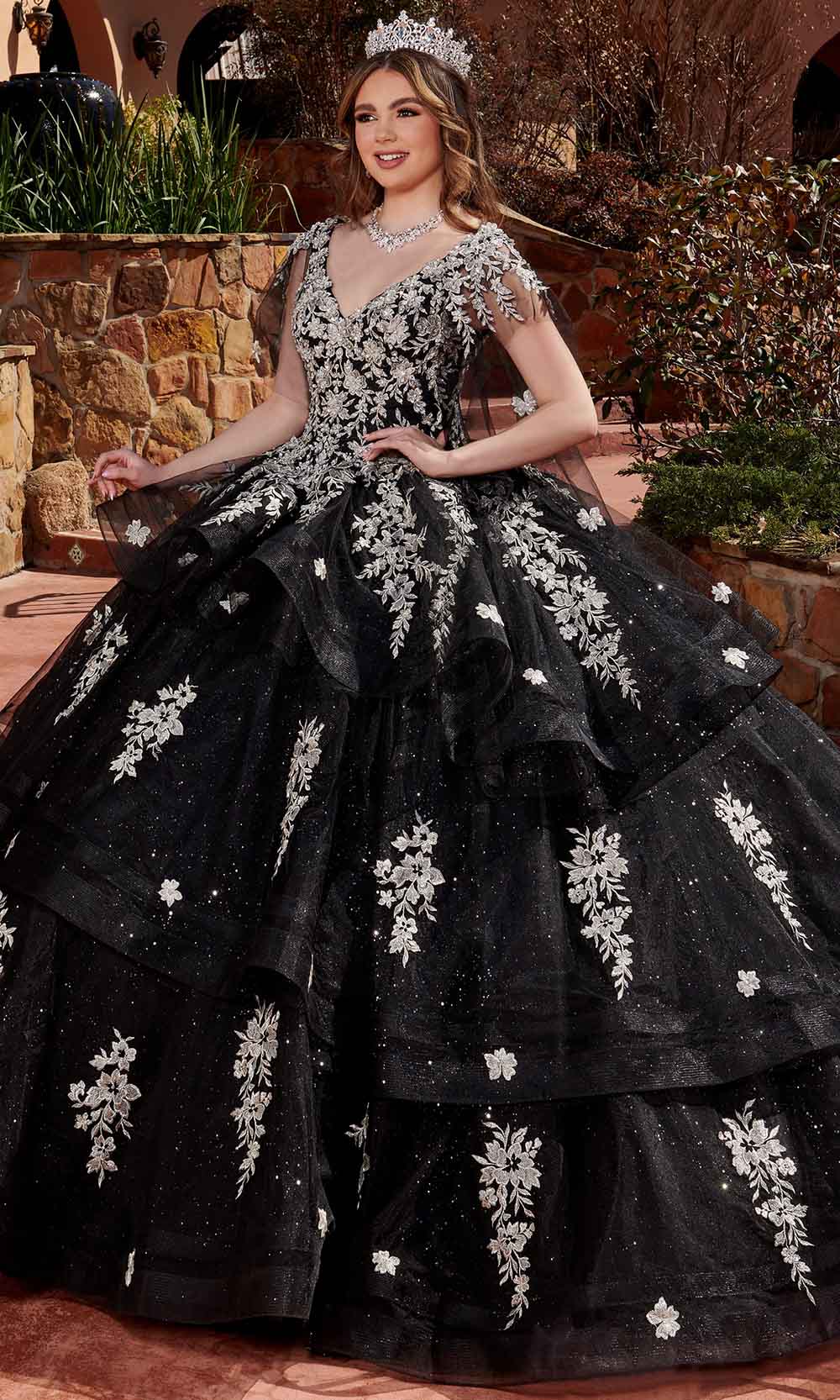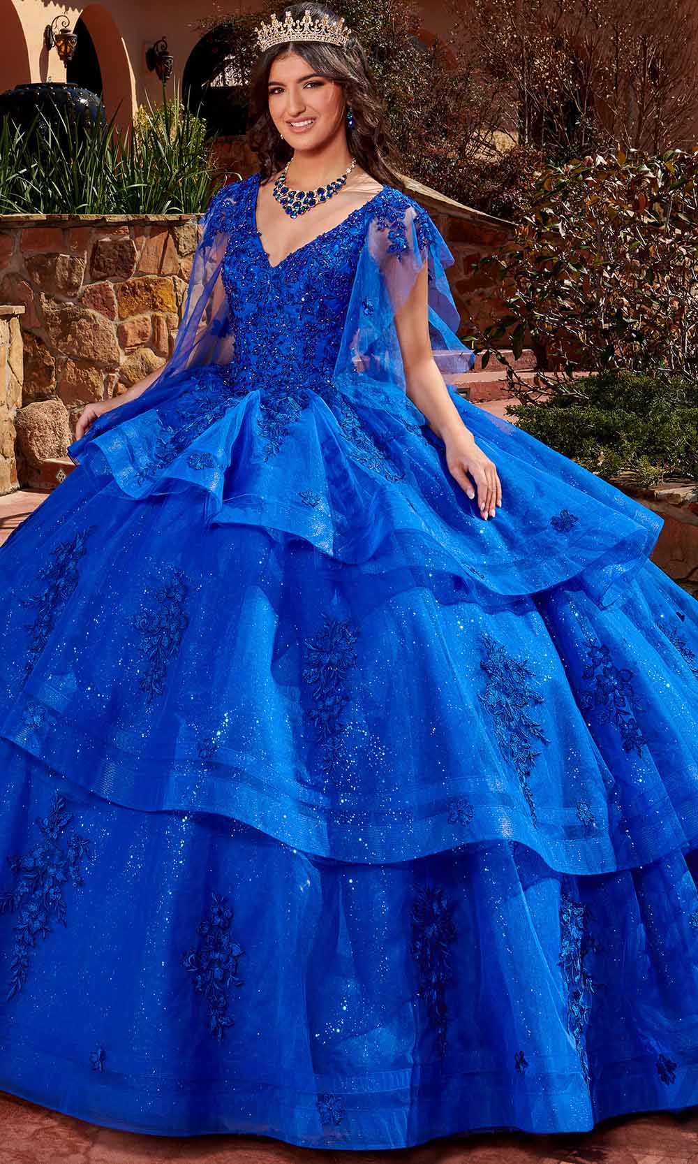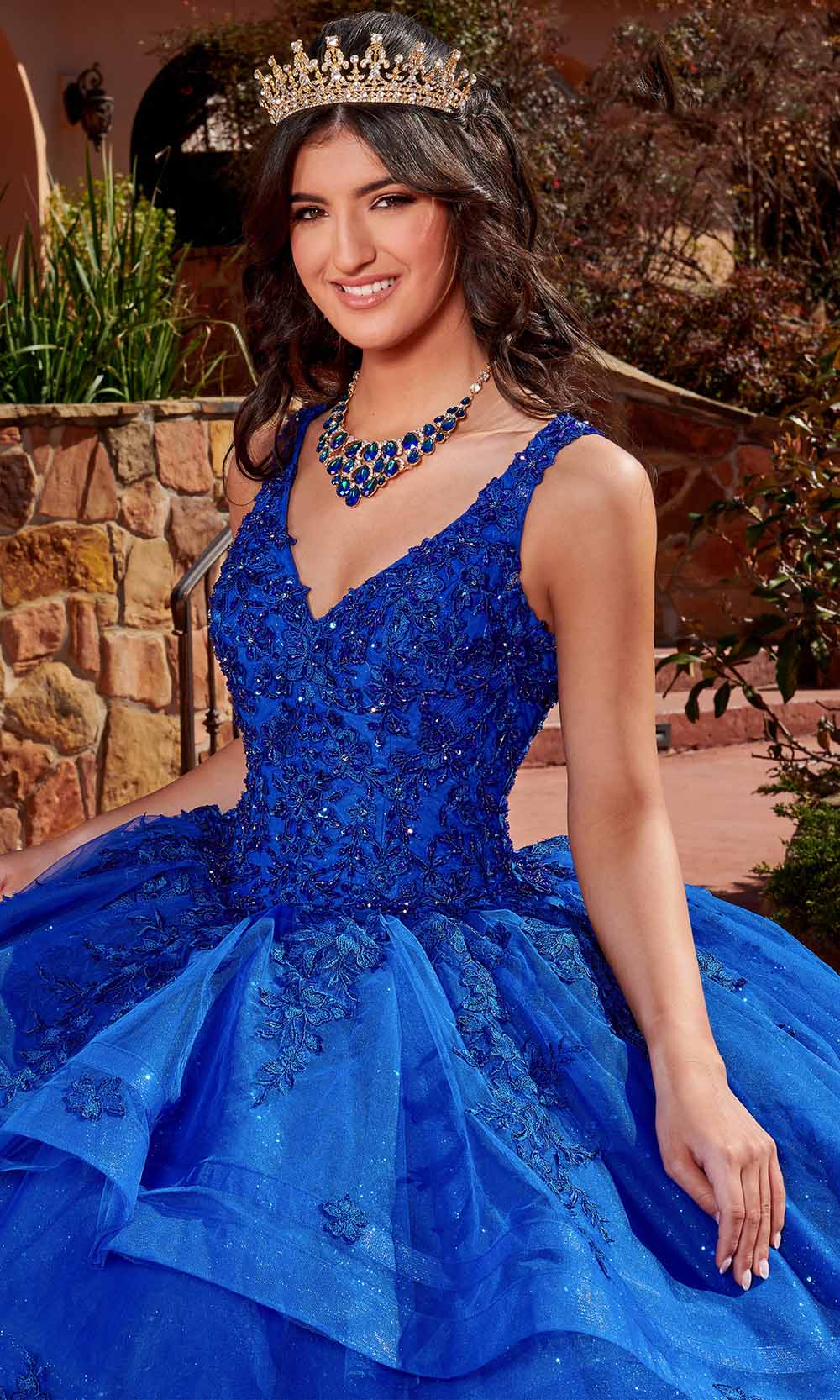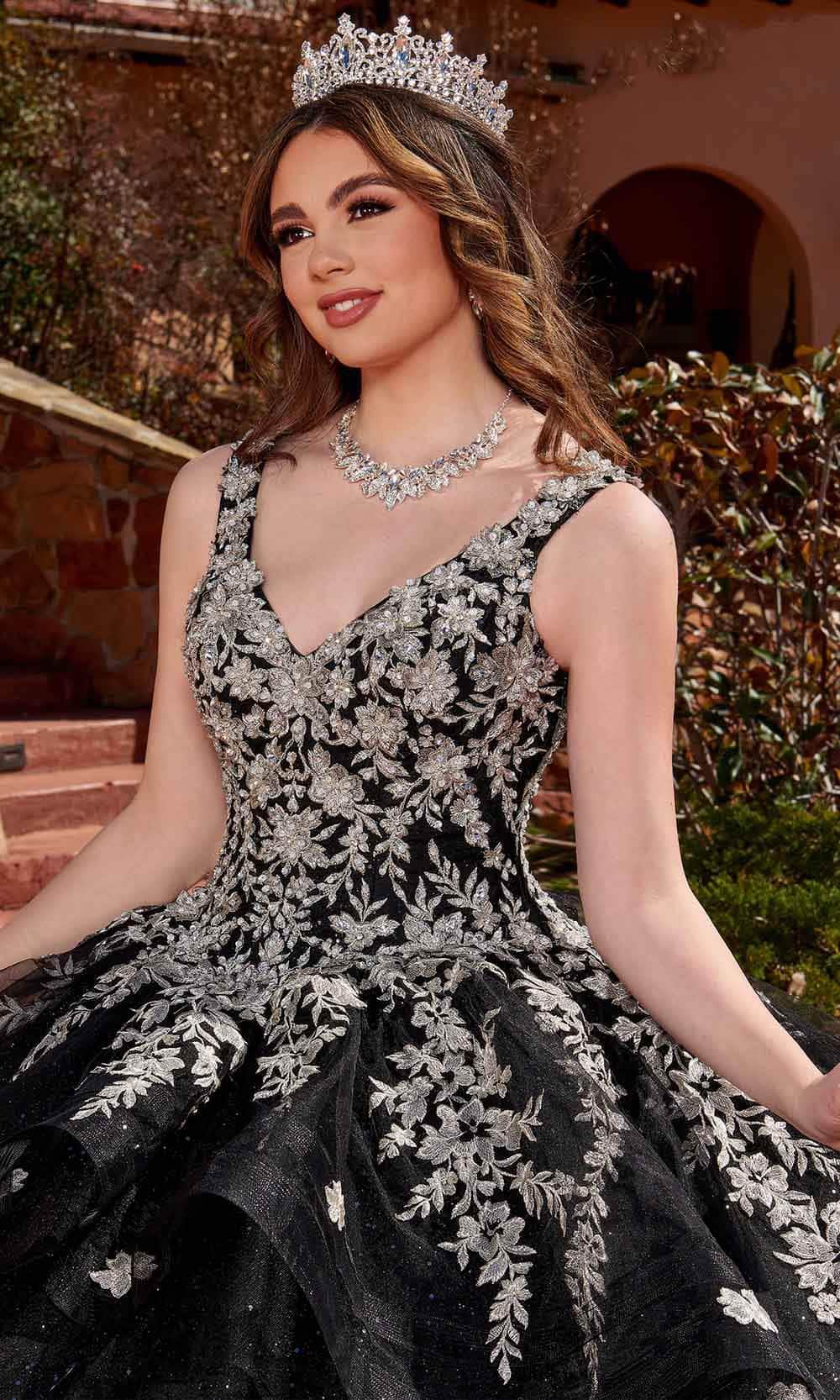 Make everyone stop and admire your beauty in this Rachel Allan RQ2173 masterpiece. Striking from top to bottom, this sleeveless gown is adorned with floral embroidery and a beaded accent. Wide shoulder straps are used to support the deep v-neckline and midrise lace-up back. The voluminous ballgown skirt showcases ruffled tiers, horsehair hem, and ends in a dramatic sweeping train. A matching detachable sheer sleeve is included. This Rachel Allan RQ2173 gown will not let anyone miss your grand entrance. Models are wearing the Black Silver, Champagne Gold, and Royal colors.