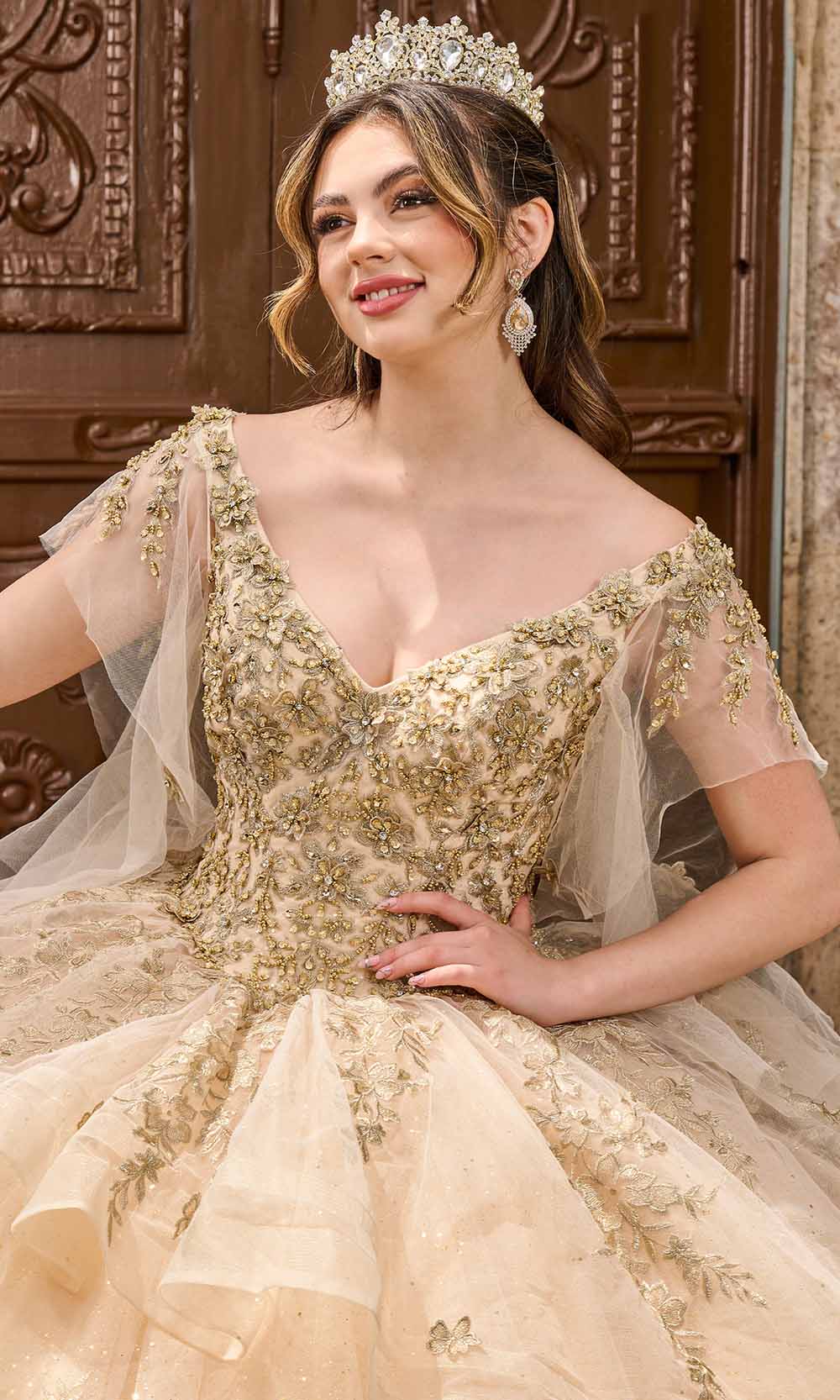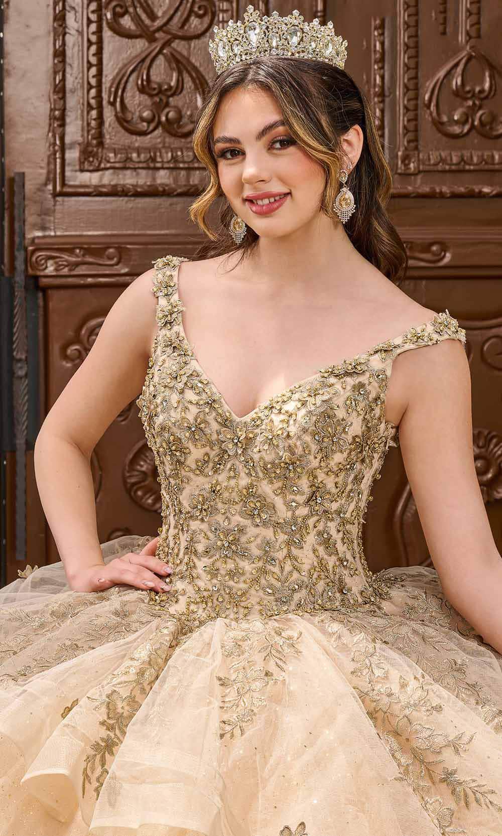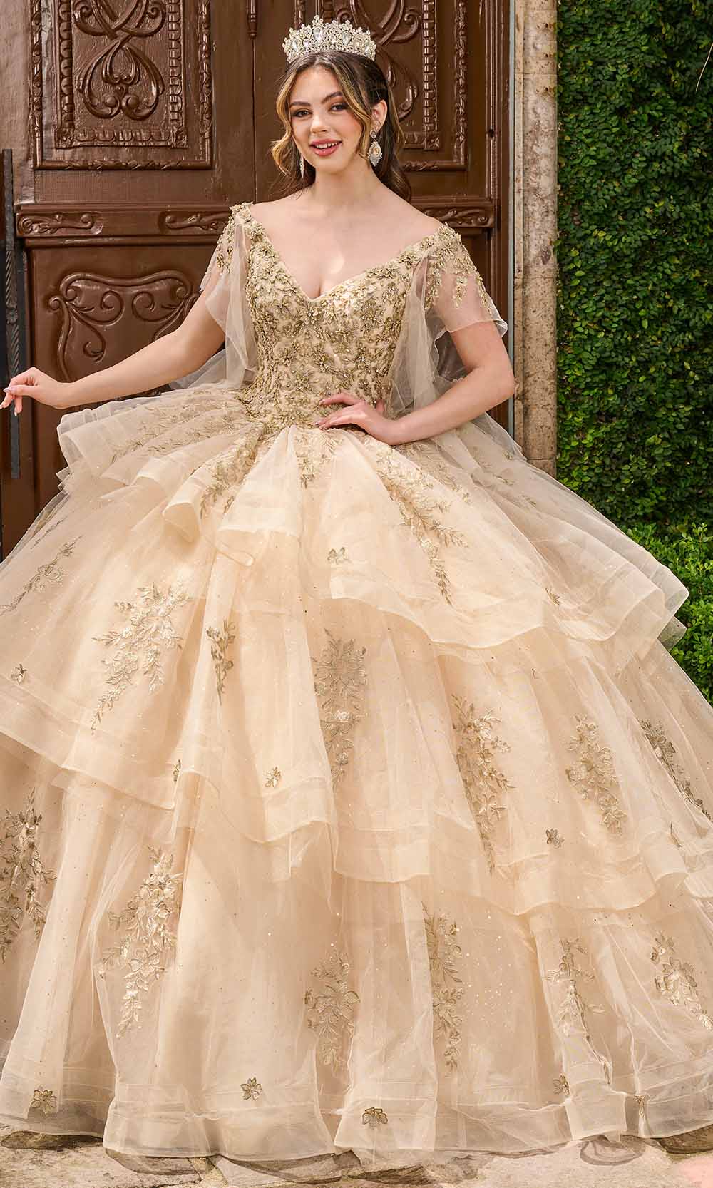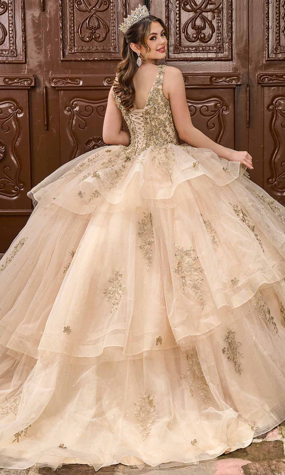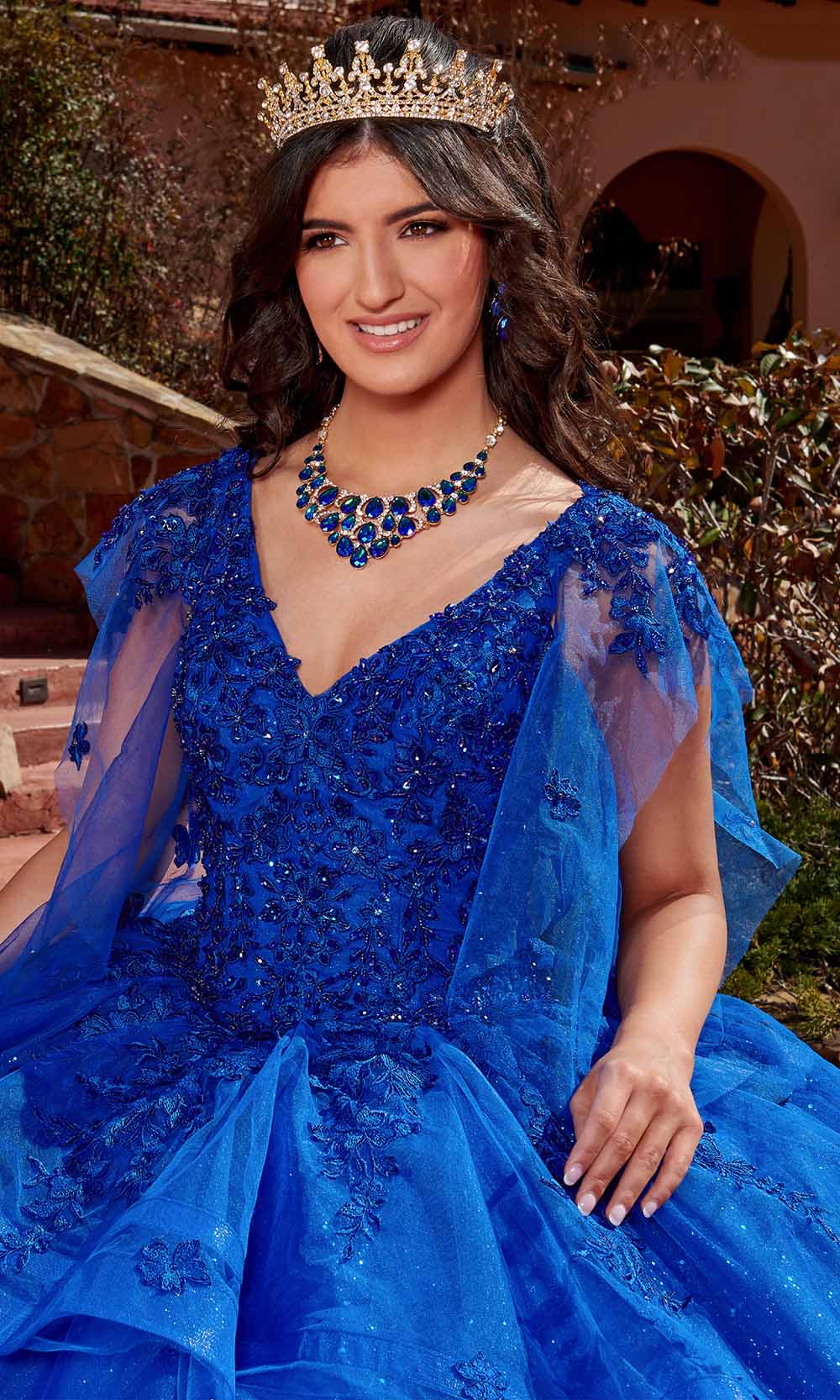 Make everyone stop and admire your beauty in this Rachel Allan RQ2173 masterpiece. Striking from top to bottom, this sleeveless gown is adorned with floral embroidery and a beaded accent. Wide shoulder straps are used to support the deep v-neckline and midrise lace-up back. The voluminous ballgown skirt showcases ruffled tiers, horsehair hem, and ends in a dramatic sweeping train. A matching detachable sheer sleeve is included. This Rachel Allan RQ2173 gown will not let anyone miss your grand entrance. Models are wearing the Black Silver, Champagne Gold, and Royal colors.