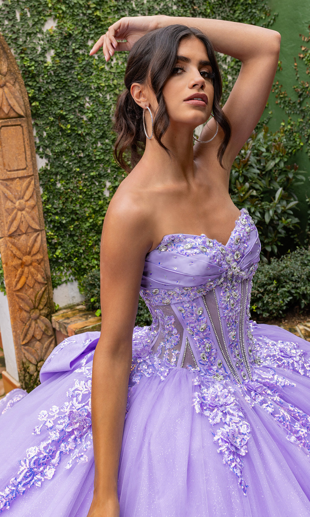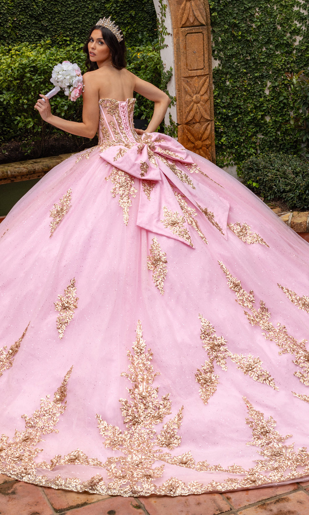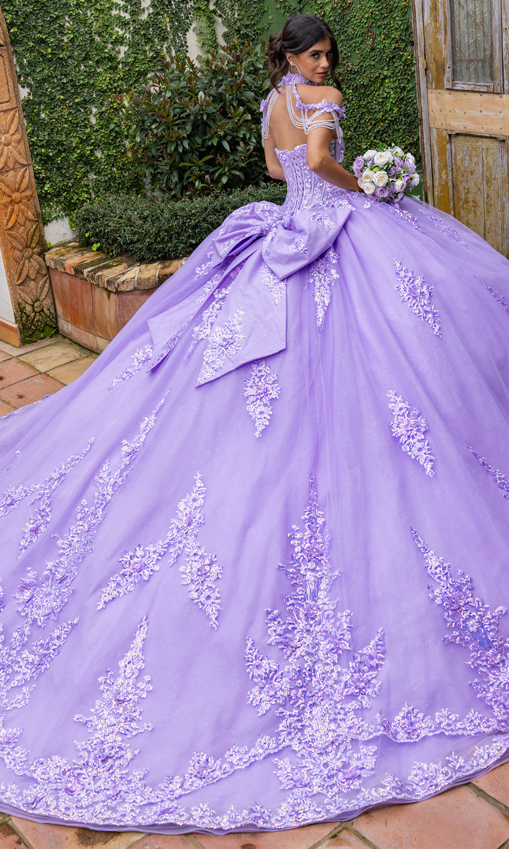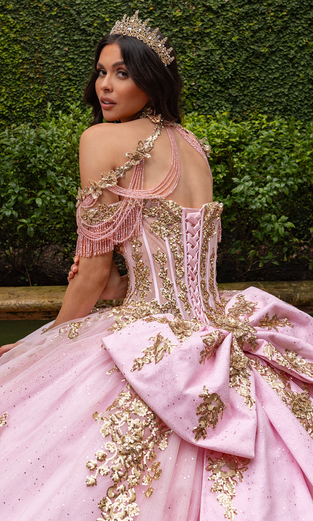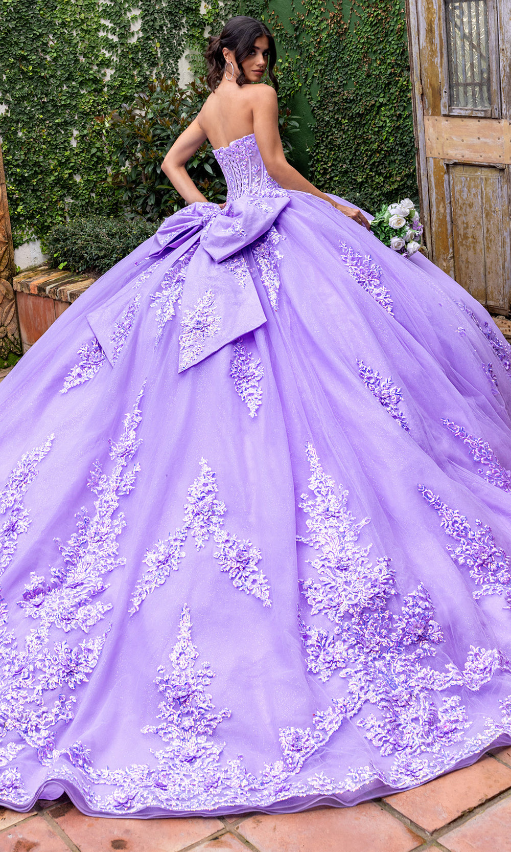 Rachel Allan RQ2225 is a gown that fuses botanical beauty with polished refinement, making it a standout choice for elegant milestones. The strapless sweetheart neckline frames a structured corset bodice, embellished with dimensional floral appliques, beaded and sequins that continue through the skirt. Beneath, layers of glitter tulle add shimmering movement, while a Basque waist creates definition and poise. Rachel Allan RQ2225 is an ideal expression of delicacy and celebration, crafted to shine from ceremony to photo memories. Models are wearing Blush Gold, Ivory Gold, and Lilac colors.