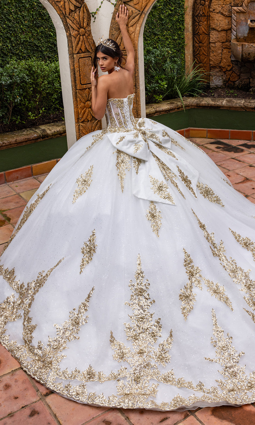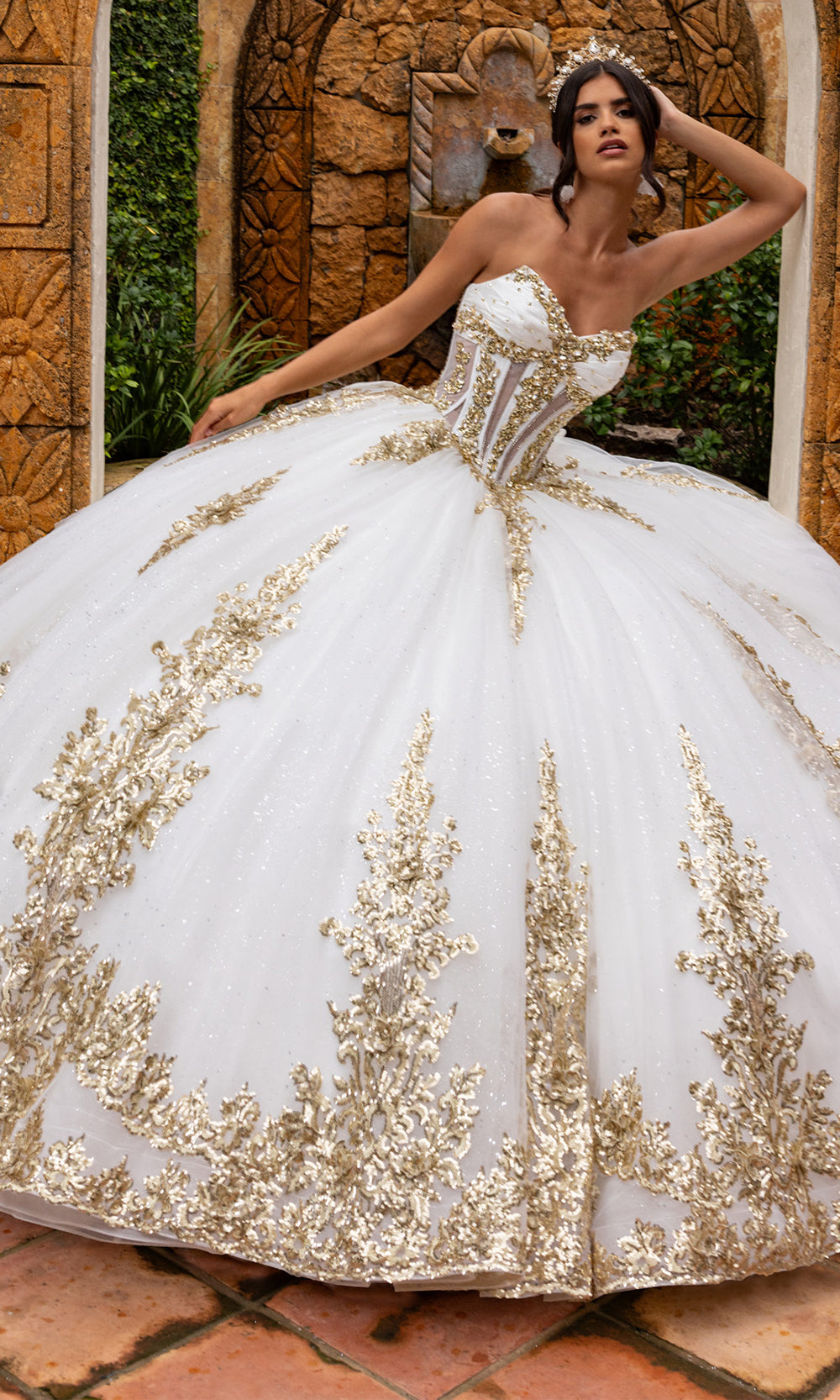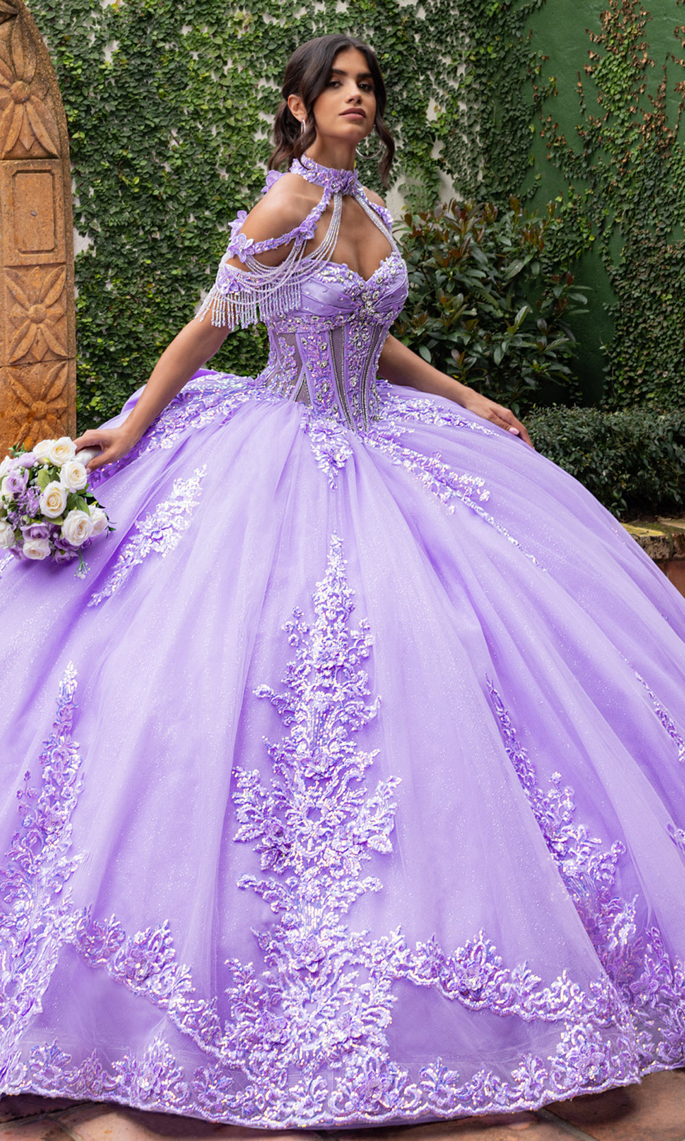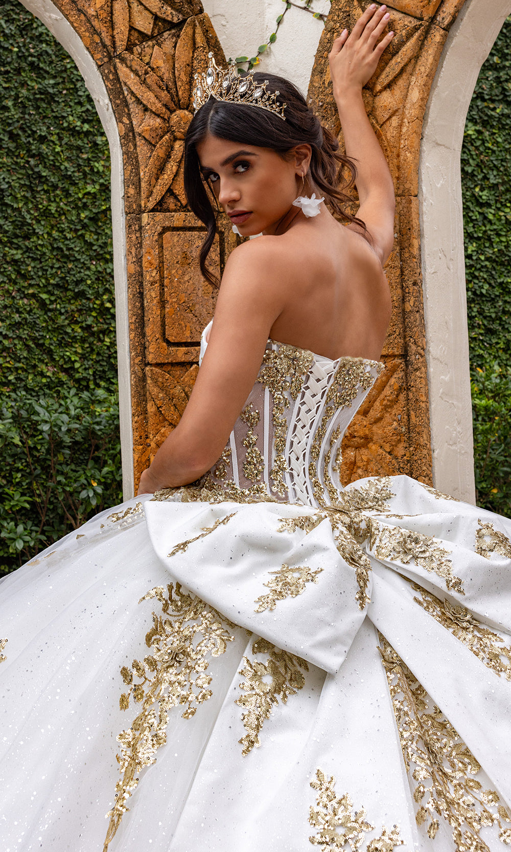 Rachel Allan RQ2225 is a gown that fuses botanical beauty with polished refinement, making it a standout choice for elegant milestones. The strapless sweetheart neckline frames a structured corset bodice, embellished with dimensional floral appliques, beaded and sequins that continue through the skirt. Beneath, layers of glitter tulle add shimmering movement, while a Basque waist creates definition and poise. Rachel Allan RQ2225 is an ideal expression of delicacy and celebration, crafted to shine from ceremony to photo memories. Models are wearing Blush Gold, Ivory Gold, and Lilac colors.
