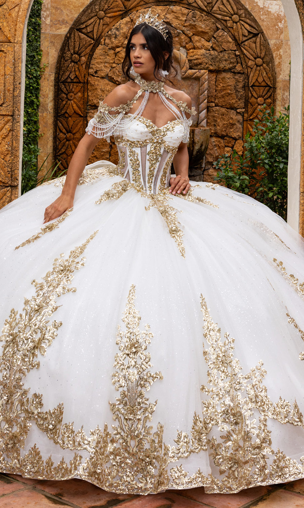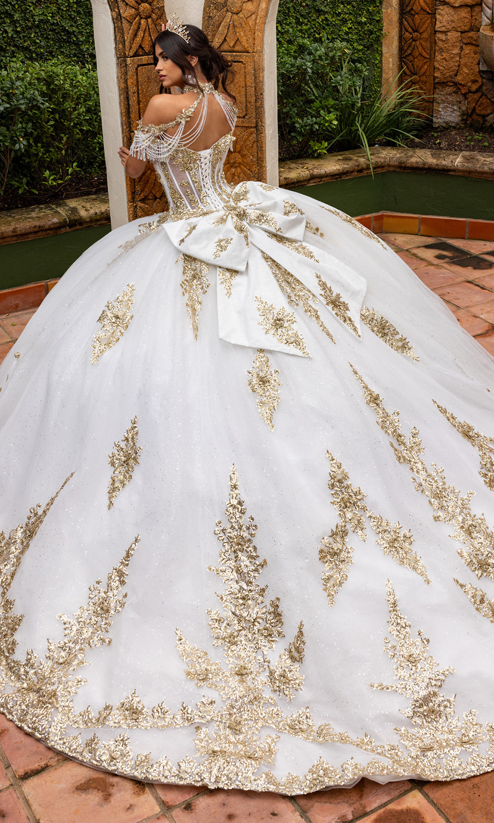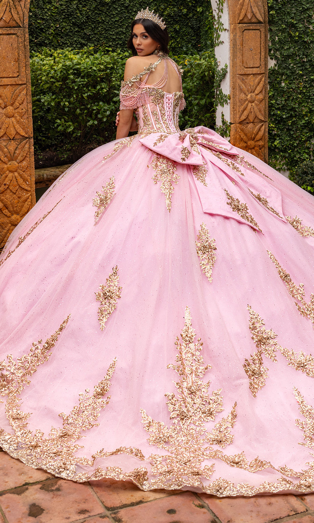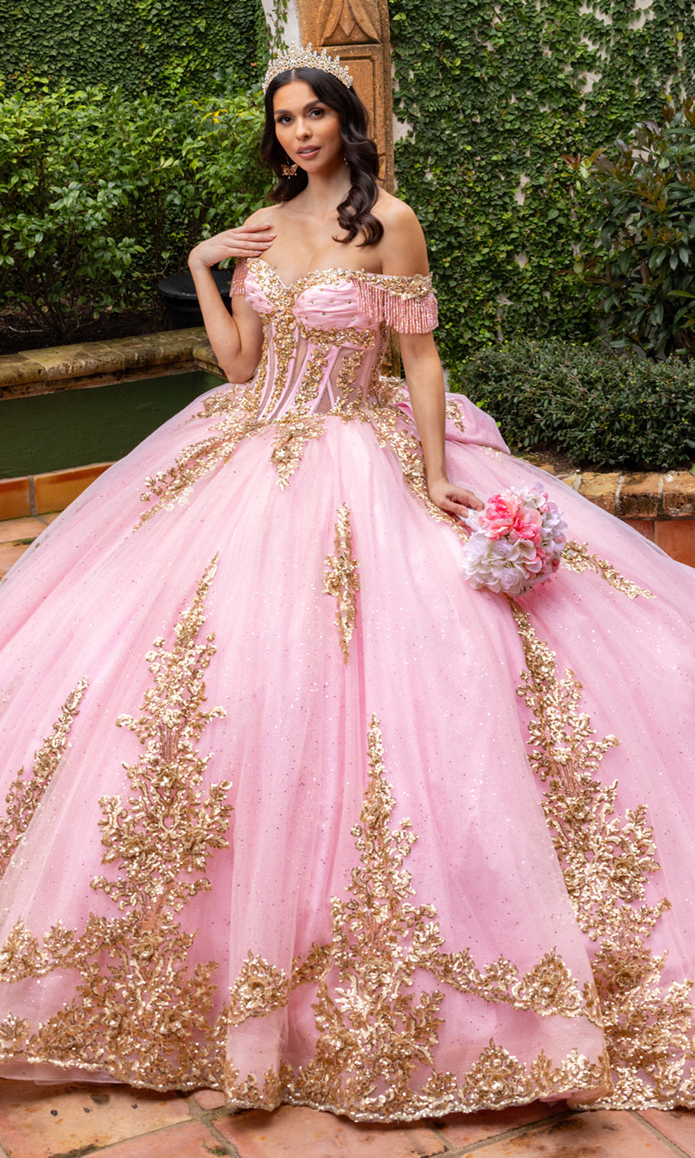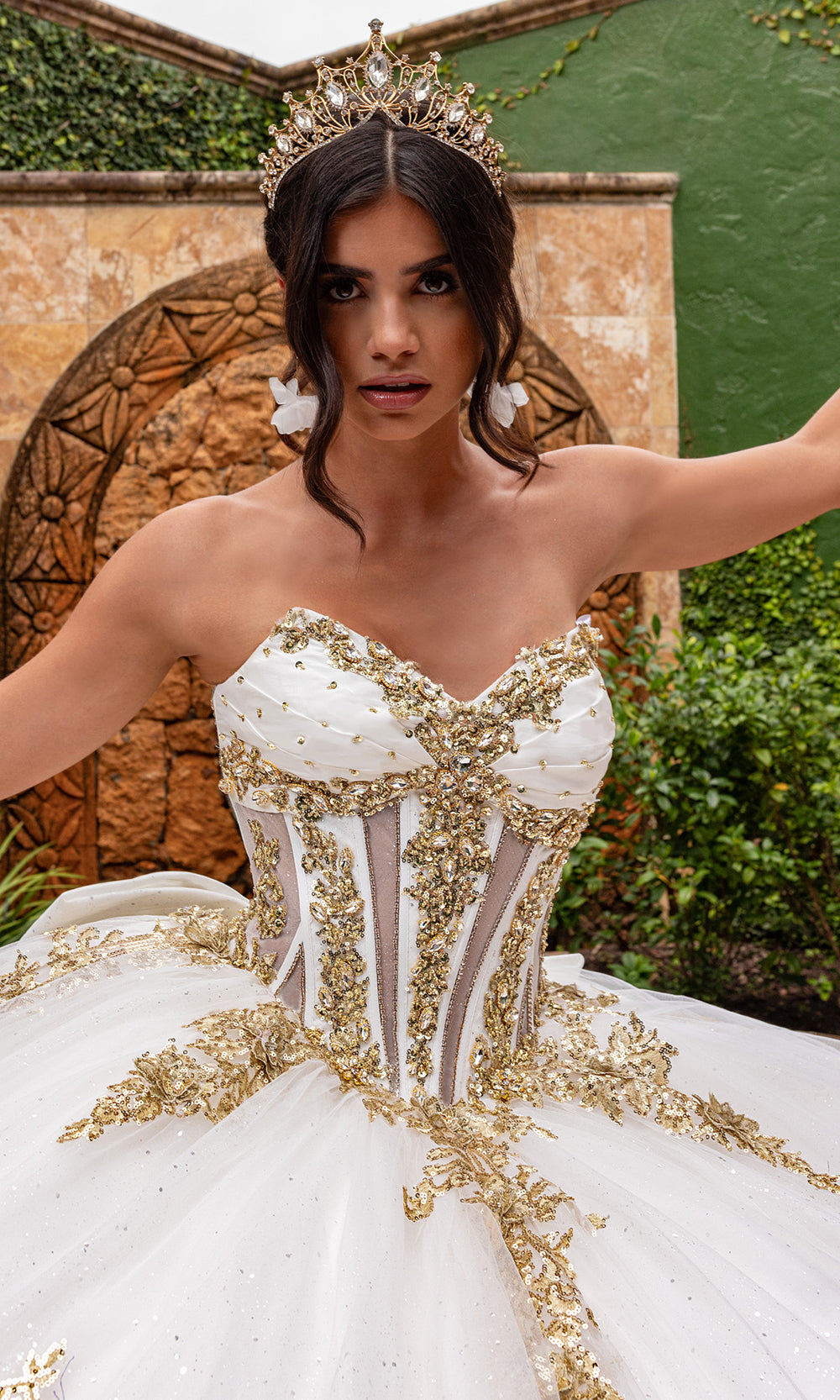 Rachel Allan RQ2225 is a gown that fuses botanical beauty with polished refinement, making it a standout choice for elegant milestones. The strapless sweetheart neckline frames a structured corset bodice, embellished with dimensional floral appliques, beaded and sequins that continue through the skirt. Beneath, layers of glitter tulle add shimmering movement, while a Basque waist creates definition and poise. Rachel Allan RQ2225 is an ideal expression of delicacy and celebration, crafted to shine from ceremony to photo memories. Models are wearing Blush Gold, Ivory Gold, and Lilac colors.