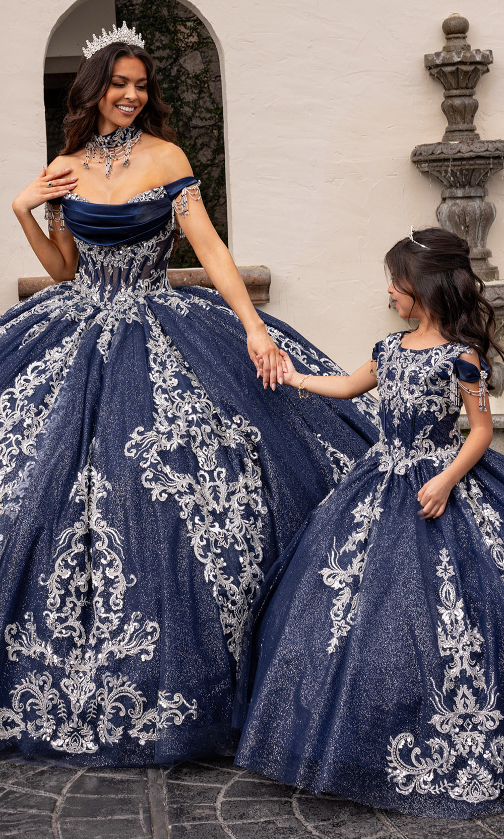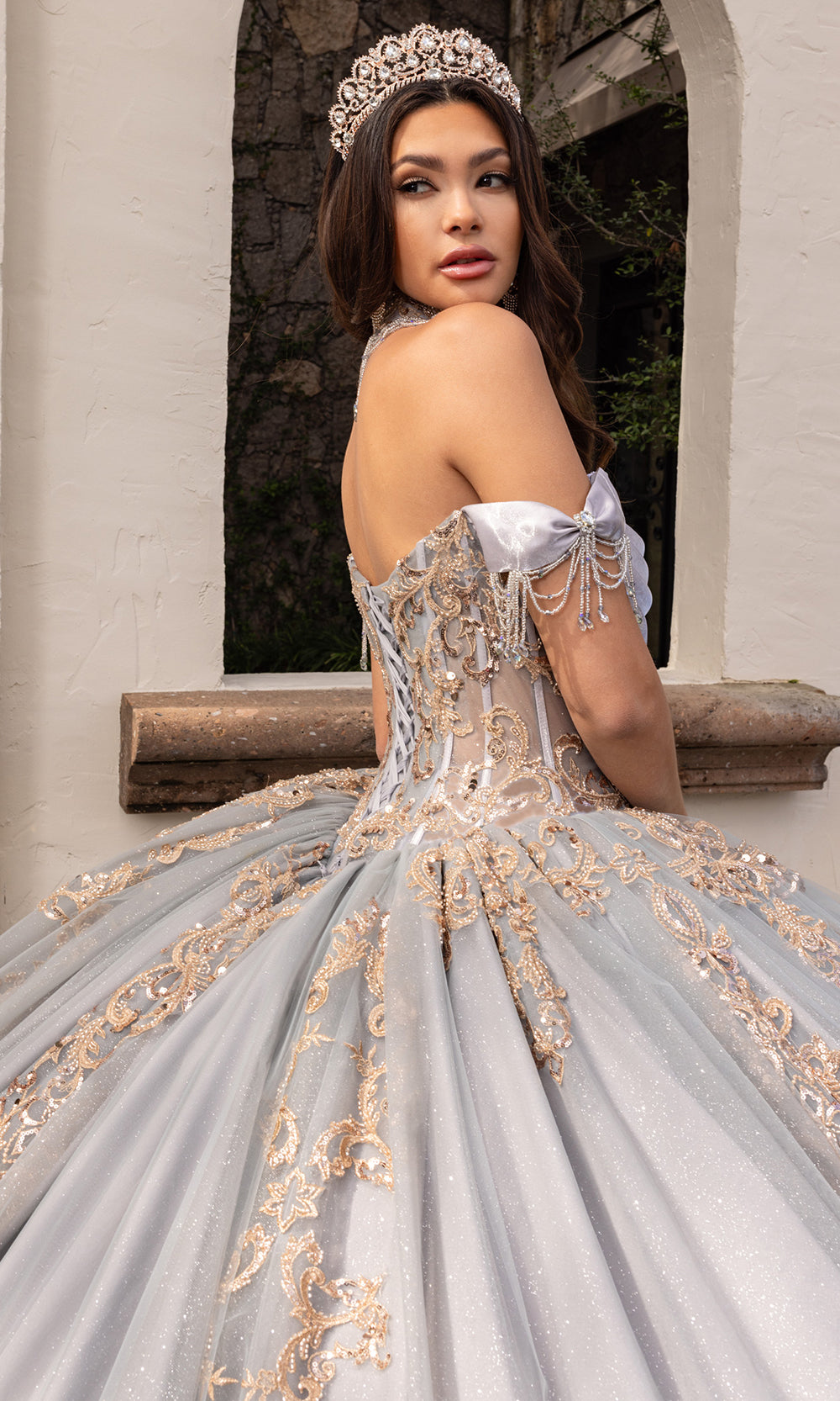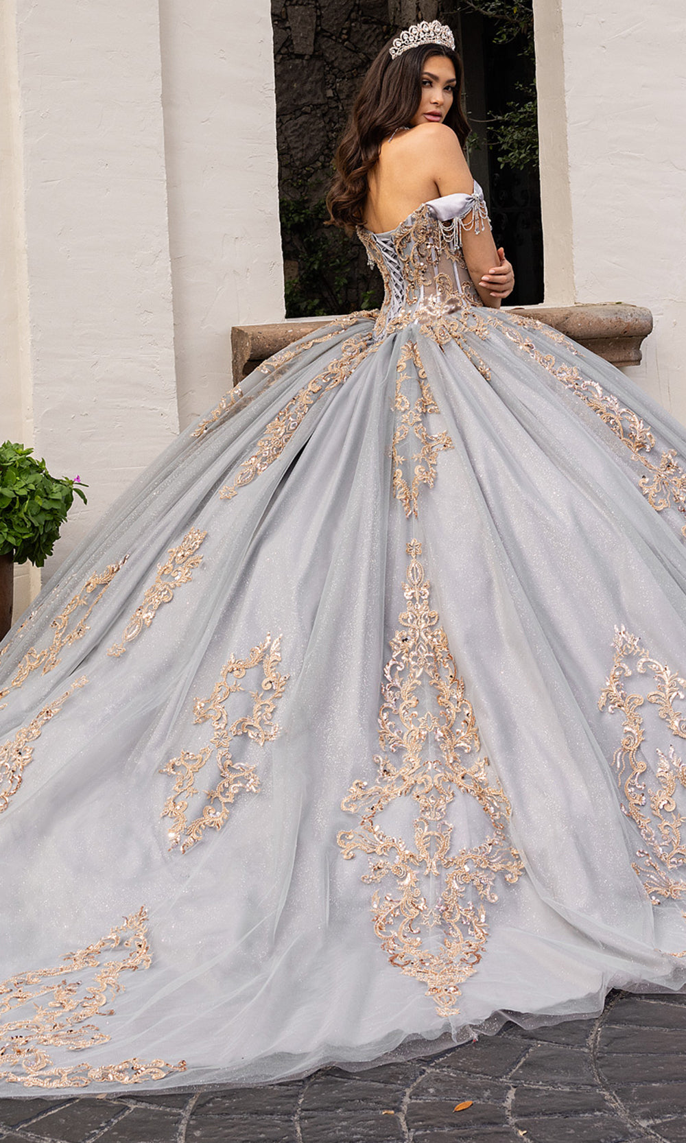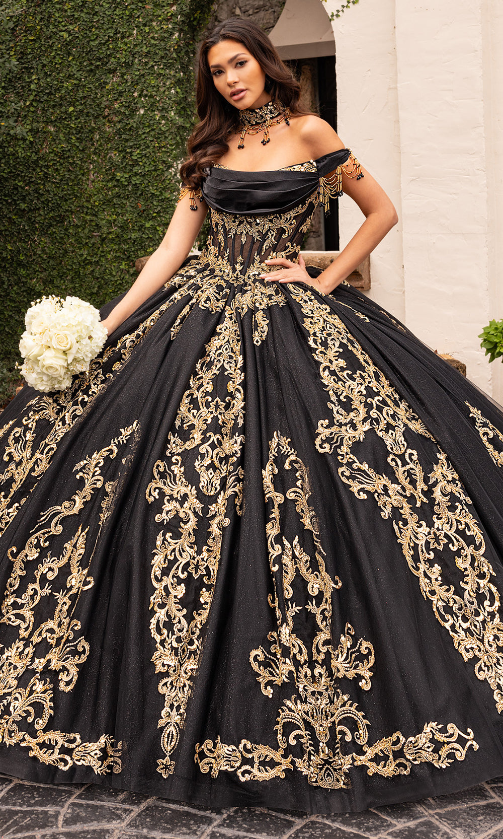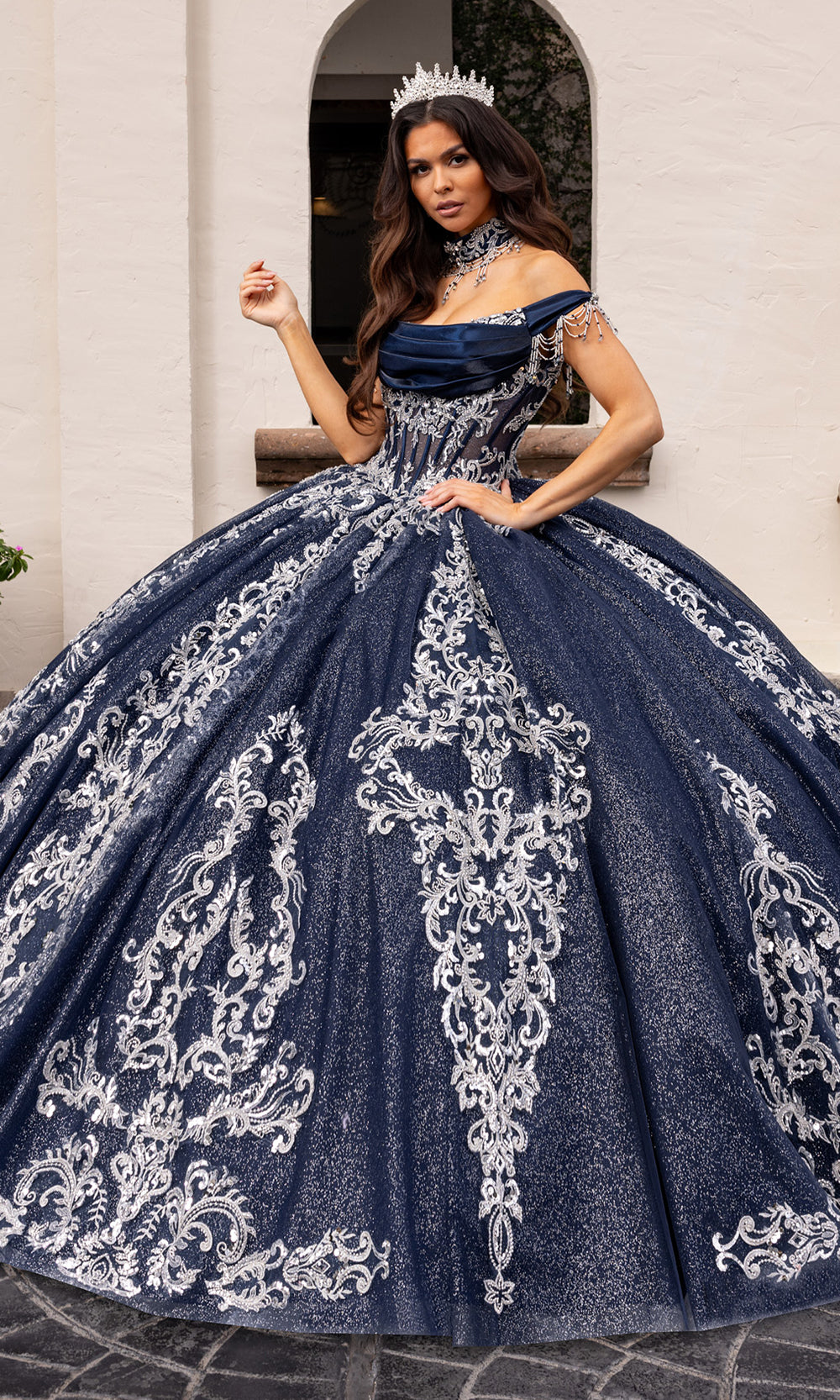 An opulent fusion of baroque inspiration and modern design, Rachel Allan RQ2230 is a vision of regal sophistication. This statement ballgown boasts an off-shoulder sleeves and cowl neckline with draped satin detailing, layered over a structured corset fit. Embroidered metallic scrolls and beadings create intricate contrast against the glitter tulle, enhancing the sweeping silhouette. Rachel Allan RQ2230 brings couture detail to life for your unforgettable event, offering elegance with a commanding presence. Models are wearing Black Gold, Navy Silver, and Silver Rose Gold colors.