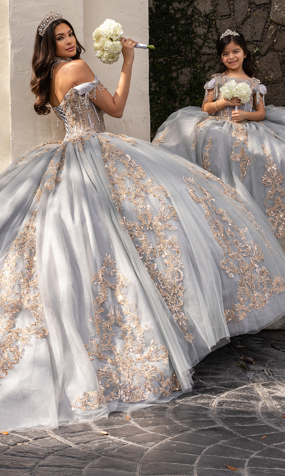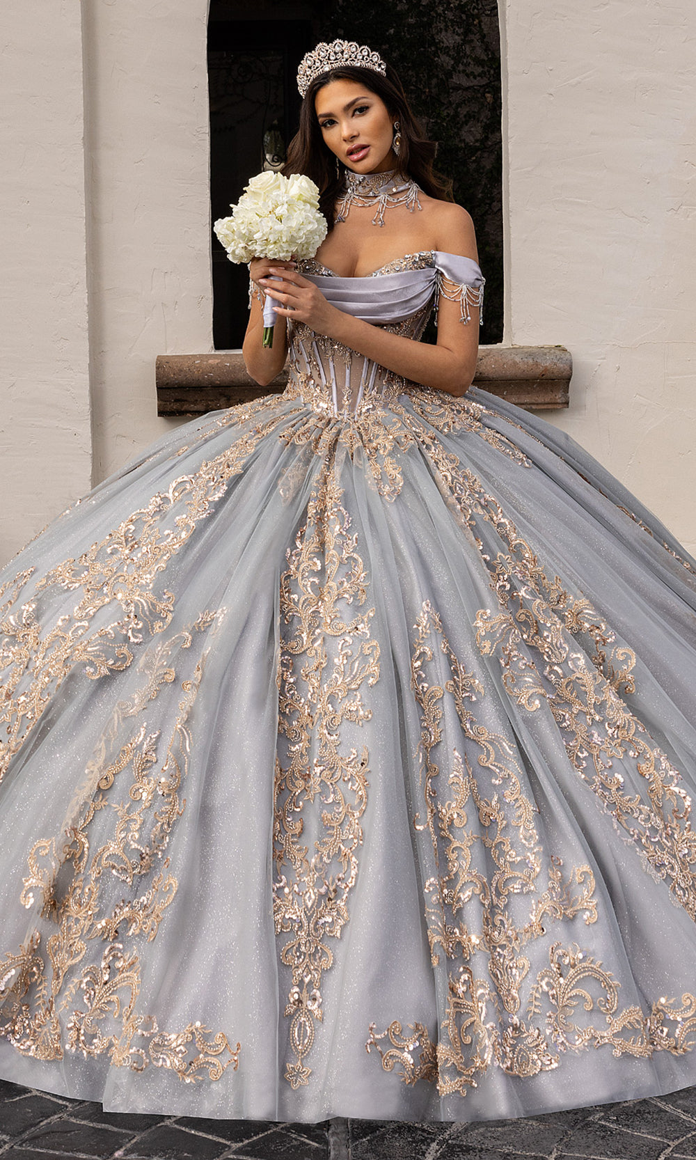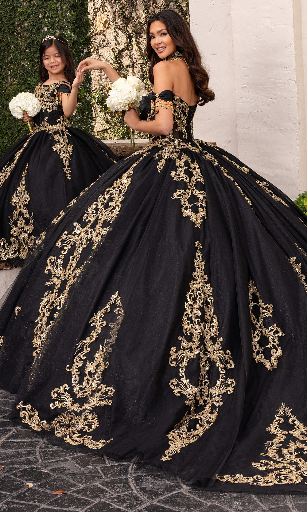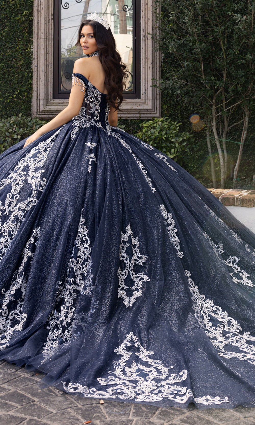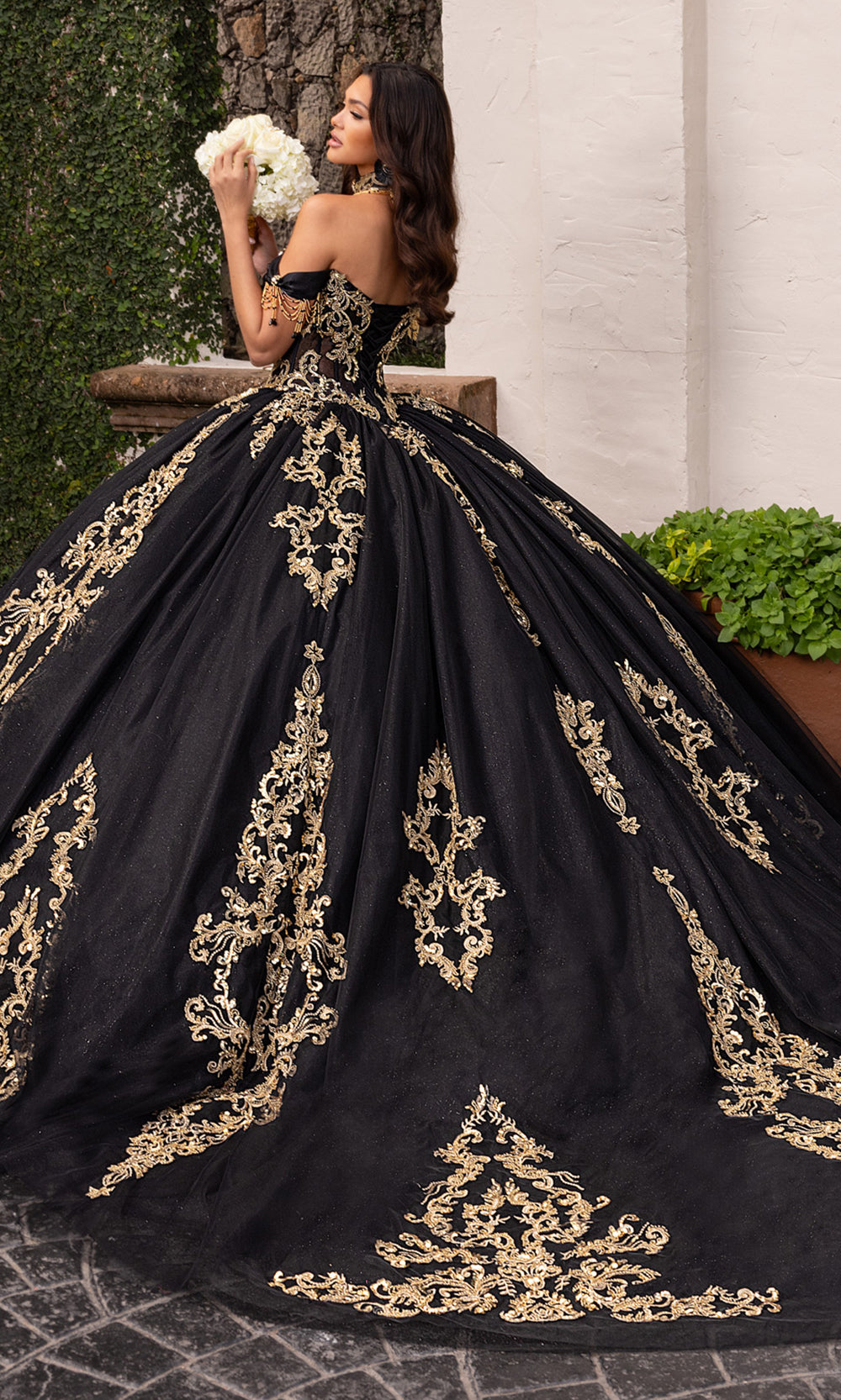 An opulent fusion of baroque inspiration and modern design, Rachel Allan RQ2230 is a vision of regal sophistication. This statement ballgown boasts an off-shoulder sleeves and cowl neckline with draped satin detailing, layered over a structured corset fit. Embroidered metallic scrolls and beadings create intricate contrast against the glitter tulle, enhancing the sweeping silhouette. Rachel Allan RQ2230 brings couture detail to life for your unforgettable event, offering elegance with a commanding presence. Models are wearing Black Gold, Navy Silver, and Silver Rose Gold colors.