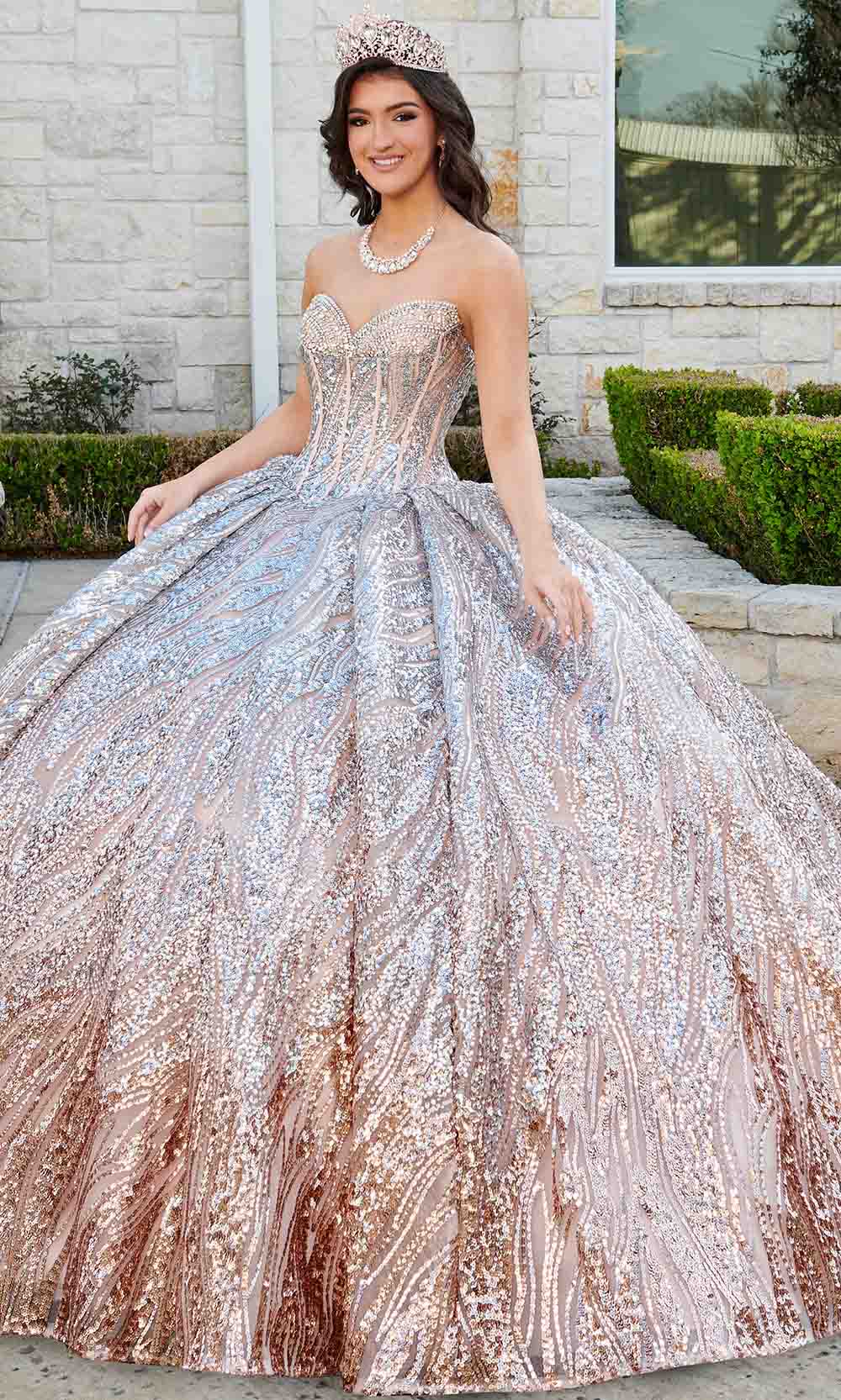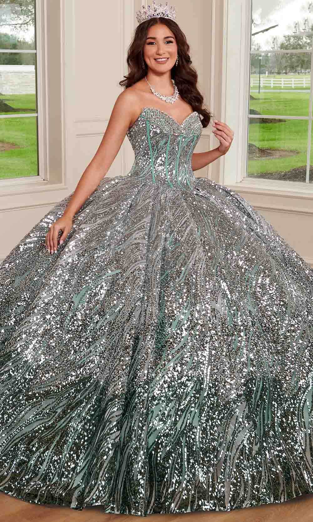 Radiate with unparalleled brilliance in the enchanting Rachel Allan RQ3121 Quinceanera creation. Illuminating the surroundings with its captivating sequin tulle silhouette, this ballgown flaunts a mesmerizing ombre effect on the voluminously rendered skirt. Crafted with a dazzling spectacle of beads and sequins that also grace the bodice, this stunner offers a modified sweetheart neckline on a strapless form. The fitted corset bodice showcases a timeless lace-up design. A matching bolero comes with this ensemble. Ensure a truly elegant appearance in this stunningly made Rachel Allan RQ3121 Quinceanera masterpiece. Models are wearing the Gold Black, Silver Champagne, and Silver Sage colors.