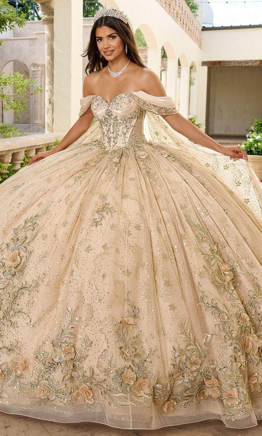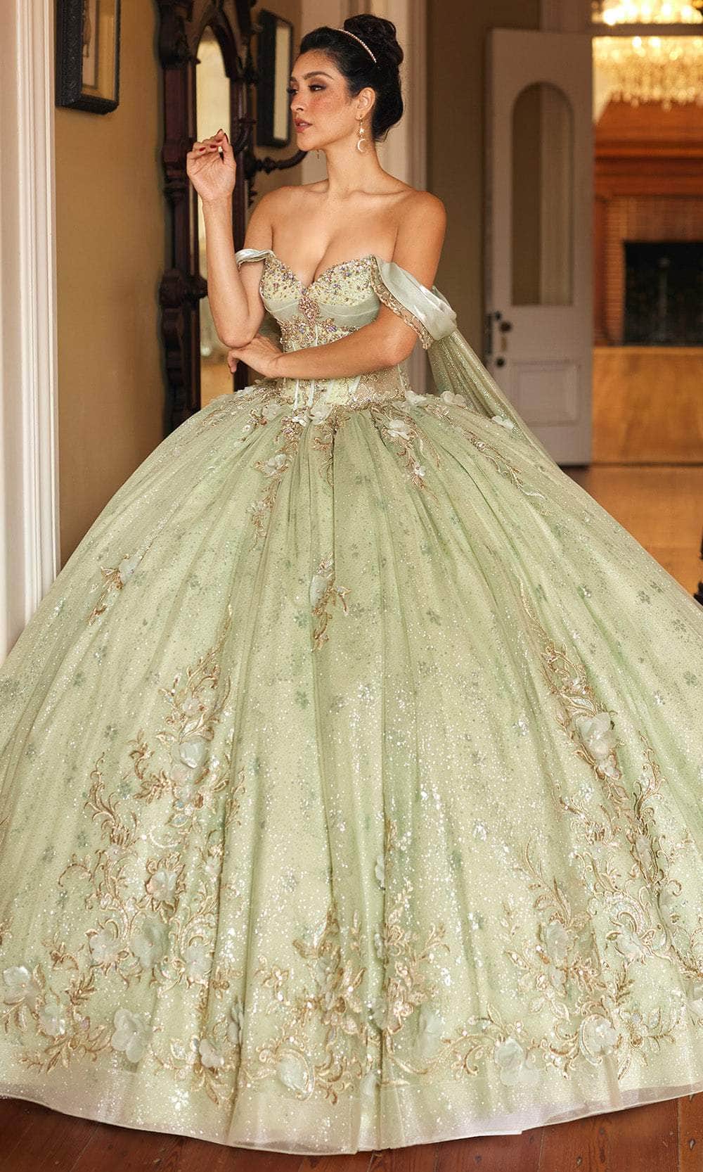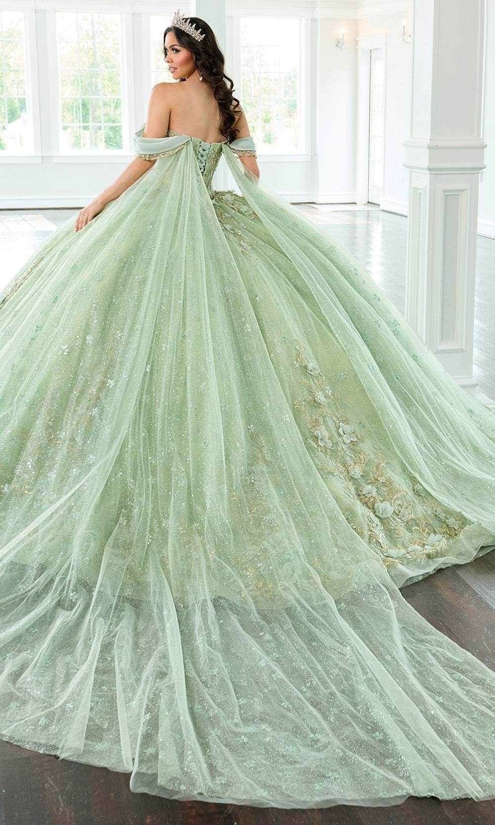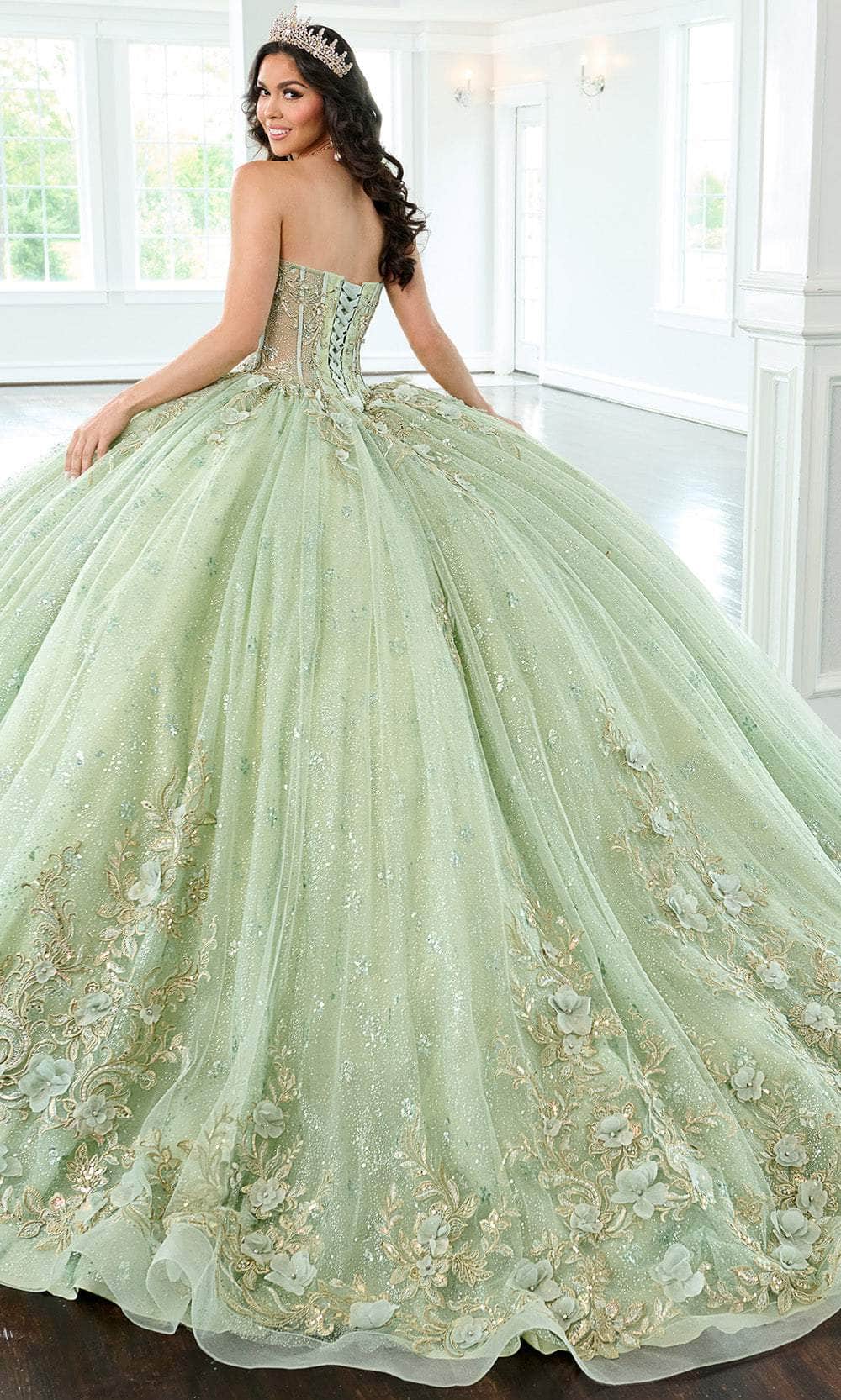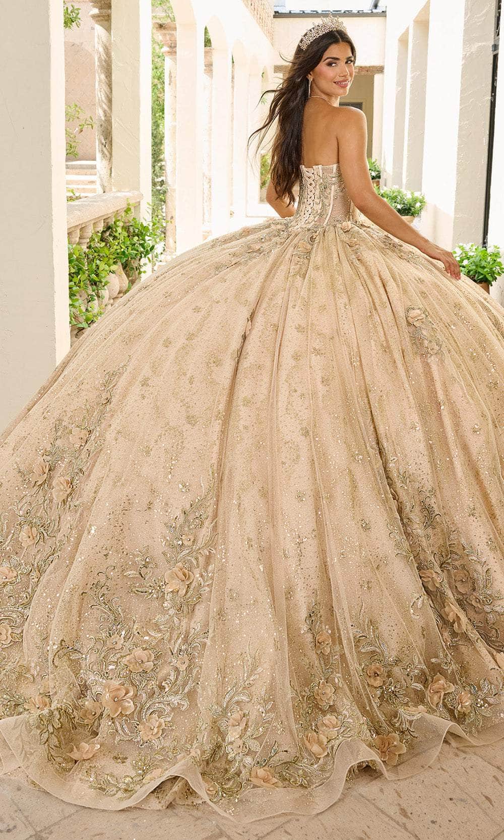 A true fairytale vision, the Rachel Allan RQ3146 masterpiece exudes romance with its glitter tulle fabric and cascading 3D floral appliques. The structured bodice is adorned with dazzling beadwork, while strapless design and sweetheart neckline add an ethereal touch. Flowing streamers extend from the detachable straps, creating an element of movement with every step. Completing the look is a detachable bow and bodice liner, giving you the option to customize your style. Walk into your dream celebration with the enchanting Rachel Allan RQ3146. Models are wearing Champagne Gold, and Sage Gold colors.
