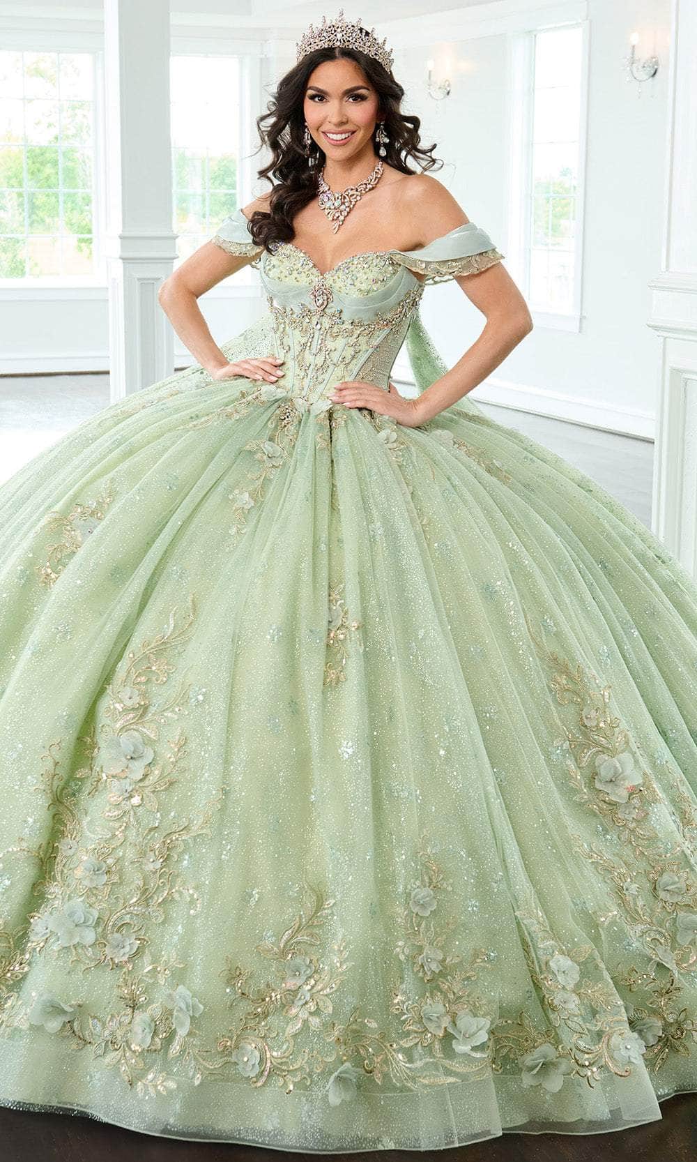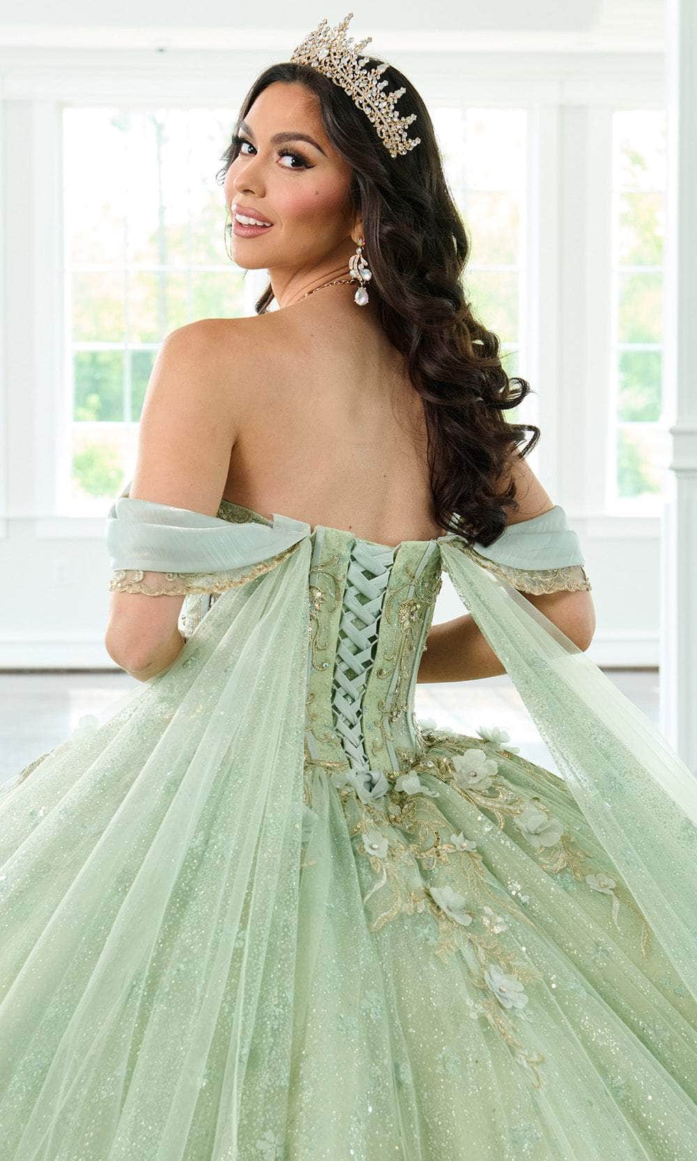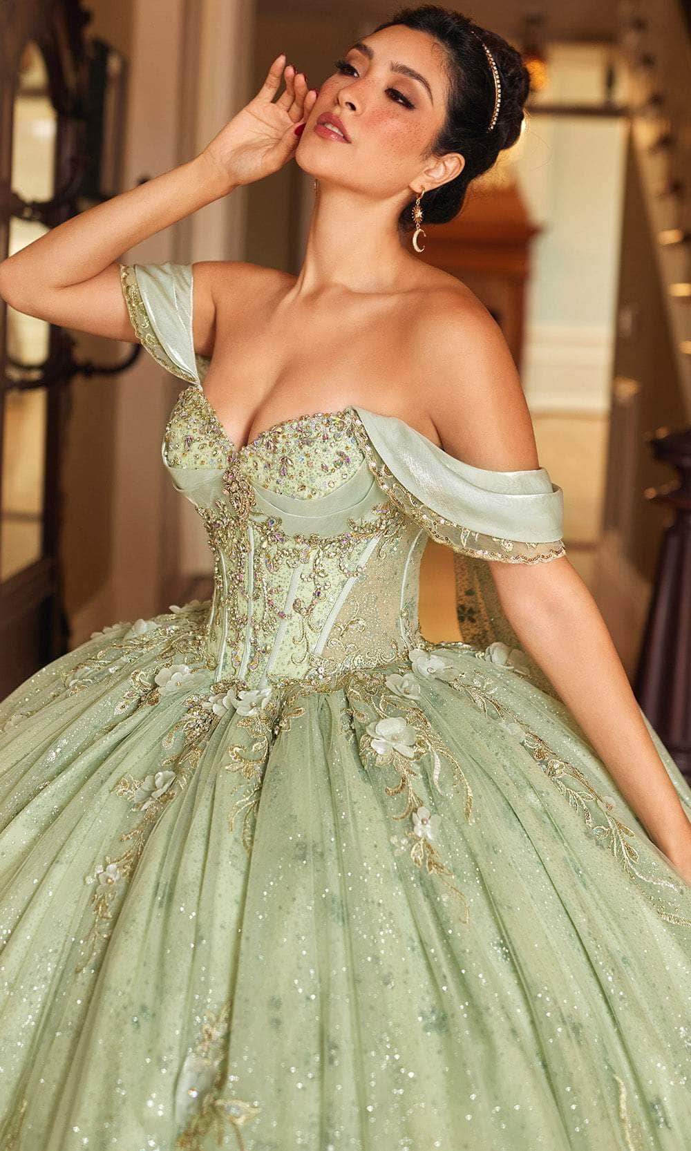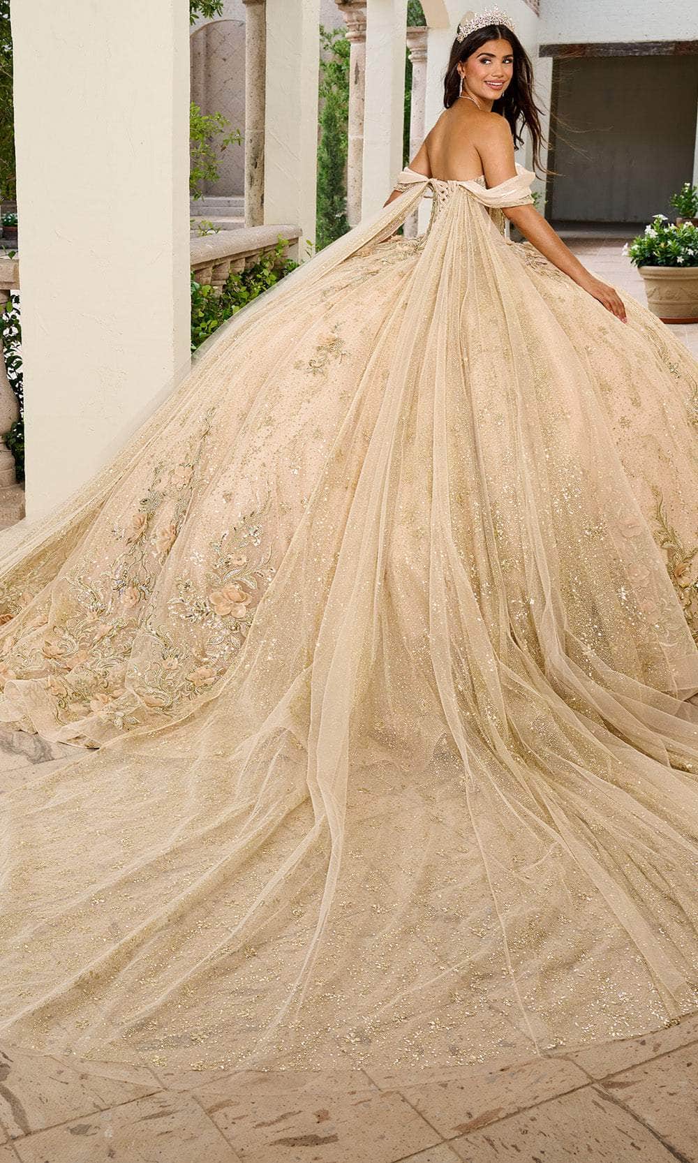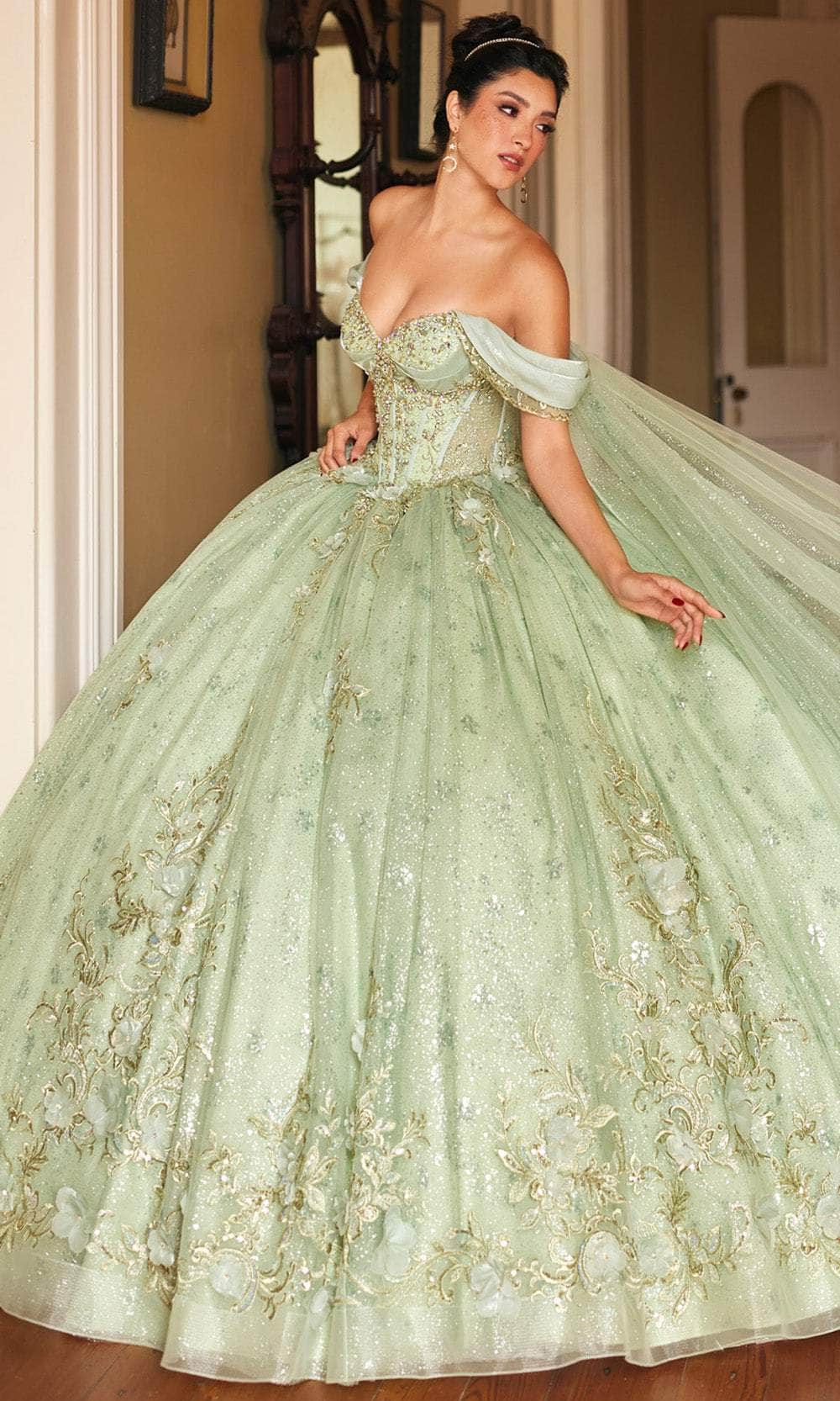 A true fairytale vision, the Rachel Allan RQ3146 masterpiece exudes romance with its glitter tulle fabric and cascading 3D floral appliques. The structured bodice is adorned with dazzling beadwork, while strapless design and sweetheart neckline add an ethereal touch. Flowing streamers extend from the detachable straps, creating an element of movement with every step. Completing the look is a detachable bow and bodice liner, giving you the option to customize your style. Walk into your dream celebration with the enchanting Rachel Allan RQ3146. Models are wearing Champagne Gold, and Sage Gold colors.