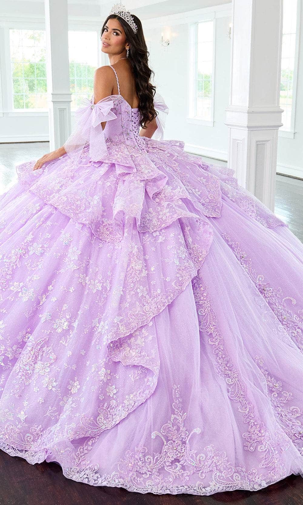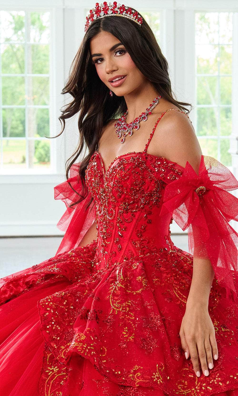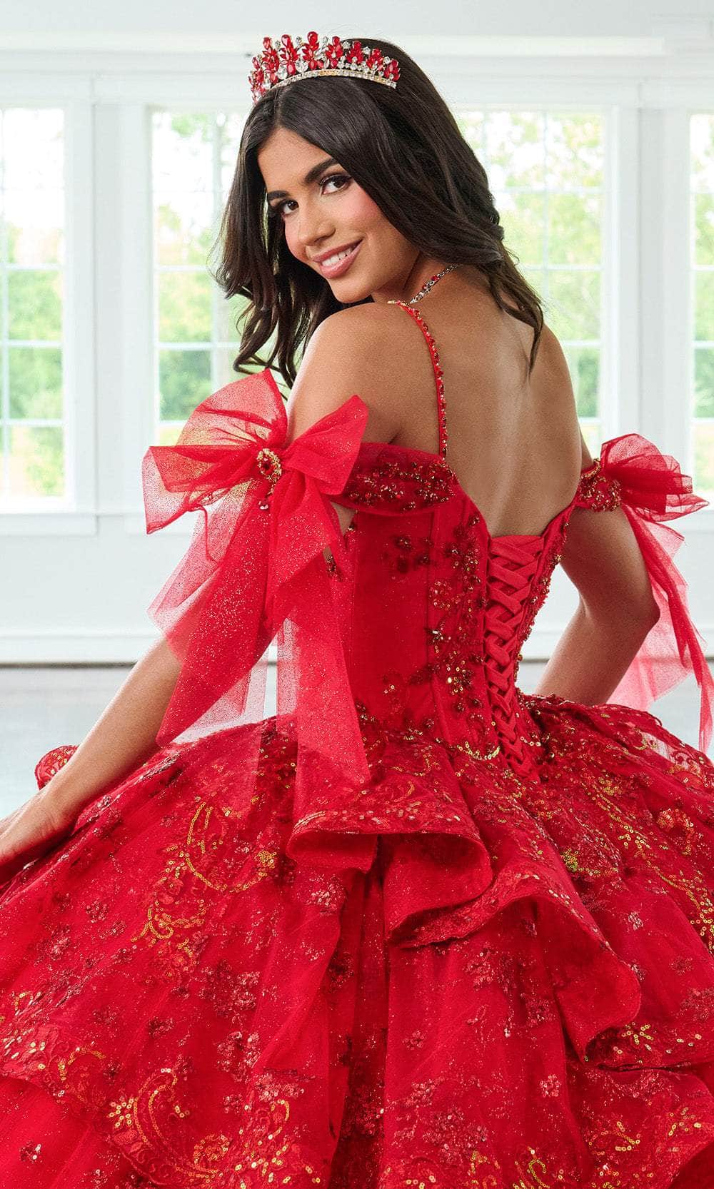 Step into a world of elegance with the Rachel Allan RQ3147, a show-stopping ballgown designed for the ultimate grand entrance. Crafted from luxurious glitter tulle, this gown features lace applique, sequin and beading that add a regal touch. The sweetheart neckline and fitted bodice provide a romantic silhouette, while the voluminous ballgown skirt ensures a majestic flow. The bow-tied off shoulder sleeves and spaghetti straps offer a charming detail, complementing the exquisite embellishments. Elevate your evening look with the Rachel Allan RQ3147, a gown that defines sophistication and grandeur. Models are wearing Red, and Lilac colors.
