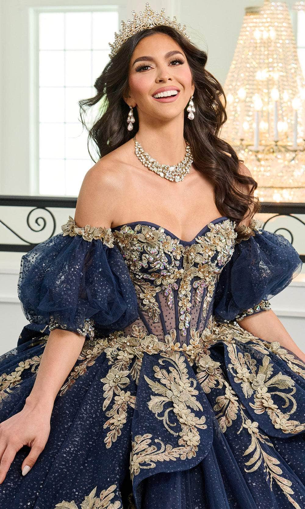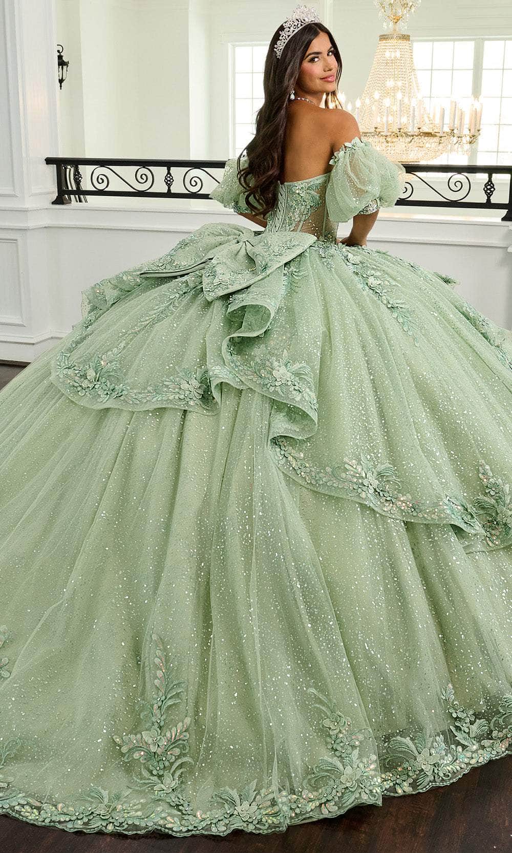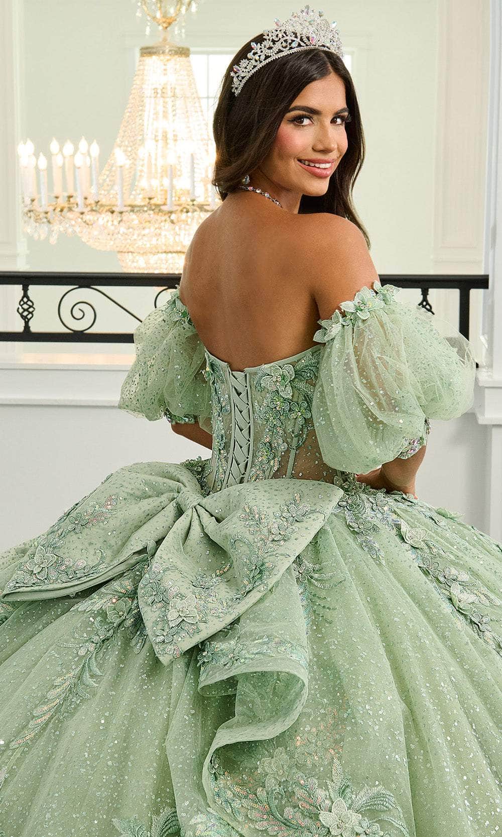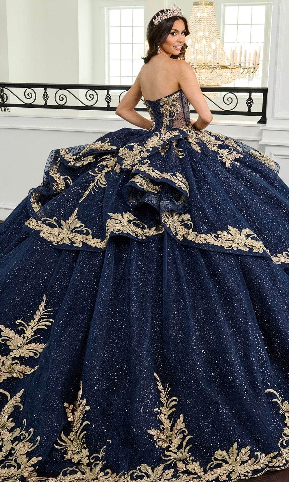 Elegance meets drama in Rachel Allan RQ3153, a ballgown that is nothing short of breathtaking. The rich layers of glitter tulle create a show-stopping silhouette, while metallic embroidery, beaded and 3D floral appliques add a luxurious touch. The strapless, sweetheart neckline and illusion corset bodice ensures a refined aesthetic, complemented by detachable puff sleeves and a beautifully structured bow at the back for a hint of grandeur. This Rachel Allan RQ3153 gown offers the perfect blend of classic beauty and modern flair, making it an unforgettable choice for any grand occasion. Models are wearing Navy Gold, and Sage colors.