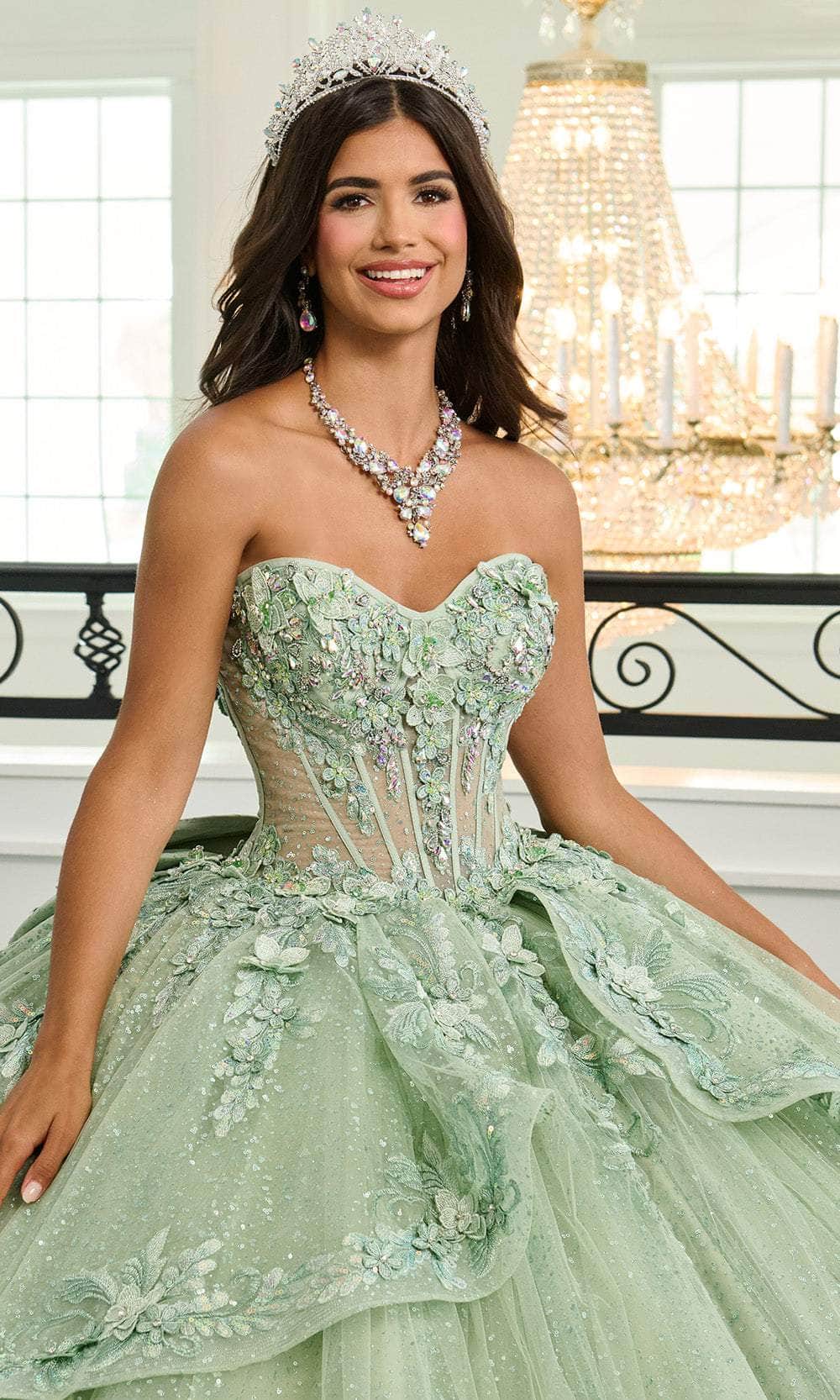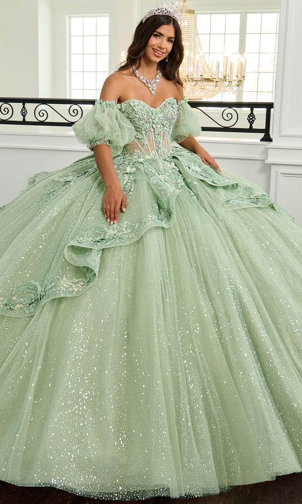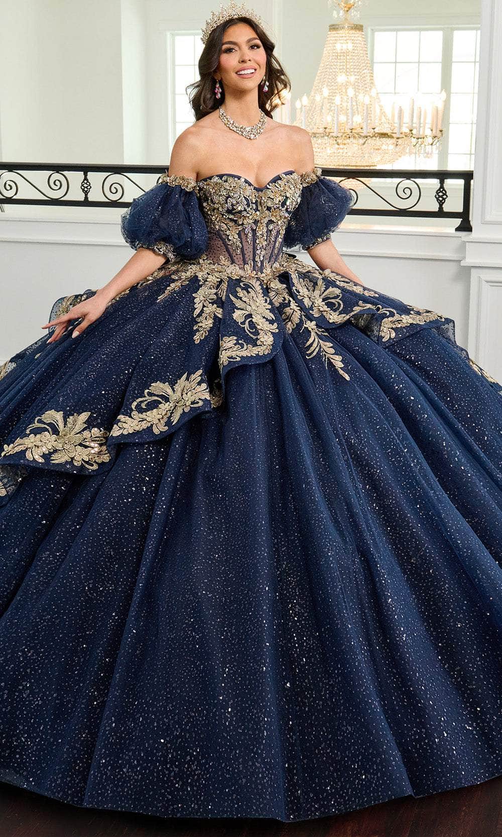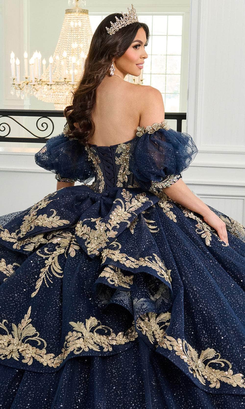 Elegance meets drama in Rachel Allan RQ3153, a ballgown that is nothing short of breathtaking. The rich layers of glitter tulle create a show-stopping silhouette, while metallic embroidery, beaded and 3D floral appliques add a luxurious touch. The strapless, sweetheart neckline and illusion corset bodice ensures a refined aesthetic, complemented by detachable puff sleeves and a beautifully structured bow at the back for a hint of grandeur. This Rachel Allan RQ3153 gown offers the perfect blend of classic beauty and modern flair, making it an unforgettable choice for any grand occasion. Models are wearing Navy Gold, and Sage colors.