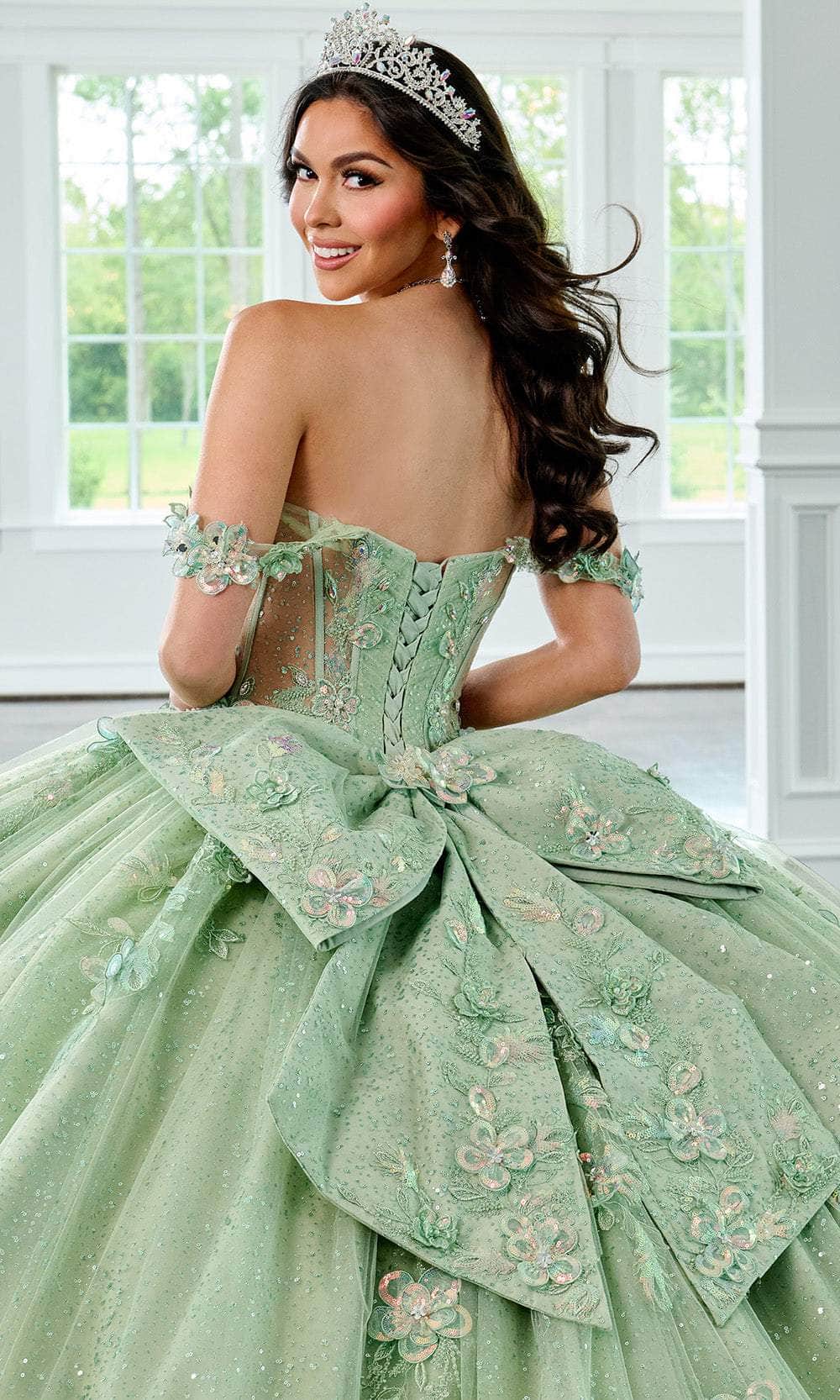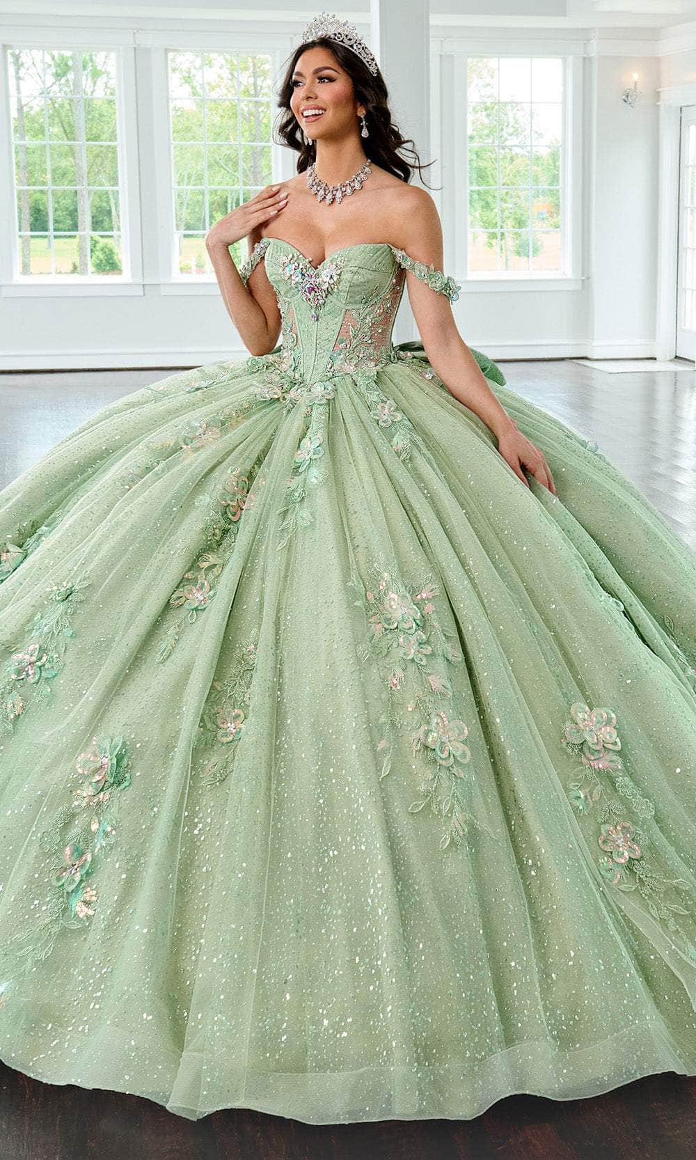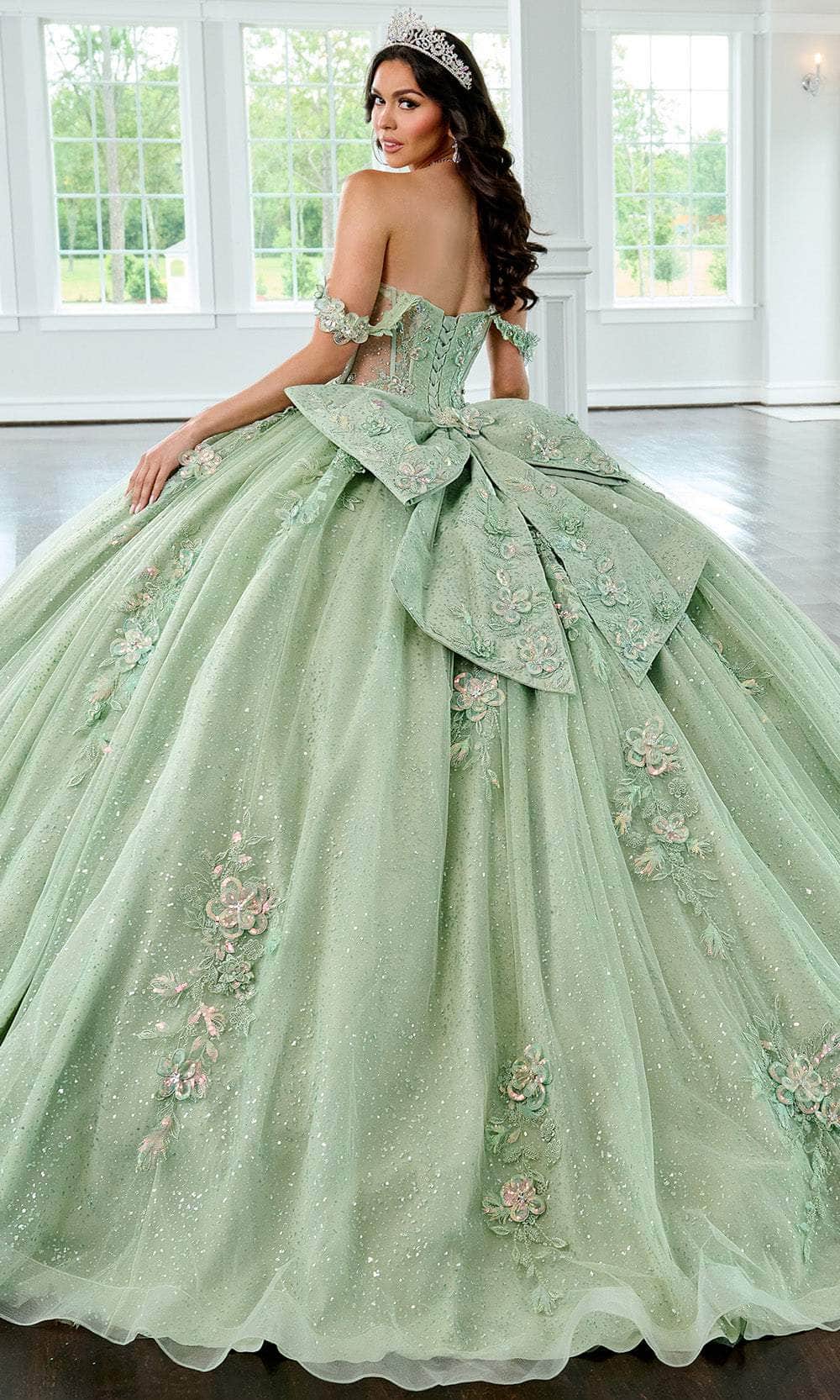 Step into the limelight with the magnificent Rachel Allan RQ3154 ballgown, designed for a fairy-tale-worthy moment. The sweetheart neckline and detachable off-the-shoulder sleeves bring a touch of romance, while the beaded, embroidery and 3D floral appliques gracefully adorns the glittering tulle fabric. A detachable bow adds a striking statement to the back, and the removable bodice liner allows for a customized fit. Whether styled for regal sophistication or a modern touch, this Rachel Allan RQ3154 masterpiece is a breathtaking choice for a truly grand event. Models are wearing Blush, and Sage colors.